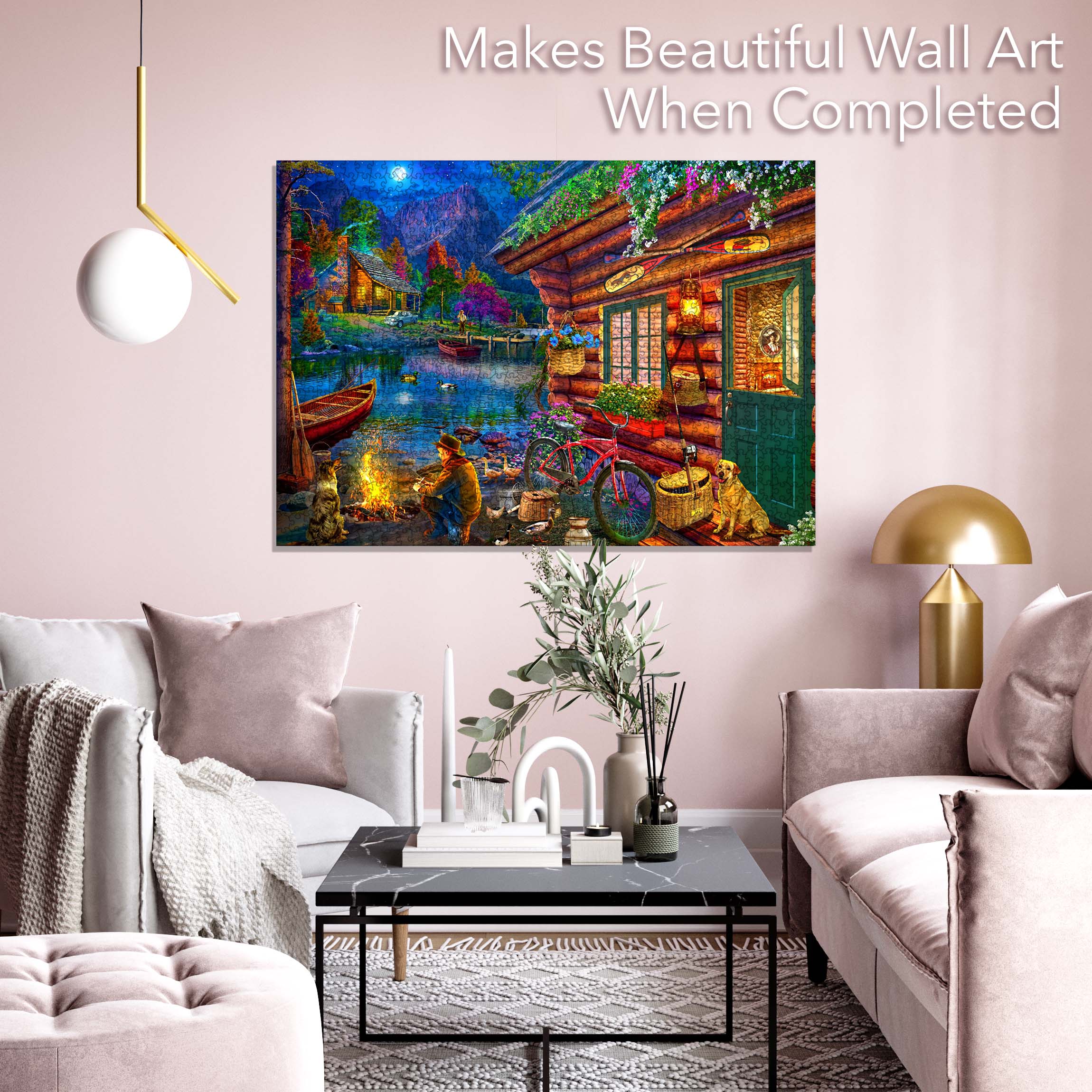 Experience the joy of assembling a beautiful Camping Jigsaw Puzzle with 1000 pieces that captures the essence of outdoor adventures. This puzzle features a serene illustration of a man and his dog enjoying a peaceful moment by the riverside, evoking fond memories of camping trips and nature's tranquility. Perfect for puzzle enthusiasts and nature lovers alike, this jigsaw puzzle not only provides hours of entertainment but also serves as a delightful piece of art once completed.