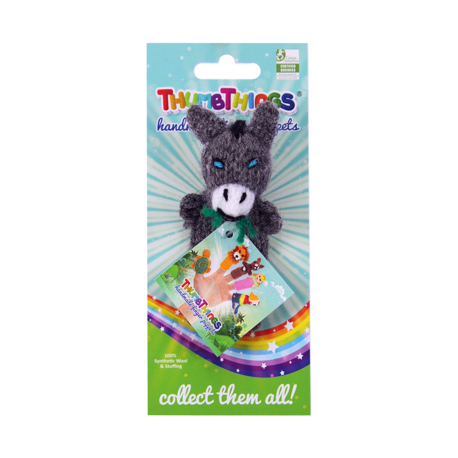 Our Donkey finger puppet is certified by Green America and adheres to fair trade principles. It is made from 100% nylon yarn and polyfill stuffing, ensuring that all materials are new and safe for children aged 3 and up. To maintain the quality of your puppet, we recommend gentle hand washing and avoiding machine drying.