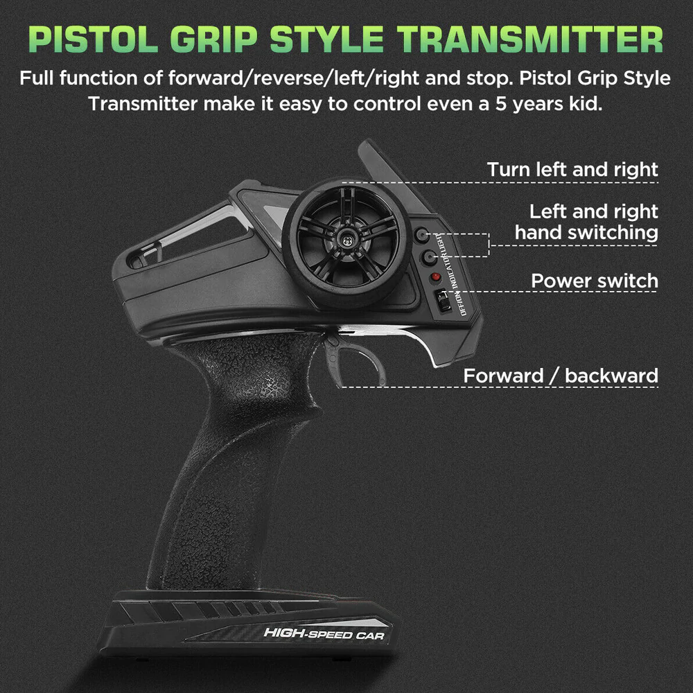 Safety is a priority with the Dragon Fighter. Its four wheels are constructed from spring material, providing excellent shock absorption and stability during high-speed runs. This feature not only enhances performance but also ensures that the car remains intact during rough play. Additionally, the front wheel direction adjustment pointer allows for manual calibration, ensuring optimal performance over time.