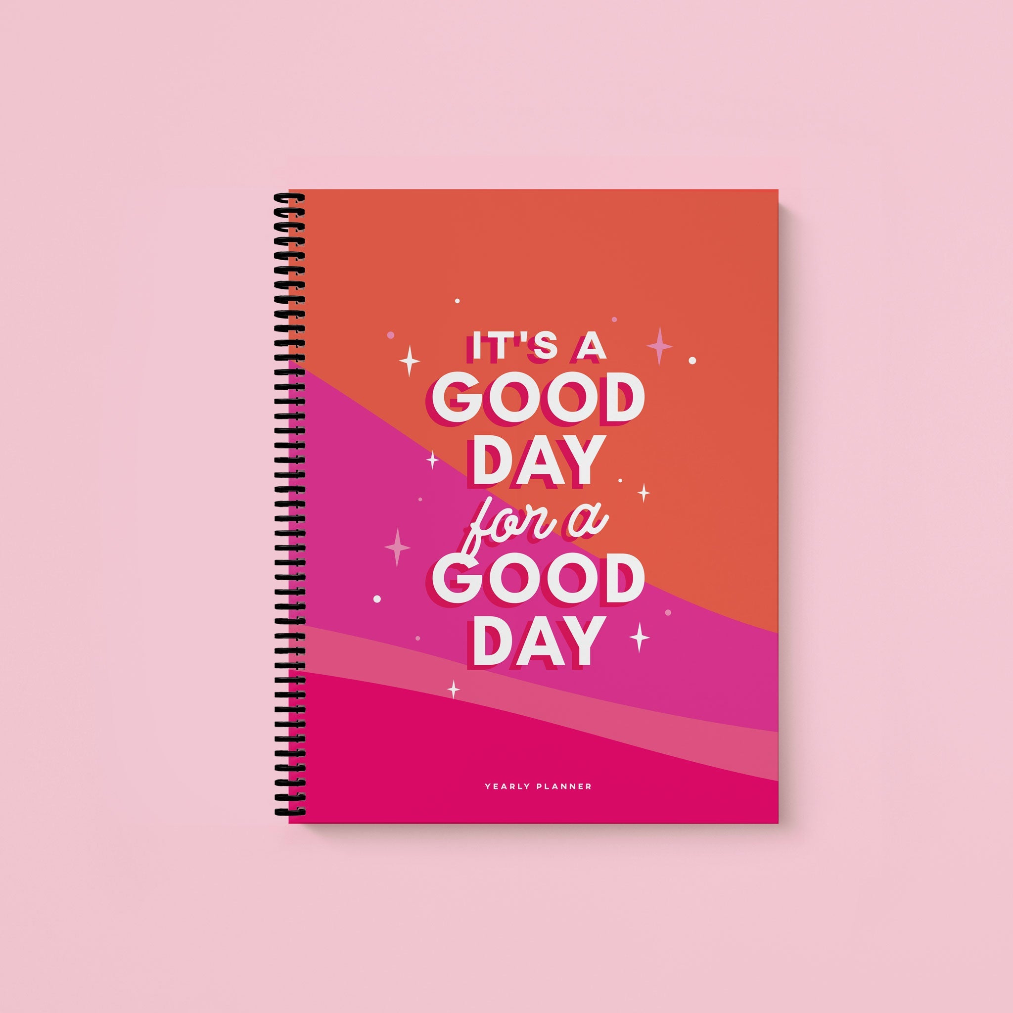 It's a Good Day Planner featuring a stylish cover, monthly and weekly layouts, and inspirational quotes, perfect for goal-oriented individuals.