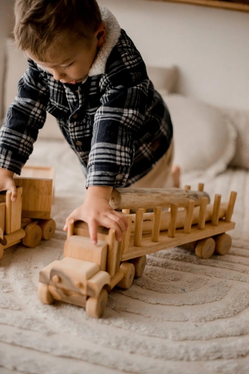 Among the series of handcrafted wooden trucks is this gorgeous log truck. This truck features a detachable head and a trailer full of logs. The truck is finished with natural vegetable oil, with minimal chemicals involved. All Qtoys are made of plantation timber using non toxic materials.