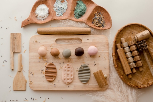A wooden play dough set is a classic and timeless toy for young children. Made from sustainably sourced wood, this play set features a collection of rolling pins, stamps, and other tools designed to be used with play dough. The wooden tools provide a tactile and sensory experience, and promote imaginative and creative play as children explore, create, and mold their play dough creations. The set also helps develop fine motor skills and hand-eye coordination, as children grip, roll, and manipulate the wooden tools. Whether using play dough to create shapes, textures, or characters, the wooden play dough set provides endless hours of imaginative and educational play opportunities. This play set is ideal for solo play or for use with friends, and is perfect for indoor play and educational purposes.
