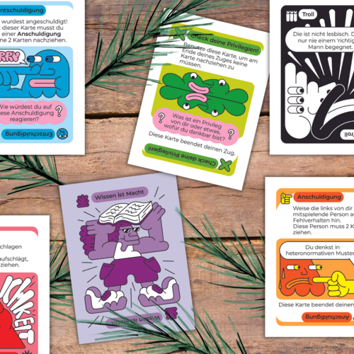 Ziel des Spiels ist es, unsensible Trolle zu bekämpfen und als Ally auf vielfältige Art und Weise die queere Community zu unterstützen. Dabei greift jede Karte einen wichtigen Aspekt des Ally-Seins auf. Du übst unsensible Aussagen von Trollen schlagfertig zu kontern oder dir eigene Fehler ein zu gestehen, kannst neue Dinge über die queere Community lernen und eigene Privilegien reflektieren. Das Spiel lädt zum Diskutieren und Nachdenken ein, aber sorgt auch für jede Menge Spaß. Zum Beispiel, wenn alle ganz schnell das Patriarchat zerschlagen müssen!