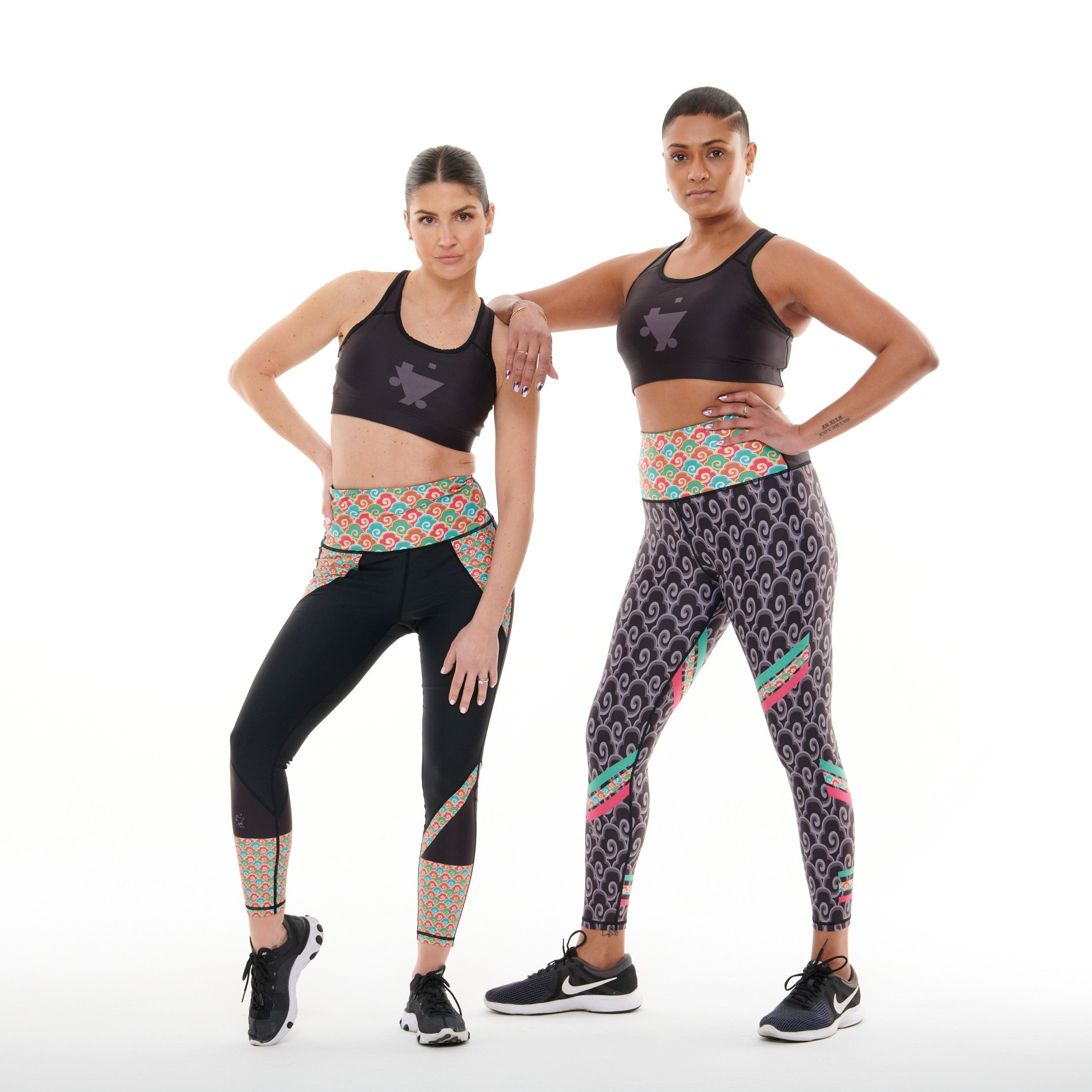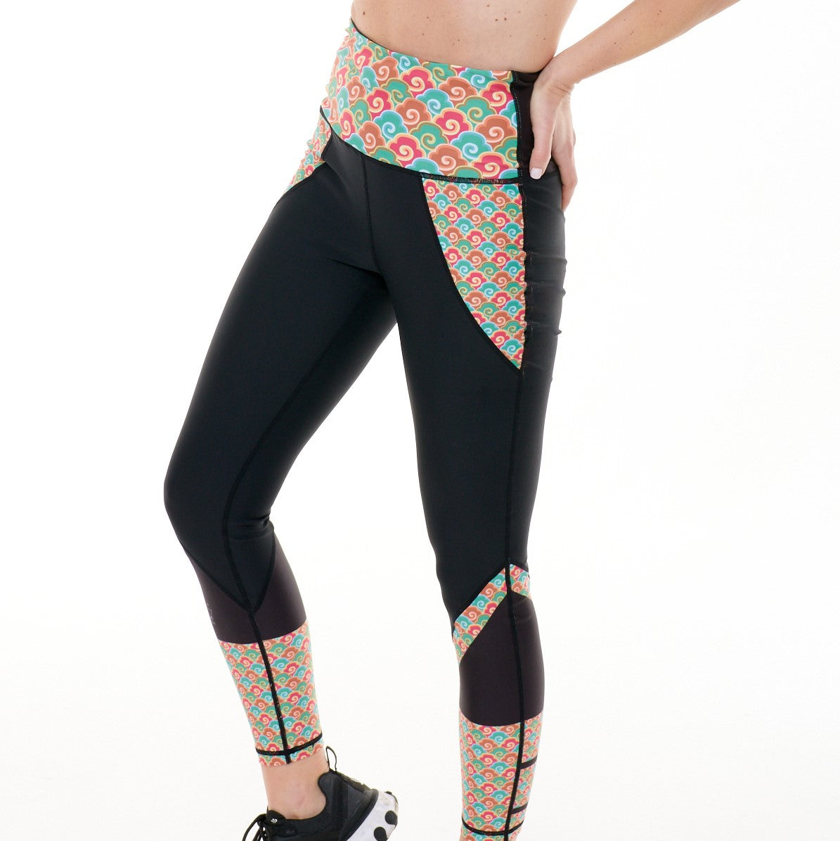 TYNA Heading East Butiful Leggings featuring bold colors and an Oriental-inspired watercolor print.