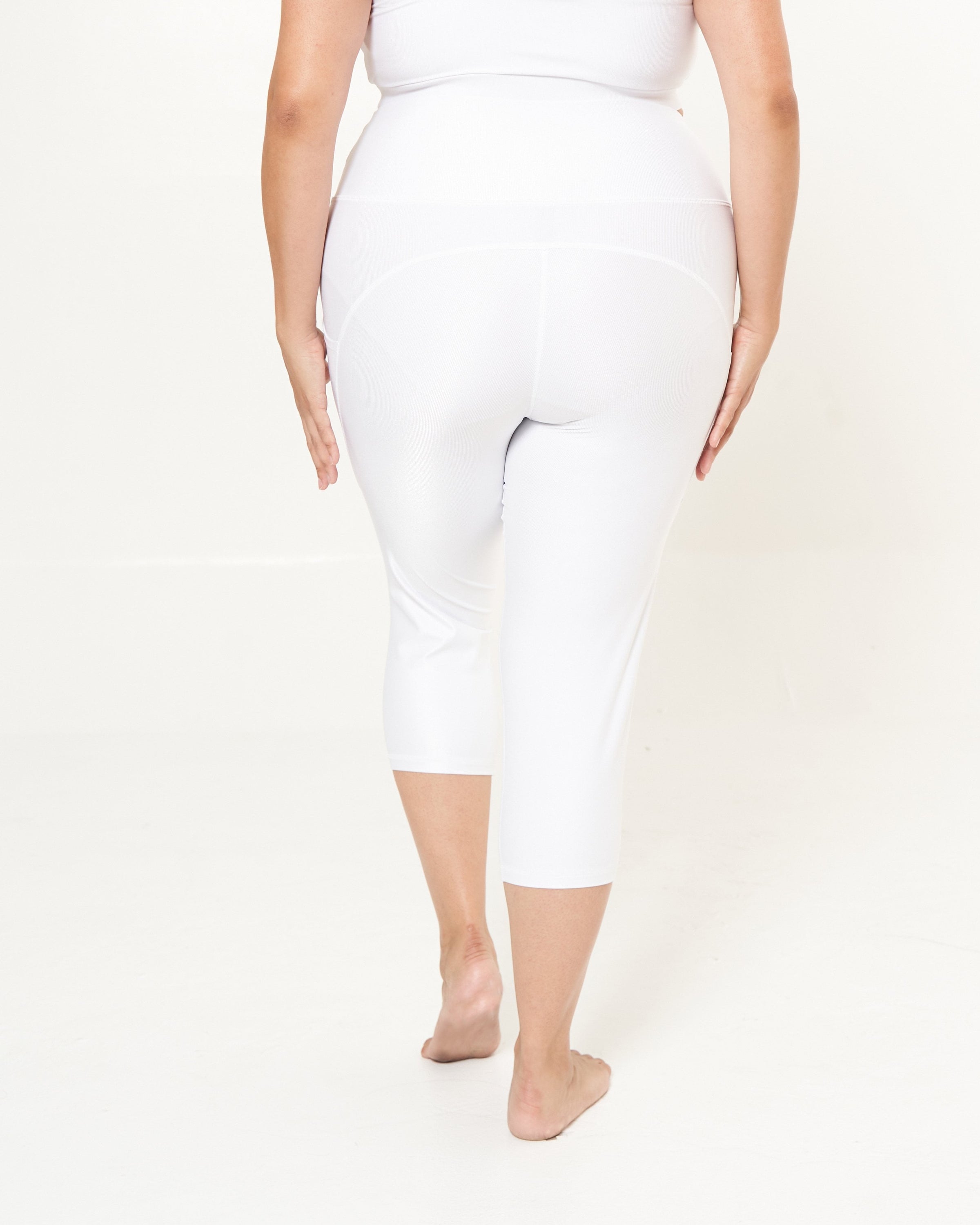 Hi-Rise Curved-Pocket Capri in white rib pattern, featuring a high-rise waist and curved pockets for smartphone storage.