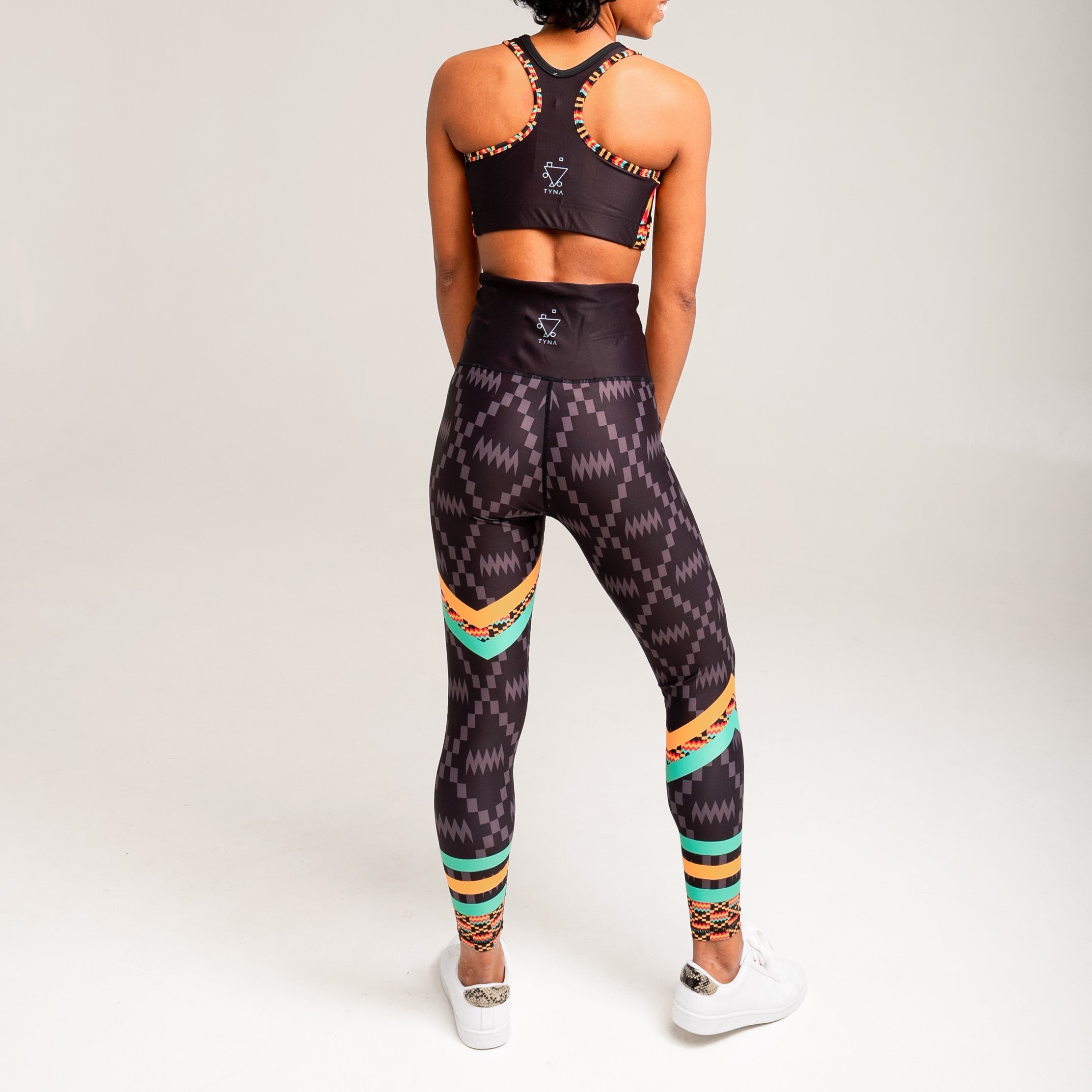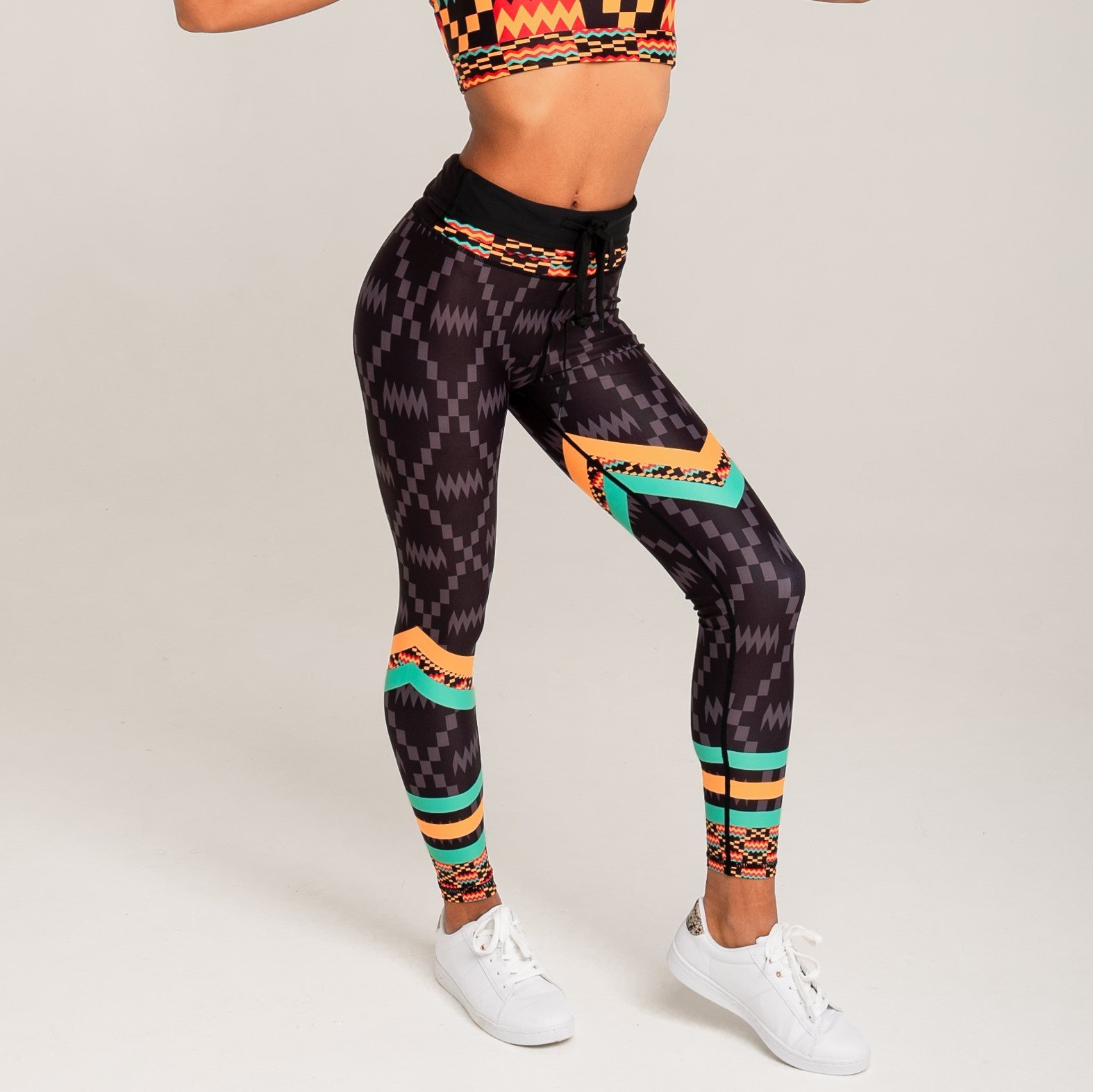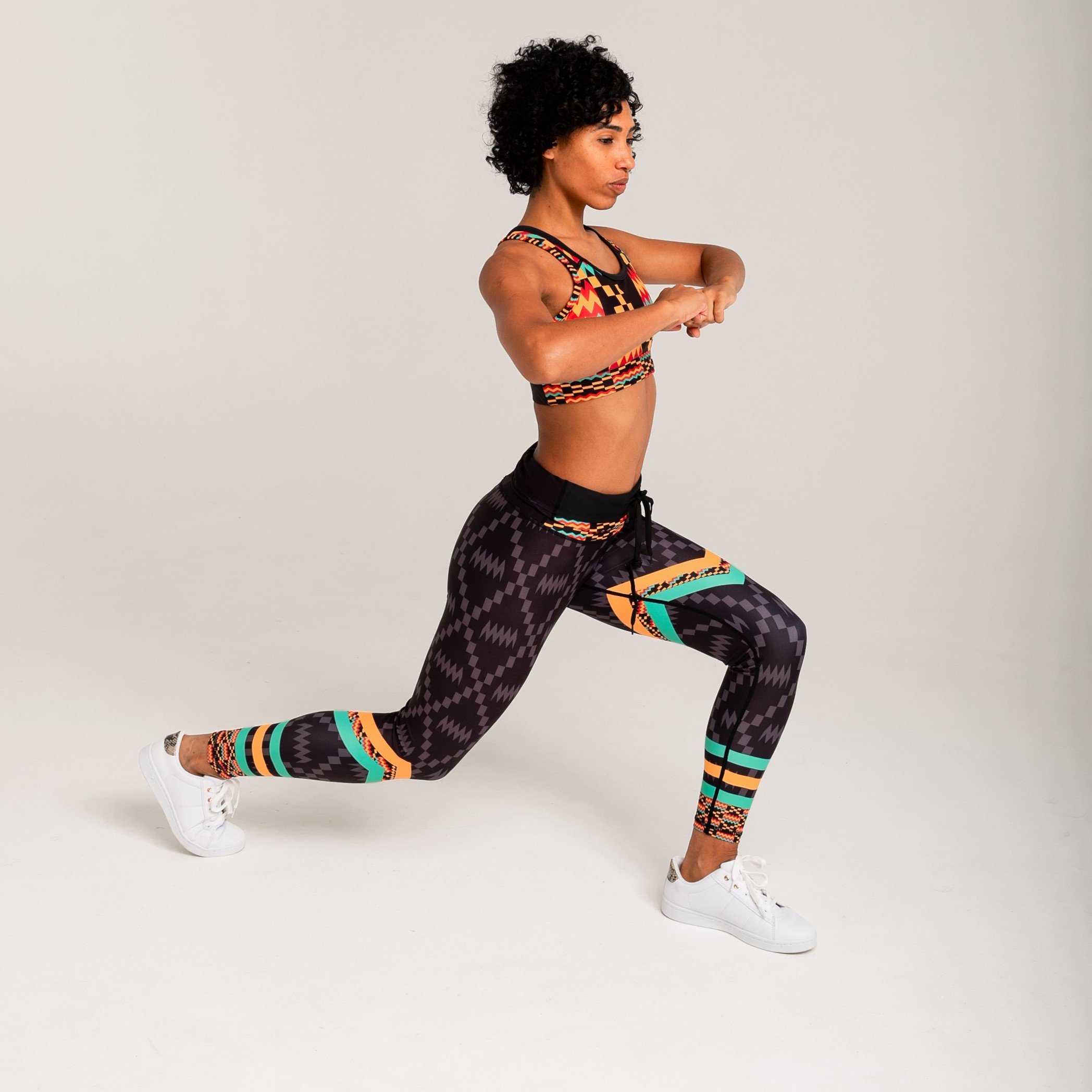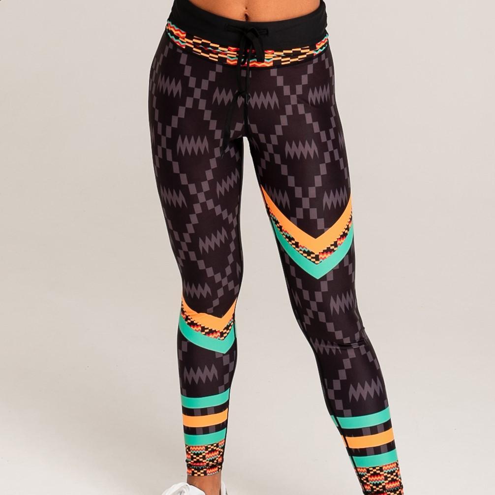 Introducing the Kayentee Splash Leggings, a perfect blend of style, comfort, and functionality. These leggings are designed to make a statement with their vibrant Kayentee pattern, inspired by the traditional Kente cloth of the Ashanti people of Ghana. The unique geometric design features colorful chevrons that not only add visual interest but also create a sense of dynamic movement, making them ideal for both workouts and casual outings. The colors used in the leggings—black, fresh green, saffron, and flame—are not just aesthetically pleasing; they also carry deep meanings of spirituality, beauty, and healing, allowing the wearer to feel empowered and connected to their roots.