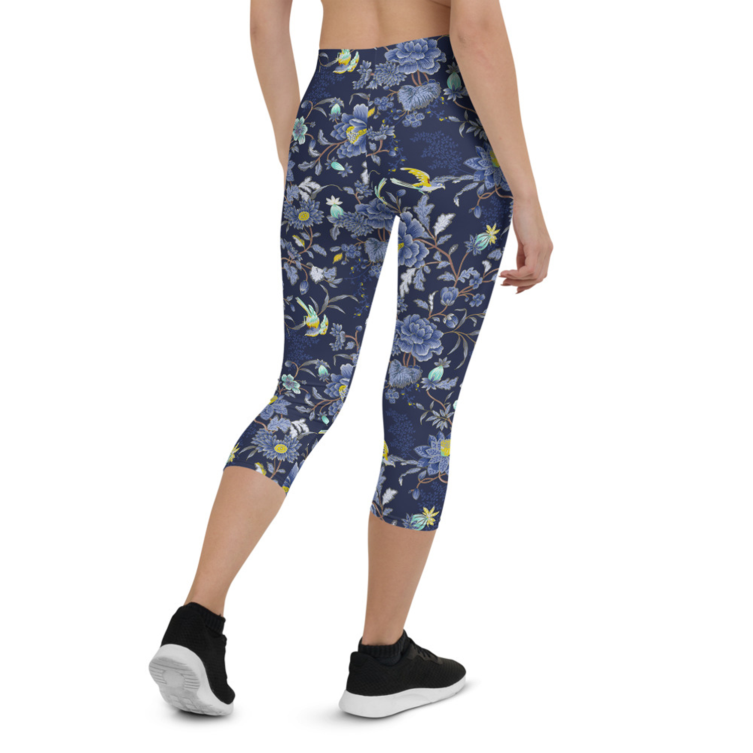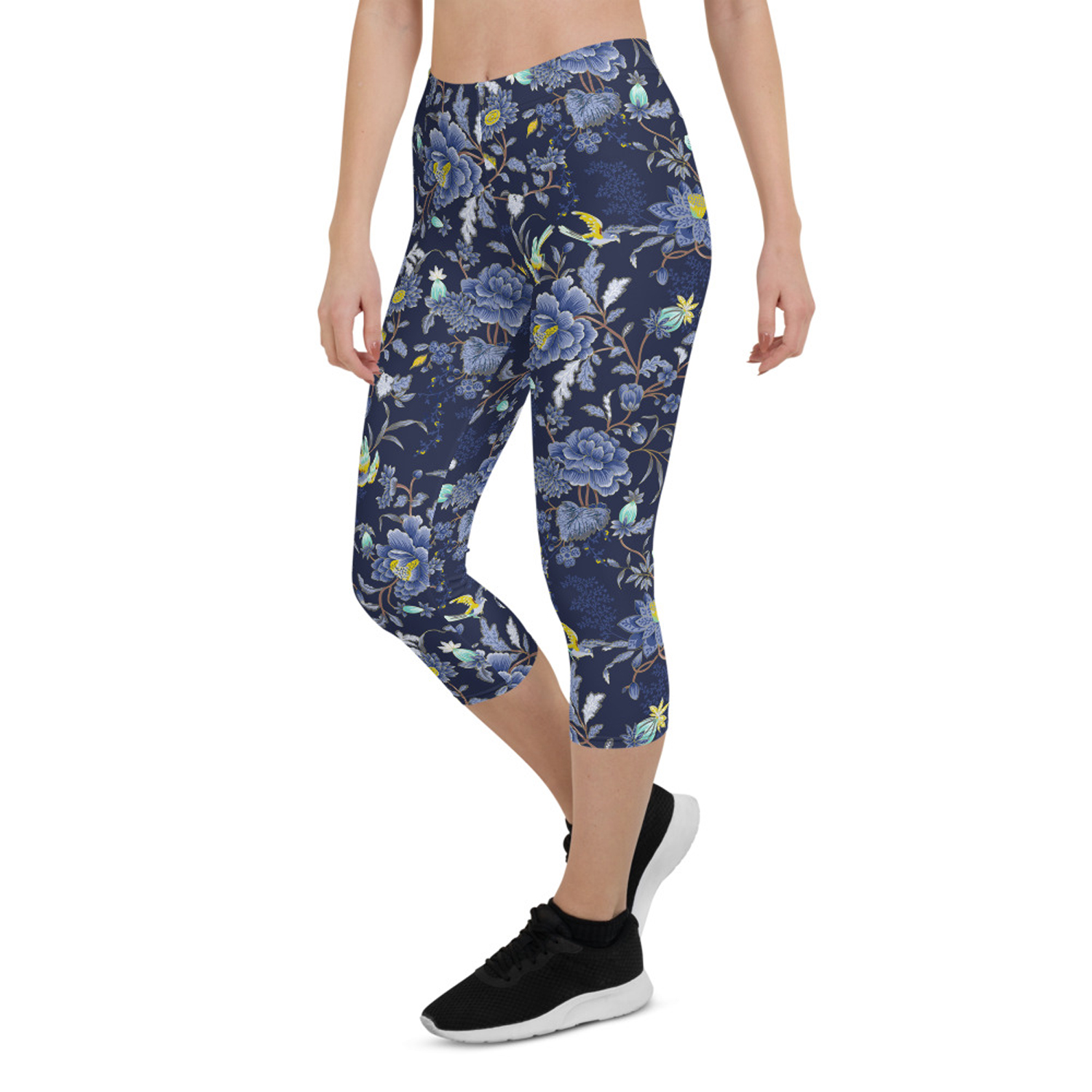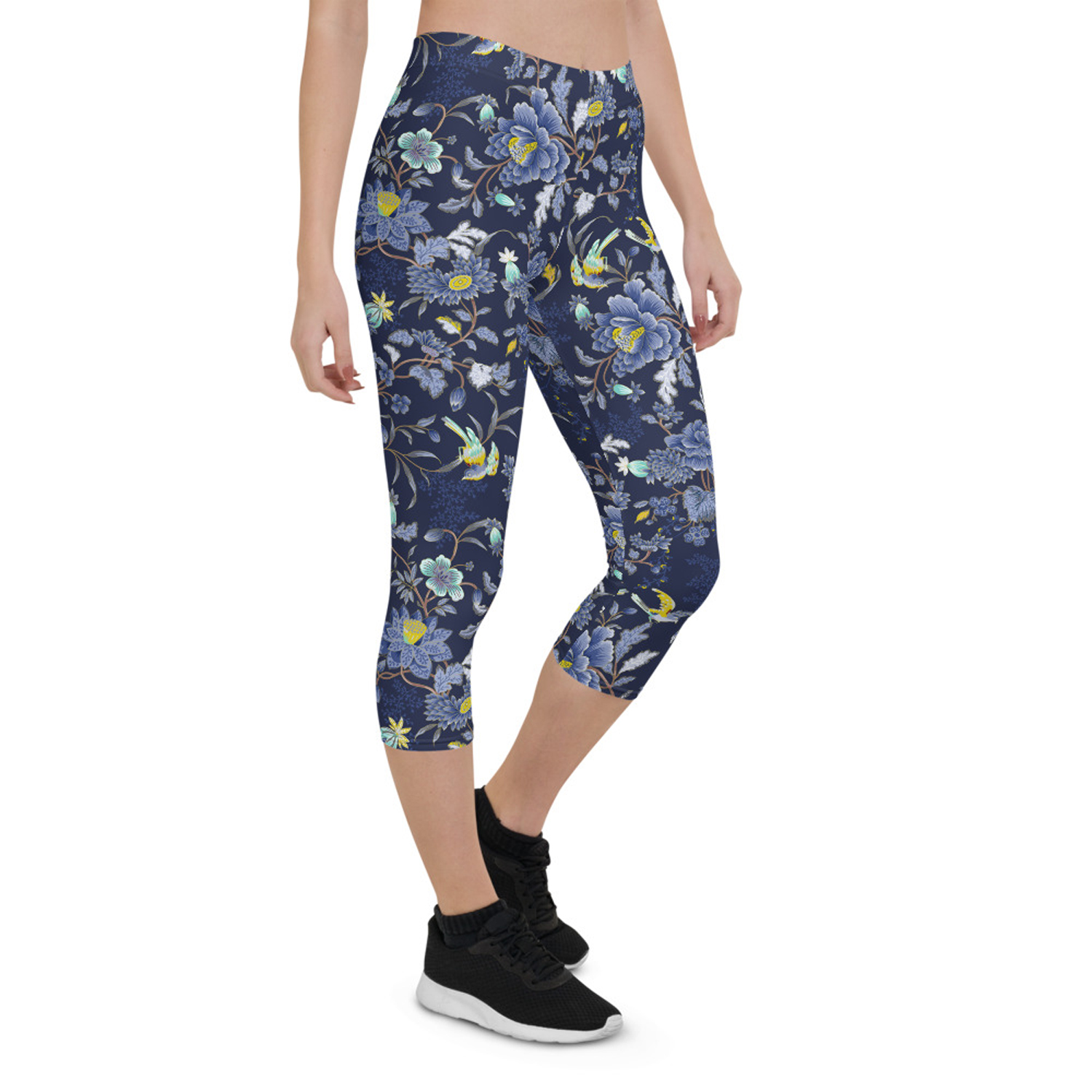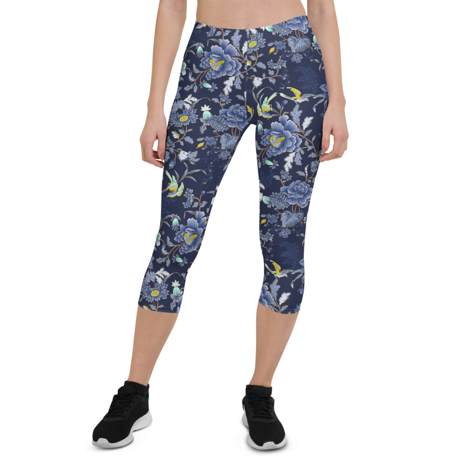 Introducing our stunning Oriental Floral Capri Leggings on Navy Blue, designed for women who value both performance and style. These premium leggings are crafted with a unique floral pattern that stands out, making them a fashionable choice for any workout or casual outing. The navy blue background enhances the vibrant colors of the floral design, ensuring you turn heads wherever you go.