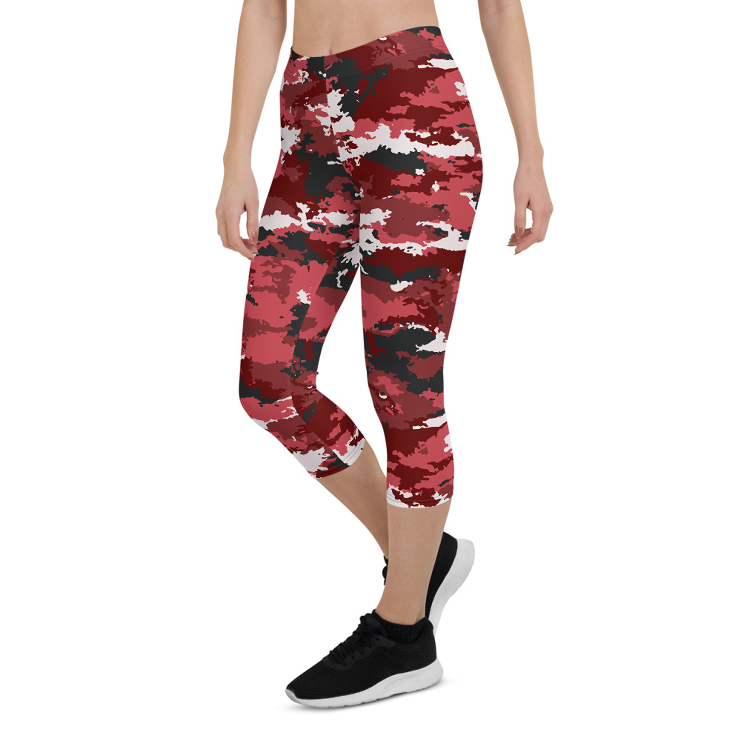 A pair of women's red camo capri leggings featuring a unique graphic design, made from a high-performance fabric blend for comfort and flexibility.