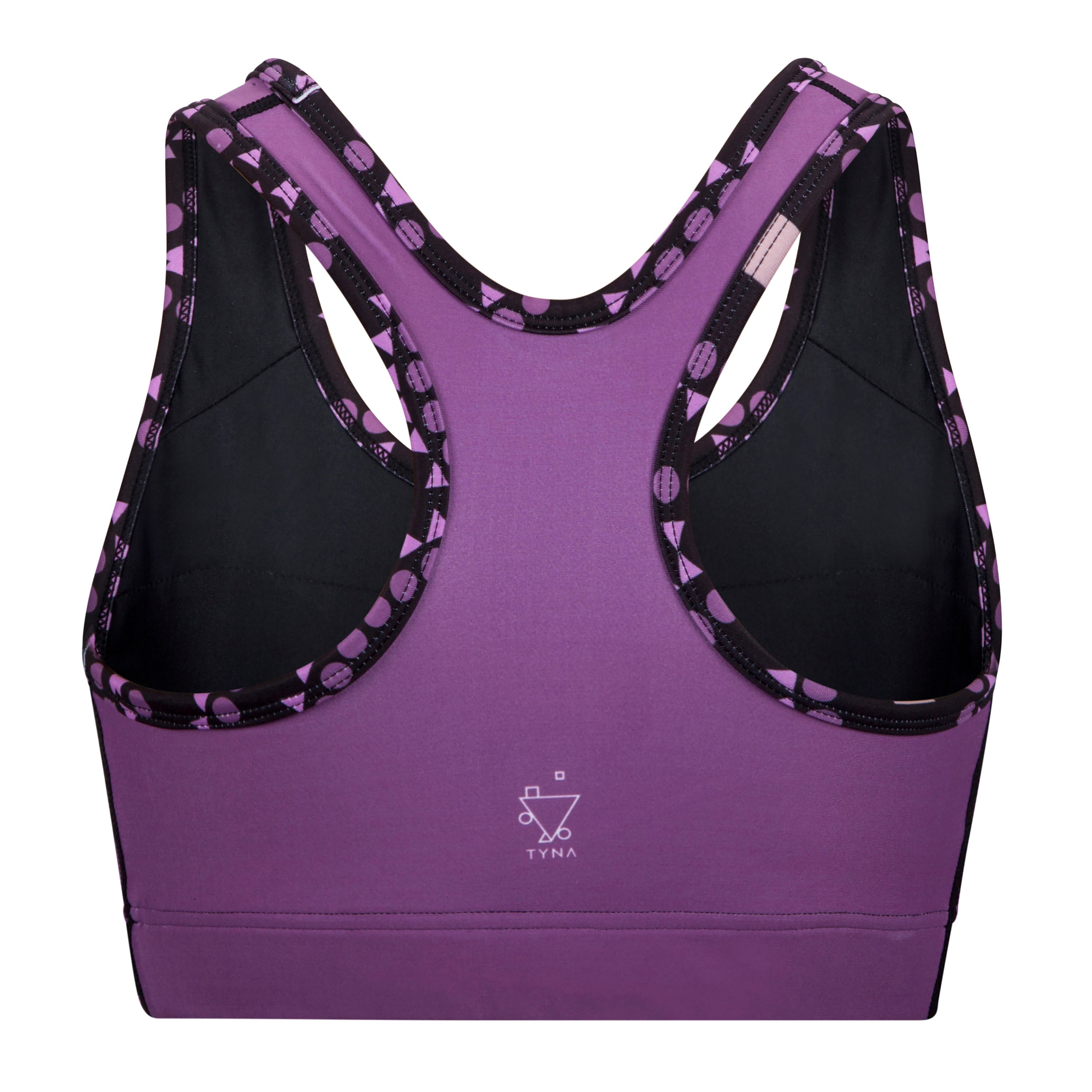 The Signature On Purple Funky/Splash Sports Bra is designed for those who seek both style and functionality in their workout gear. This racer-back sports bra not only provides the support you need during your workouts but also showcases a unique design that stands out. The TYNA Signature Print is inspired by the fundamental shapes of the TYNA logo: Triangle, Square, and Circle. These shapes are not only visually appealing but also represent the foundation of many ethnic prints from around the globe.