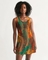 The standout feature of this dress is its eye-catching geometric print, which combines beautiful shades of orange, brown, green, and black. This striking design not only makes a fashion statement but also adds a personalized touch to your look. Whether you're heading to work, school, or a special event, this dress is sure to turn heads.