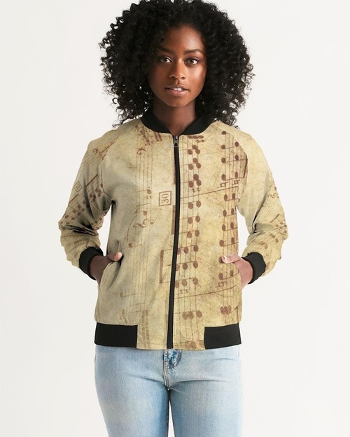 Womens Bomber Jacket with Musical Notes design, featuring ribbed cuffs and collar, metal zip closure, and welt pockets.