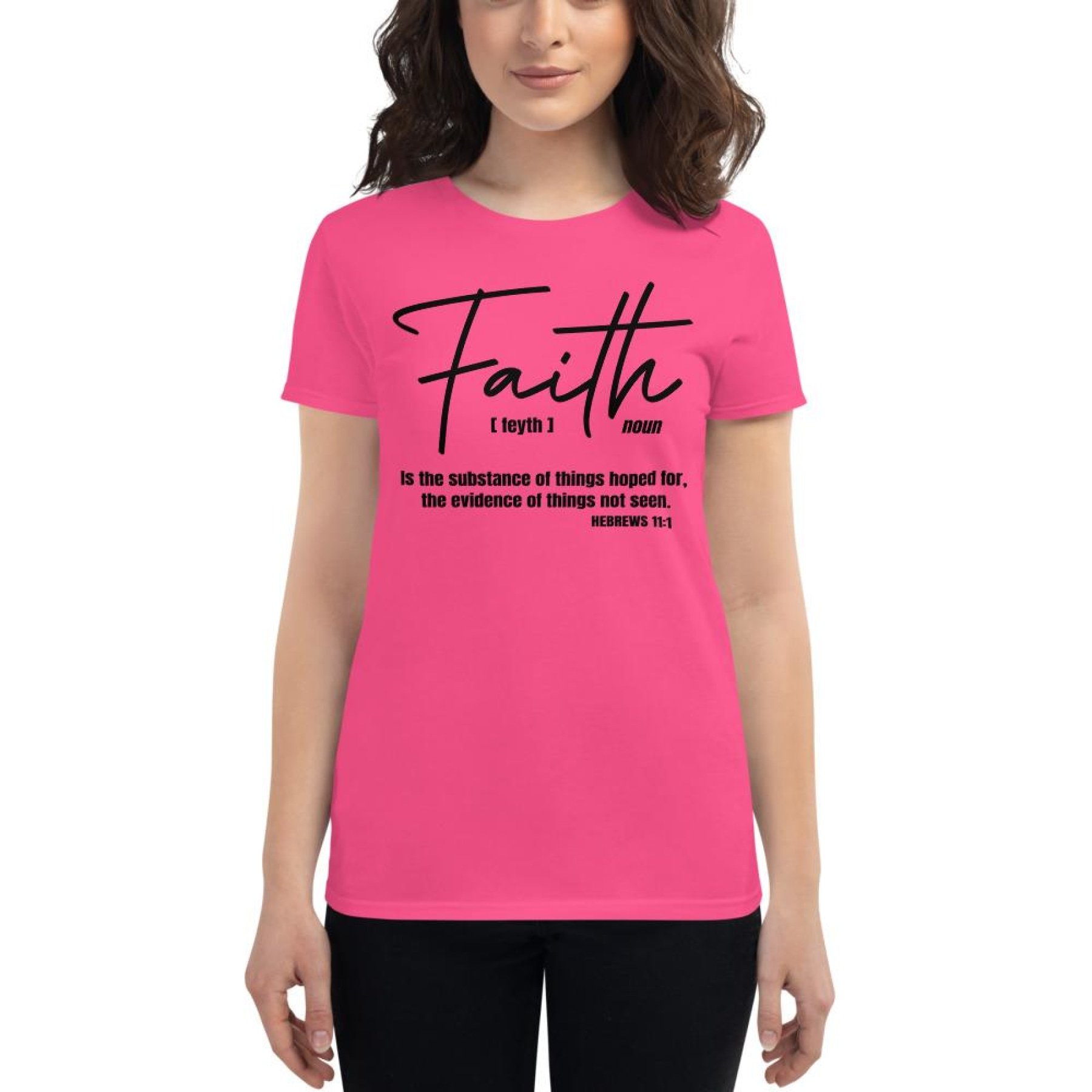 Introducing our Women's T-Shirt, emblazoned with the inspiring phrase 'Faith Is The Substance Of Things Hoped For' in a sleek black design. This graphic tee is not just a piece of clothing; it's a statement of belief and positivity that you can wear proudly. Made from 100% cotton, this t-shirt offers exceptional comfort and breathability, making it an ideal choice for everyday wear.