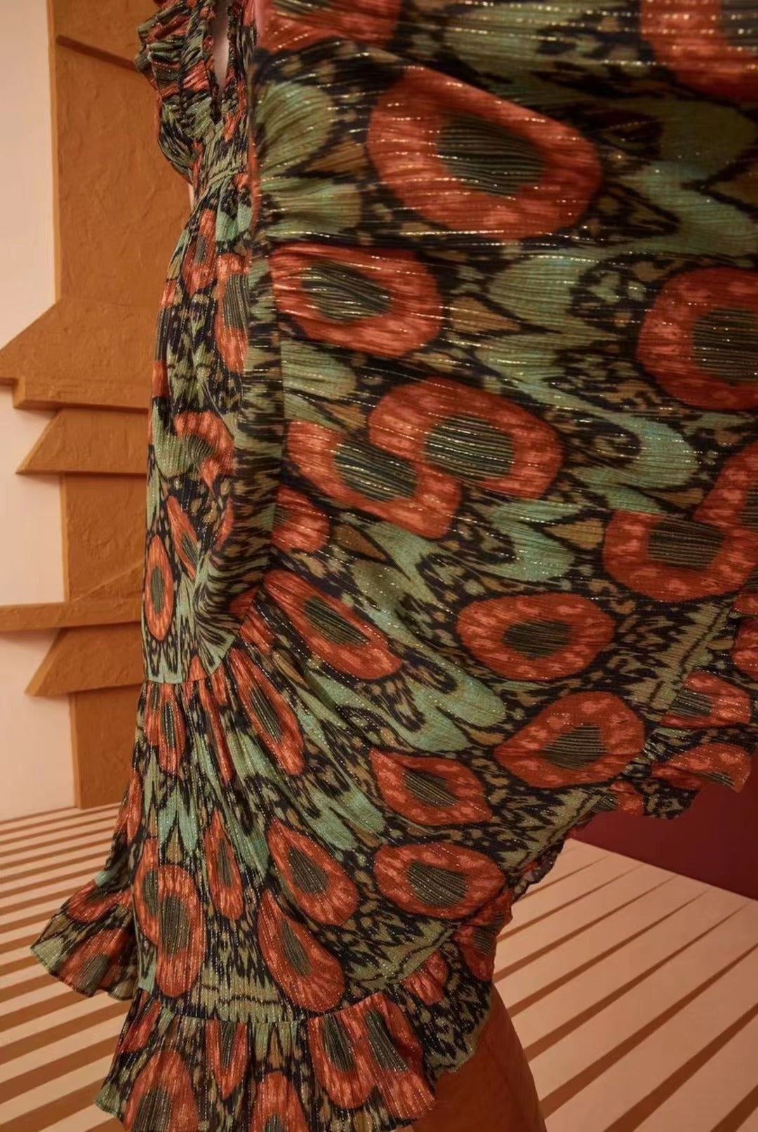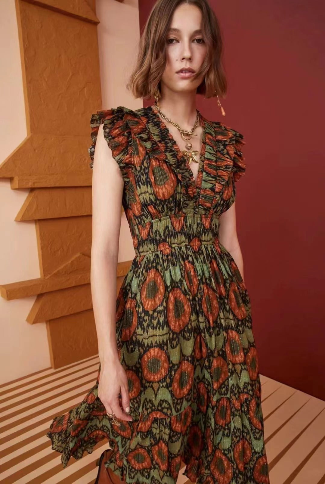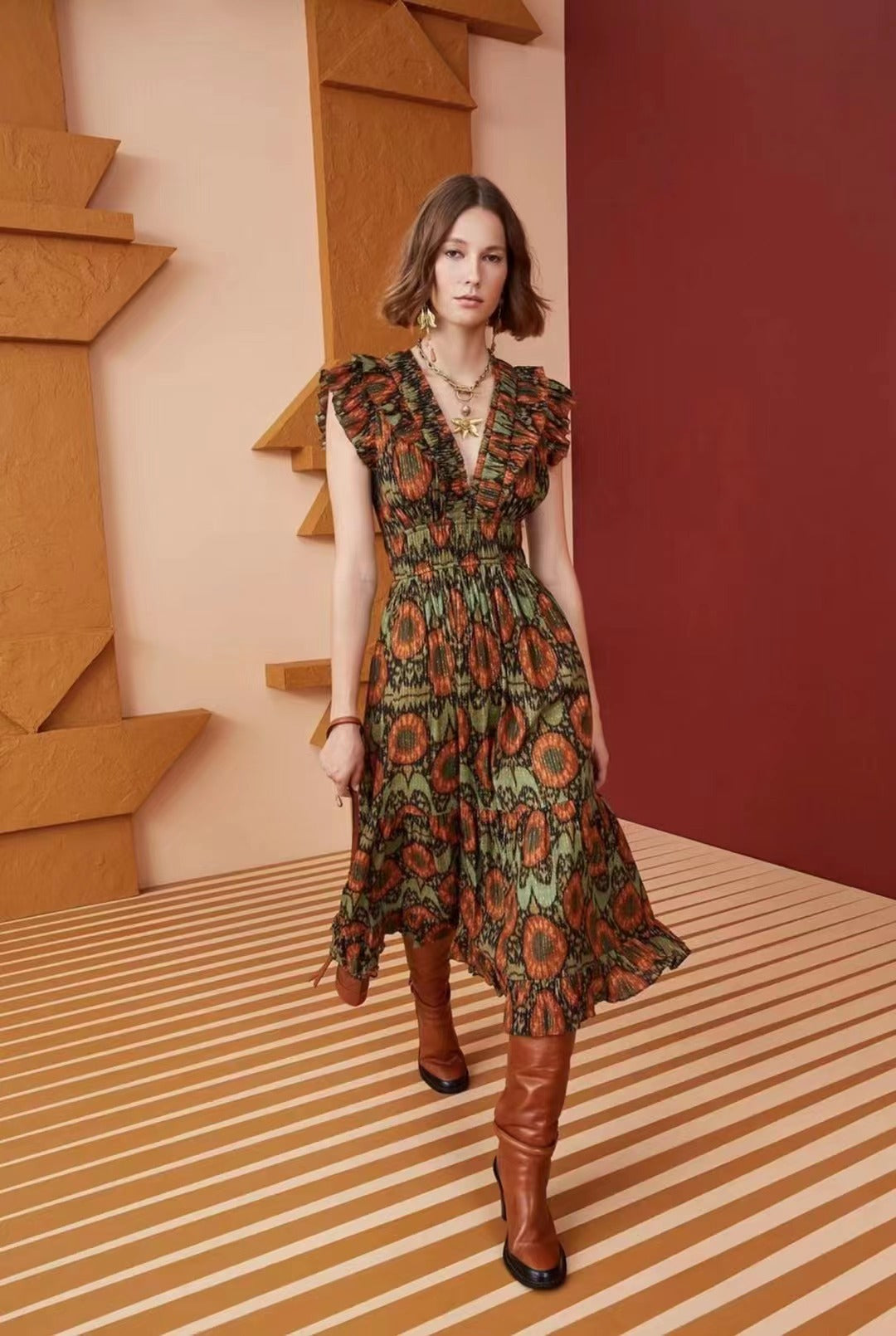 With its stylish design and comfortable fit, the Abstract Print V-Neck Waist Slim Ruffle Dress Midi Dress is a must-have addition to your wardrobe. Embrace your individuality and make a statement wherever you go!