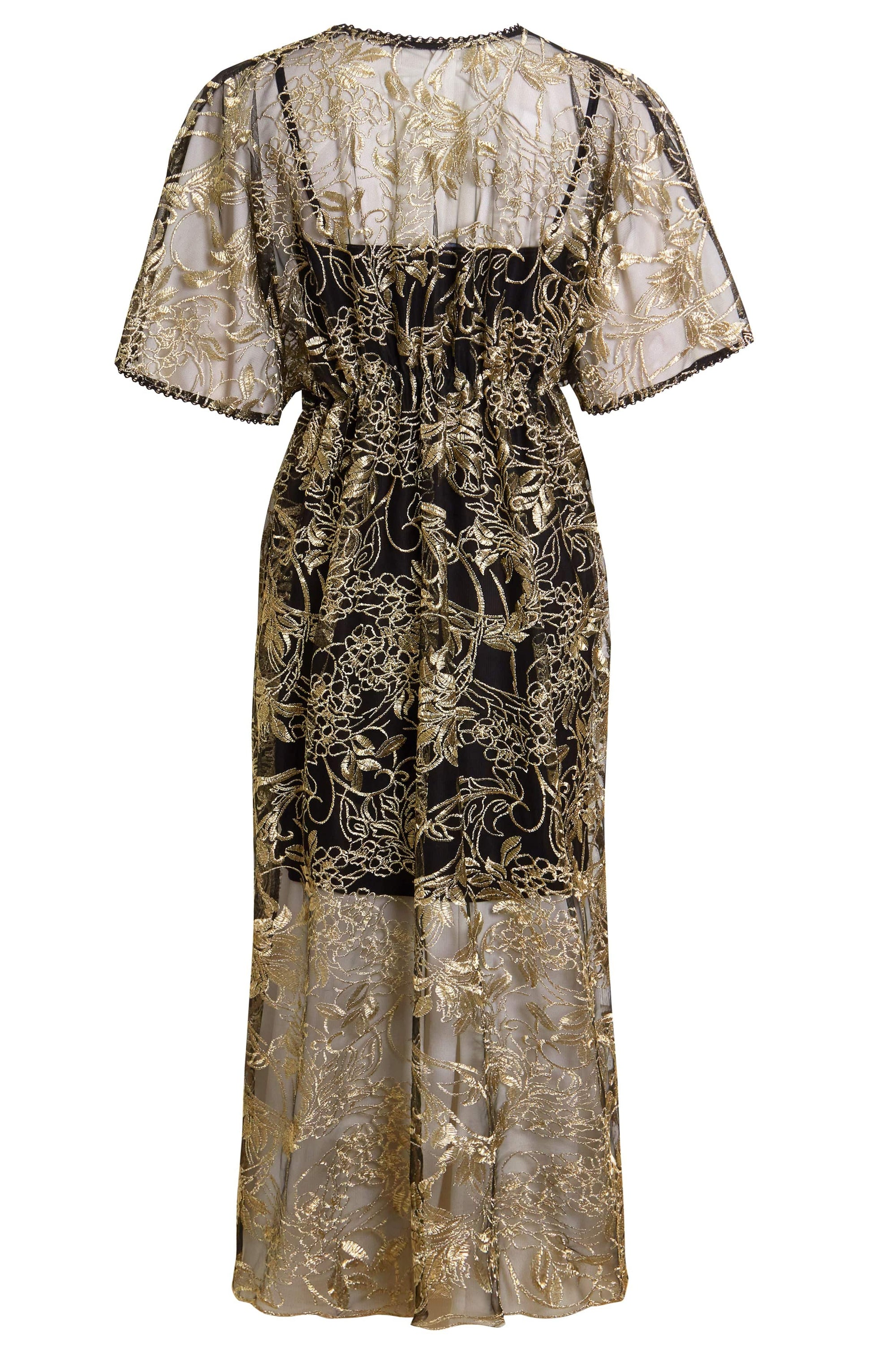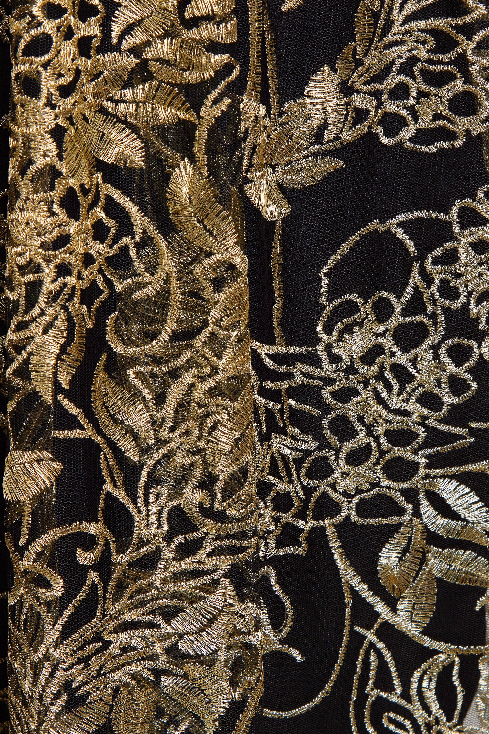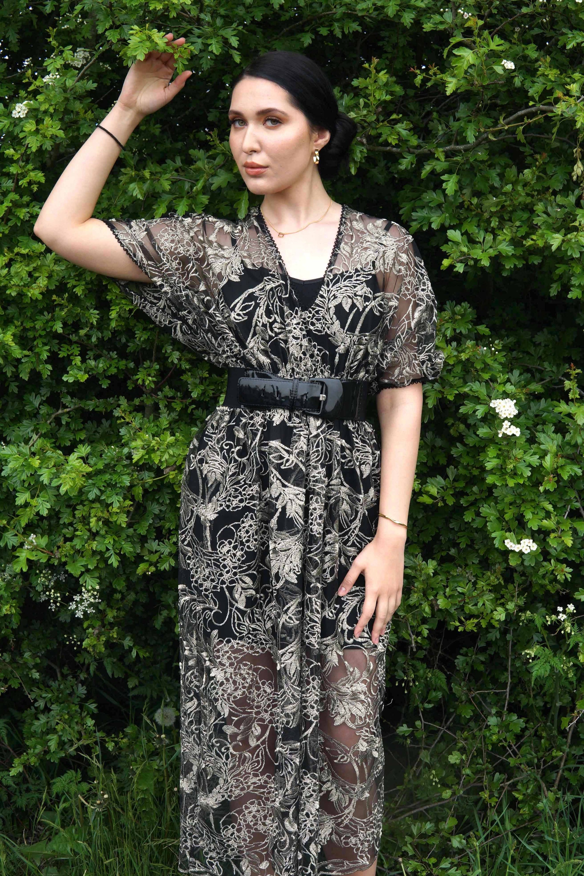 Crafted from high-quality embroidered and embellished gold and black mesh material, this dress is not only visually striking but also ethically made in Britain. The intricate floral embroidery and sequin embellishments add a touch of glamour, ensuring you stand out in any crowd. The dress is layered with a black silk-blend detachable slip, providing versatility and comfort.