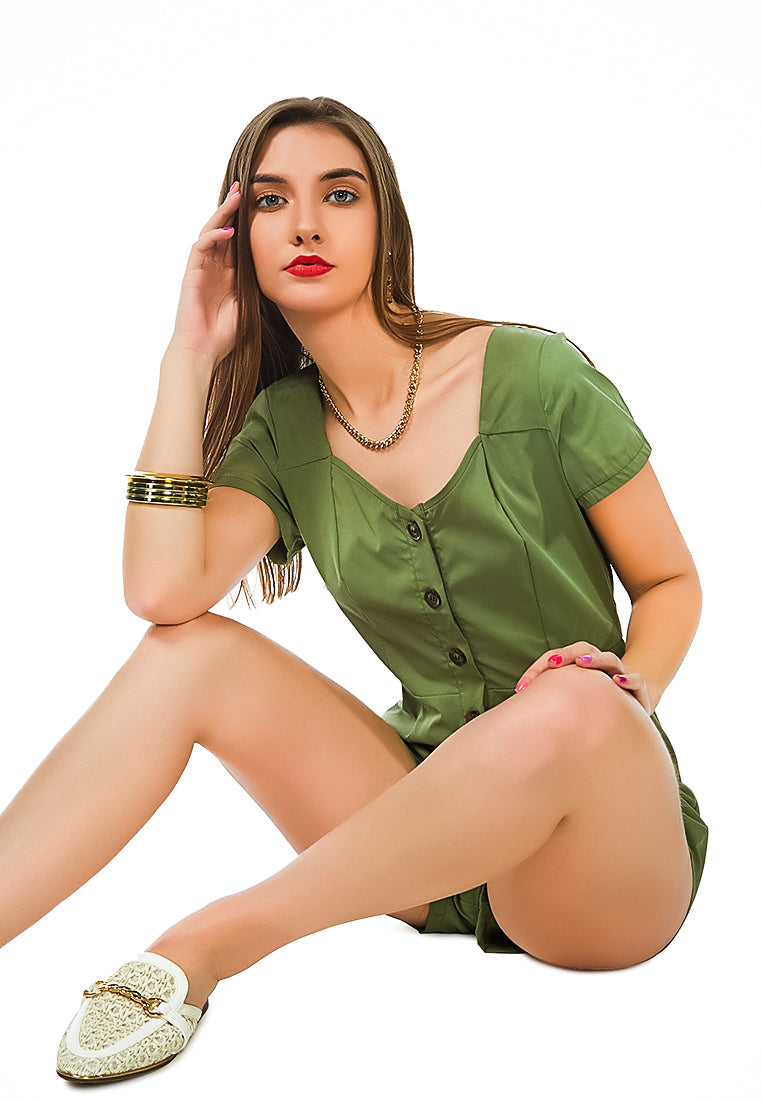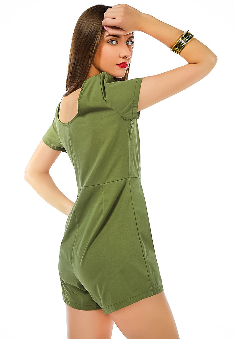 Introducing the Fair Play Button-Up Romper, a delightful addition to your summer wardrobe. This fun and fashionable playsuit features a scoop neck design that enhances your neckline while providing comfort and style. The button-up pattern in a vibrant green color adds a playful touch, making it perfect for various occasions, from casual outings to summer parties.