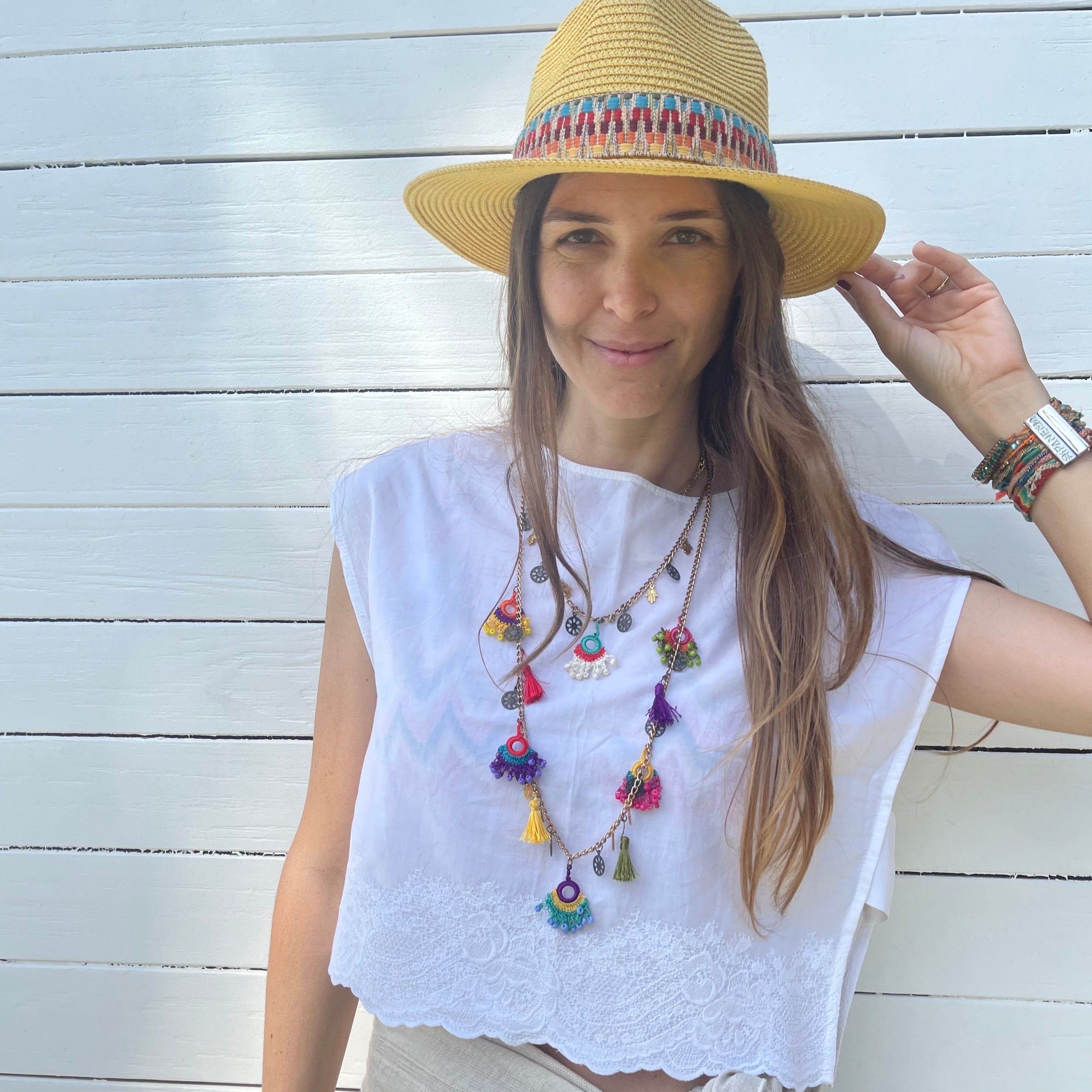 The Hamsa Long Necklace is a stunning piece of jewelry that effortlessly combines elegance and bohemian charm. Handmade on the beautiful Mediterranean coast of Turkey, this necklace is designed to add a playful touch to any outfit. The intricate Hamsa symbol, known for its protective qualities, is beautifully crafted with earthy color embroideries and adorned with natural stones, making it a unique accessory for any jewelry lover.