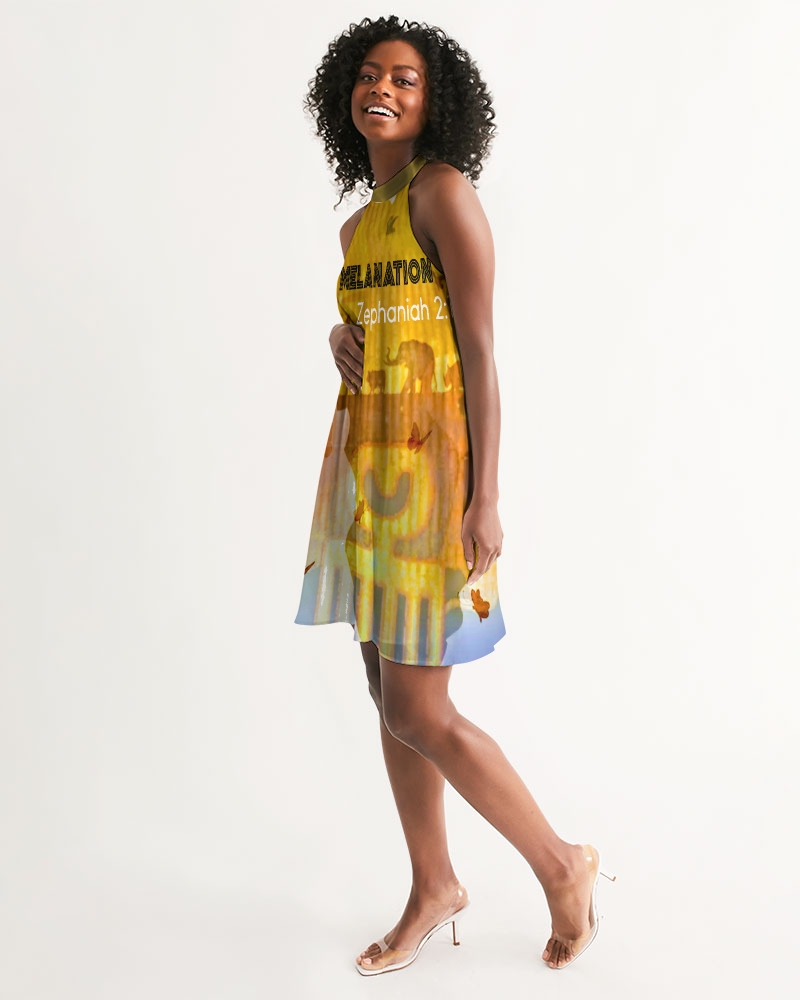 The Melanation Halter Dress is the epitome of elegance and simplicity, designed for women who appreciate style and comfort. This stunning dress is handmade from high-quality polyester chiffon material, ensuring a lightweight and flowy fit that flatters all body types. The halter neckline adds a touch of sophistication, making it perfect for various occasions, from casual outings to formal events.