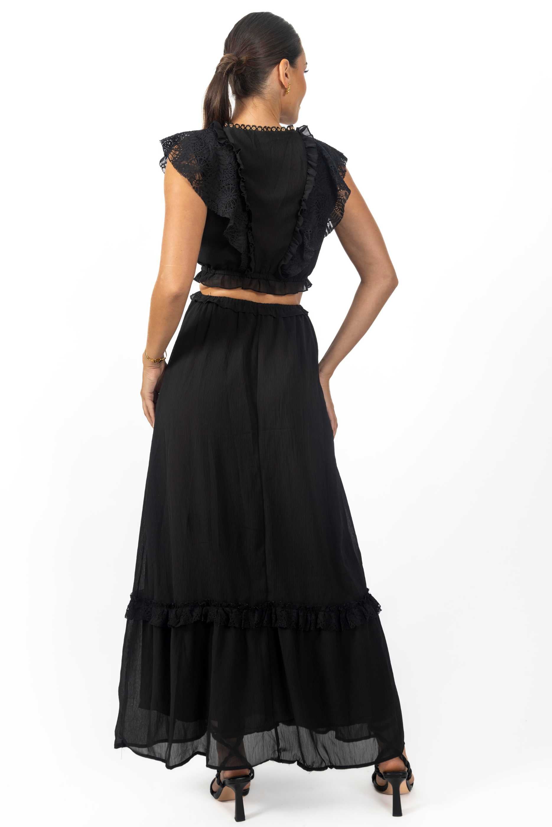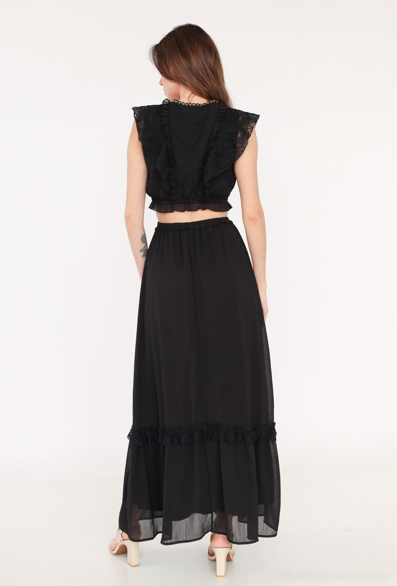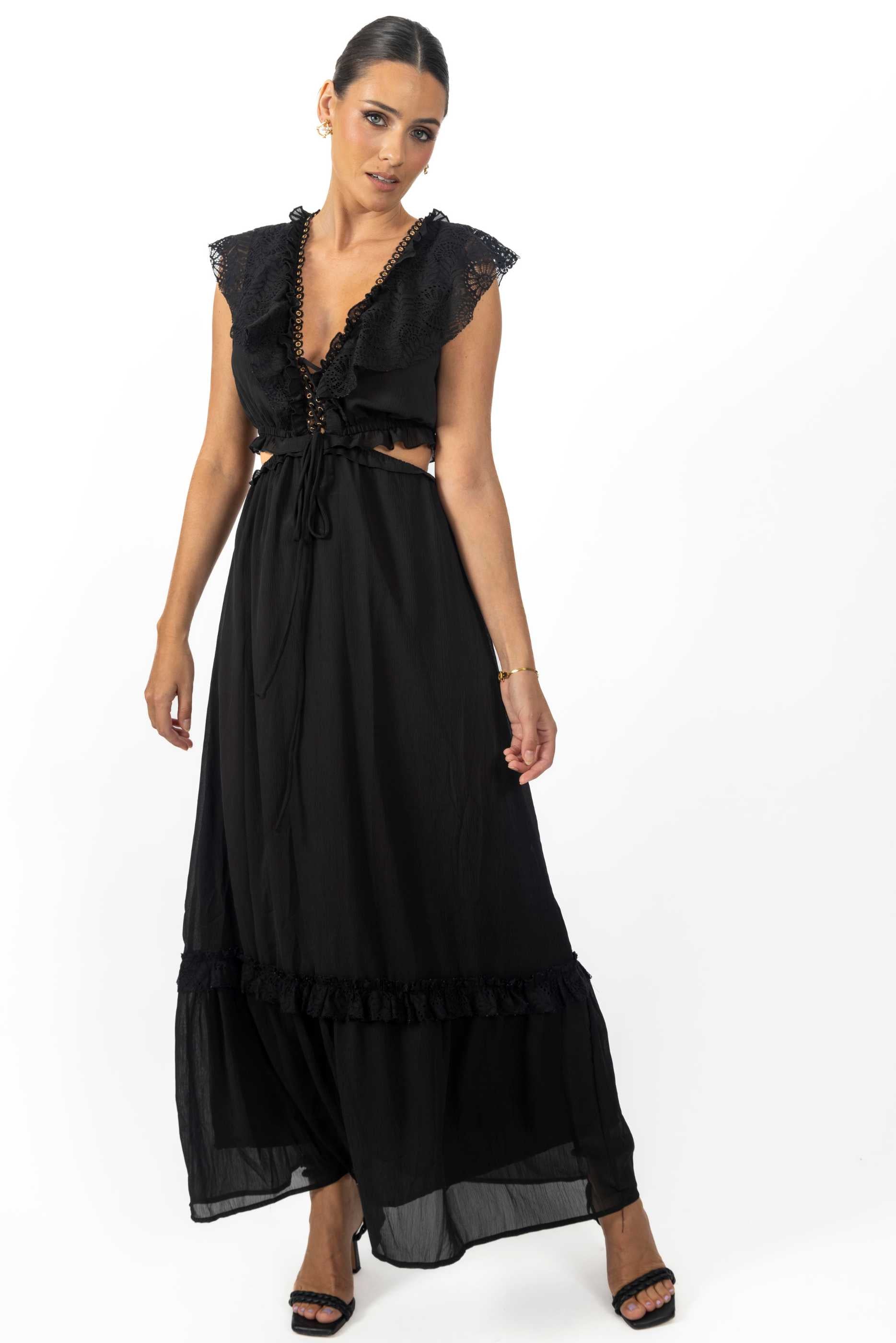 In summary, the Miah Maxi Women's Dress in Black is a versatile and stylish choice for any wardrobe. With its unique lace-up detailing, flattering silhouette, and high-quality fabric, it is sure to become your go-to dress for any occasion.