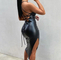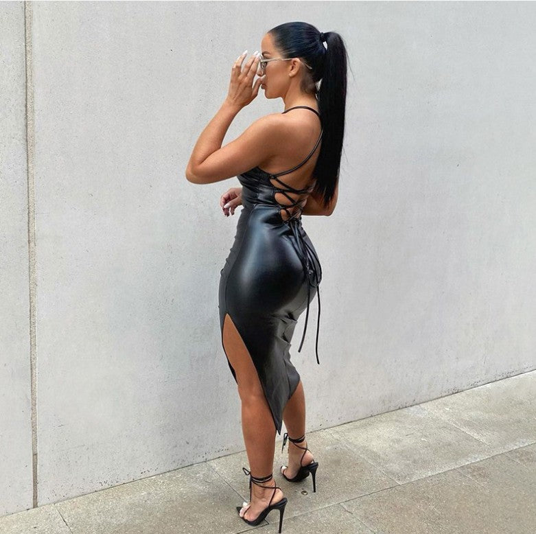 A stylish backless PU leather dress with straps, featuring a long A-line skirt and high waist design, perfect for nightlife and parties.