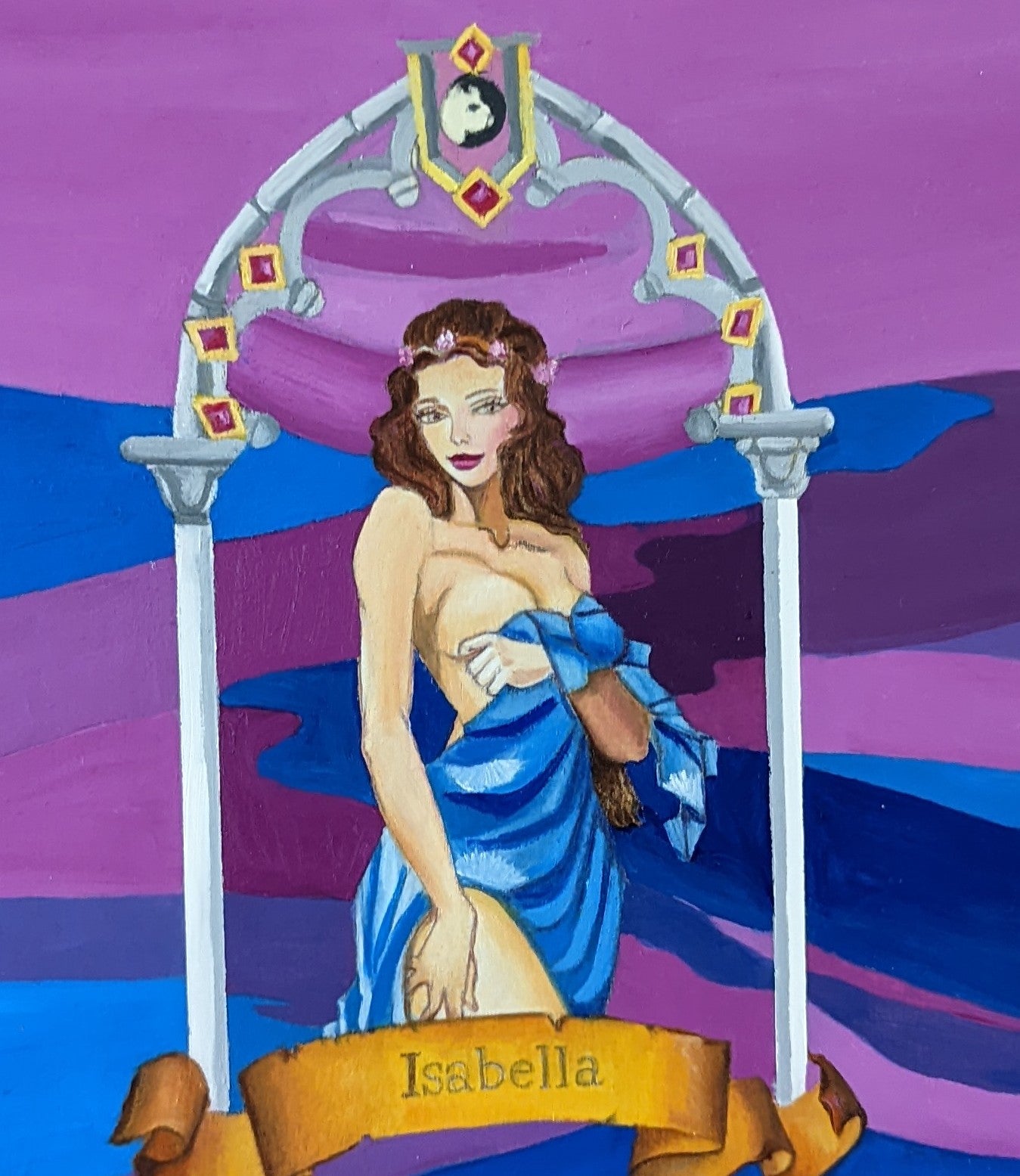 Introducing the stunning MYTHIC ART COLLECTION by renowned artist Sharon Tatem, featuring the captivating painting titled Isabella. This exquisite piece is a two-level tier painting, crafted with meticulous attention to detail using high-quality oil on panel. As part of the Kingsthrone NFT Collection of maidens, Isabella embodies the essence of dreams and aspirations, making it a perfect addition to any art lover's collection.