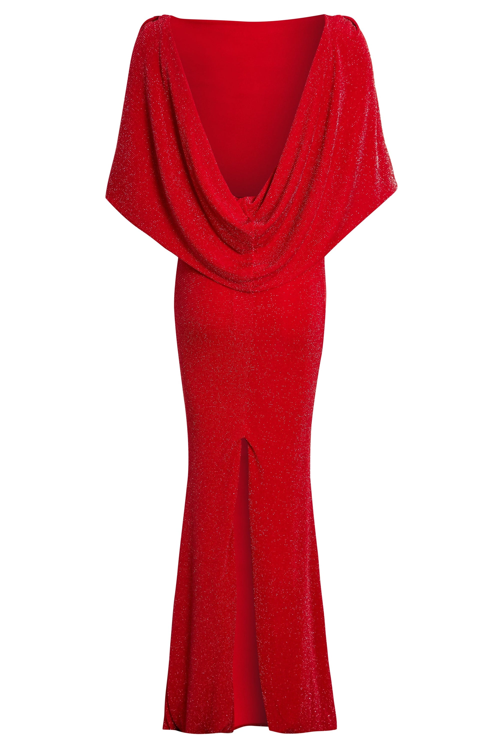 Introducing the exquisite Red Cowl Back Gown, a statement piece that embodies elegance and sophistication. This stunning gown is designed for those who wish to make a lasting impression at formal events, balls, and black-tie occasions. Crafted from high-quality stretchy jersey fabric, it offers a figure-enhancing fit that flatters all body types.