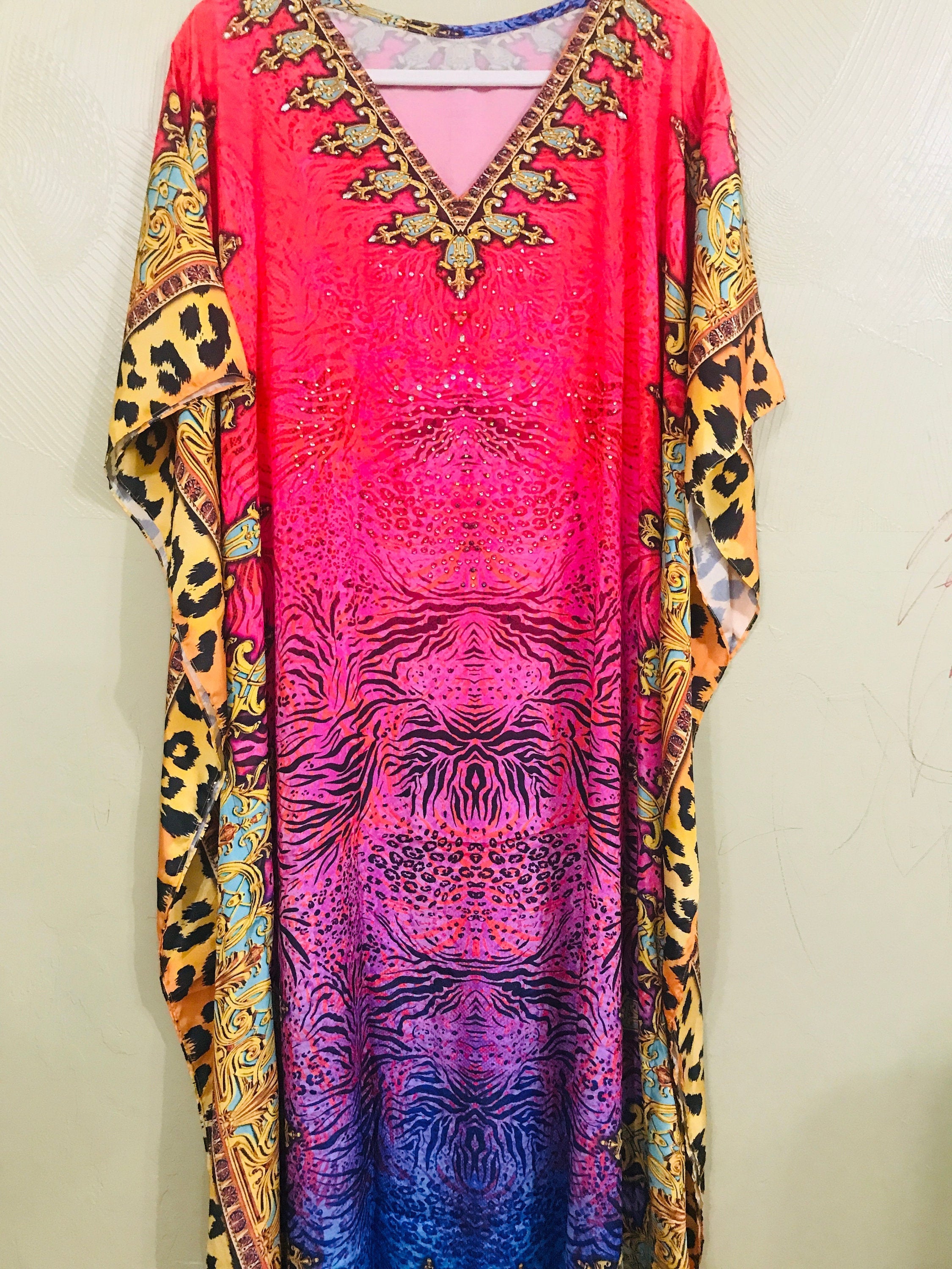 Introducing the stunning Tropical Caftan Dress in pink, a versatile and stylish addition to your wardrobe. This beautiful dress is perfect for various occasions, from beach parties to casual outings. Made from high-quality French crepe, this caftan dress is designed to provide comfort and elegance, making it an ideal choice for any fashion-forward woman.