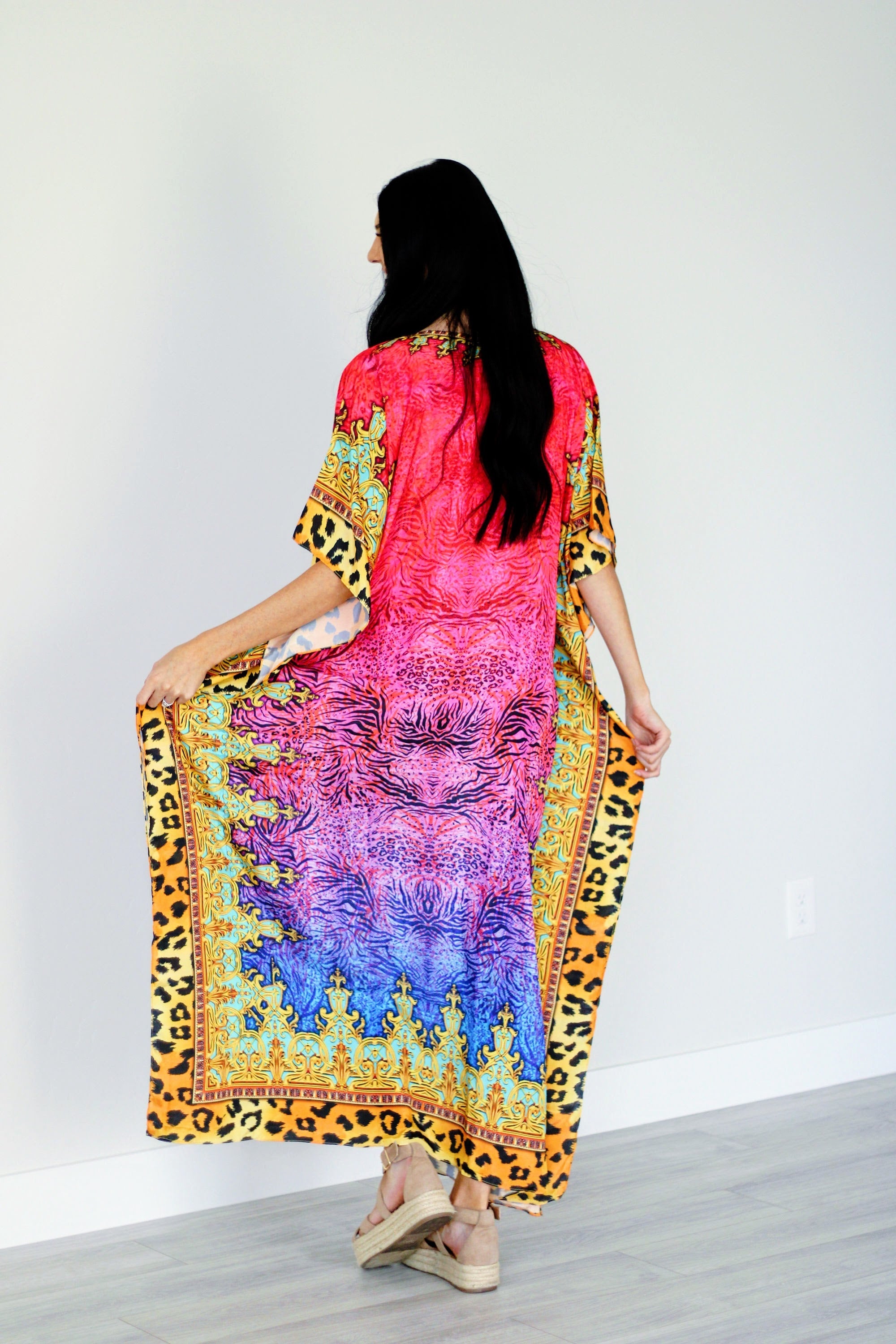 In summary, the Tropical Caftan Dress in pink is a beautiful, versatile, and comfortable option for women looking to elevate their wardrobe. With its vibrant colors, inclusive sizing, and easy care instructions, this dress is sure to become a favorite for any occasion.