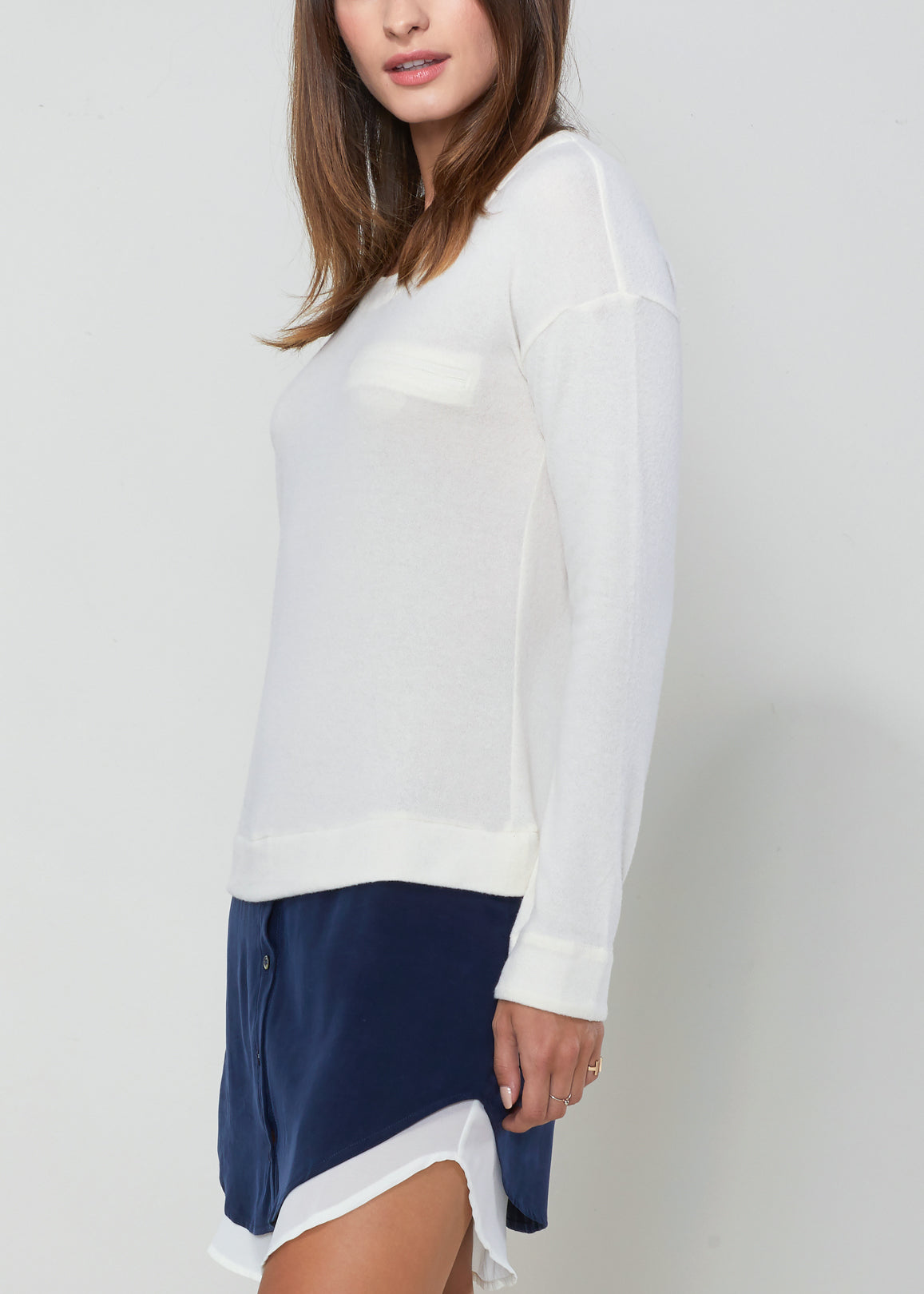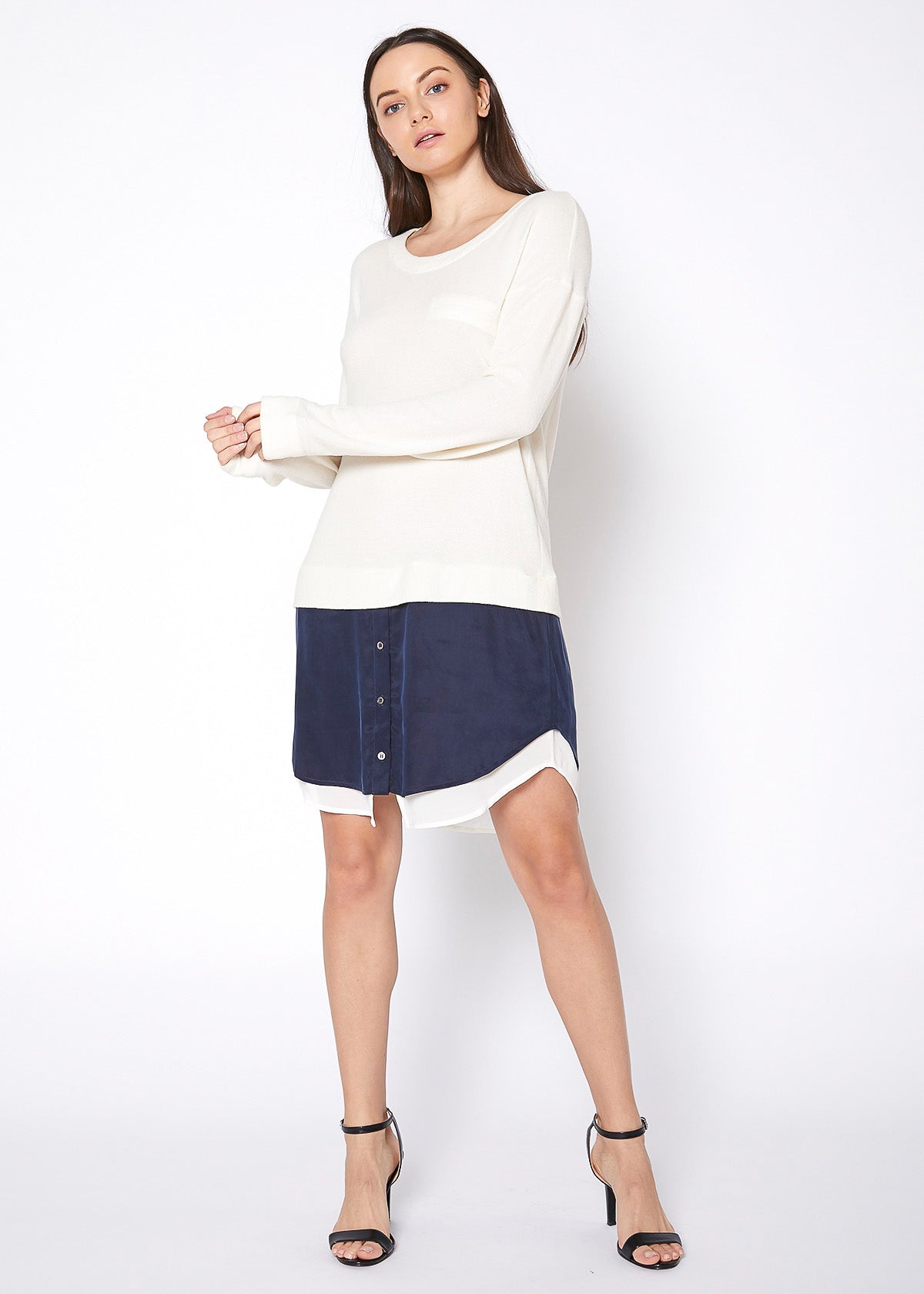 This sweater dress features a trendy twofer design, giving the appearance of layered clothing without the bulk. The chest pocket adds a touch of practicality, allowing you to keep small essentials close at hand. The dress is available in various sizes, and the model shown is wearing a size small, with a height of 5'6" and measurements of 32" bust, 26" waist, and 35.5" hips.