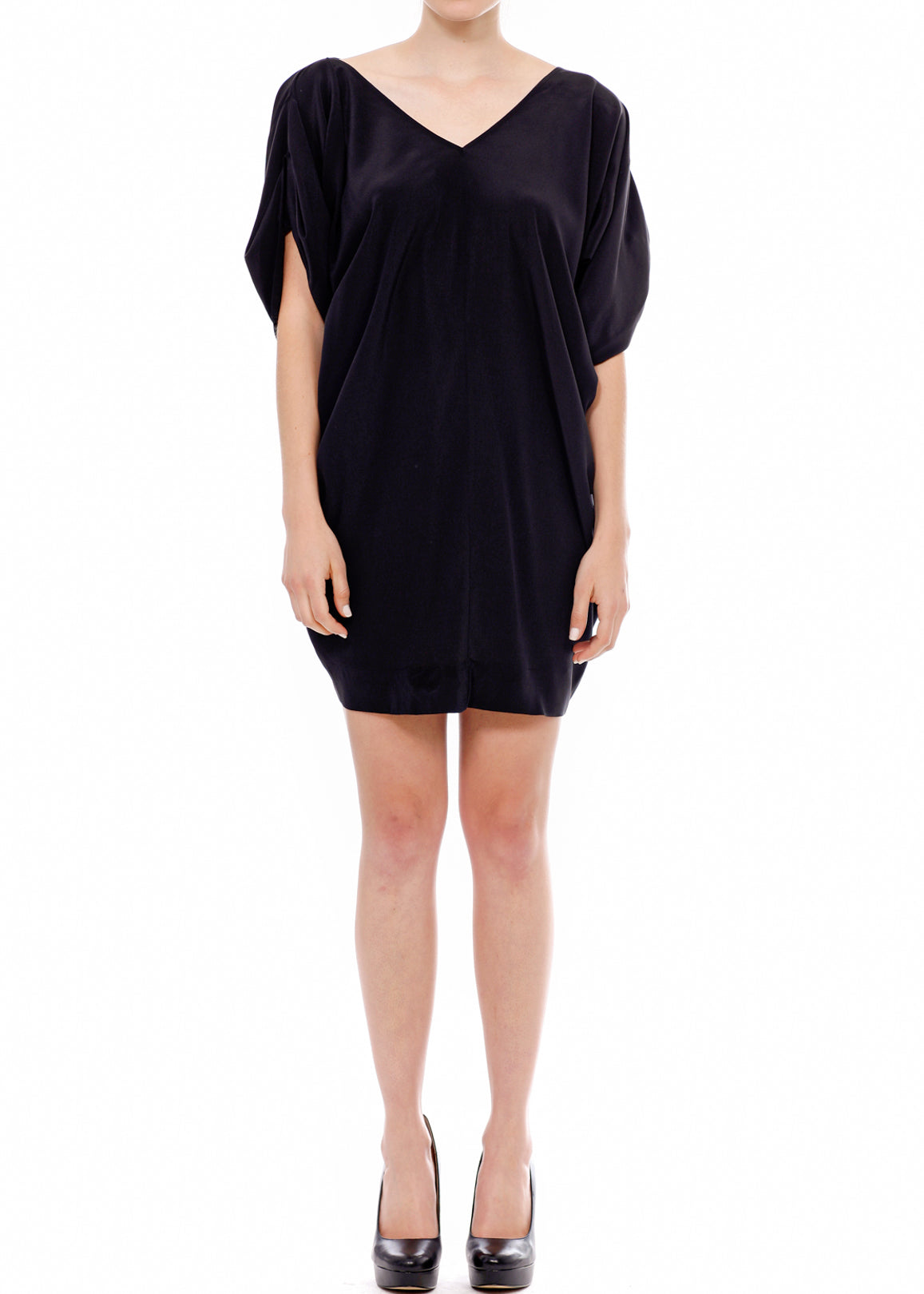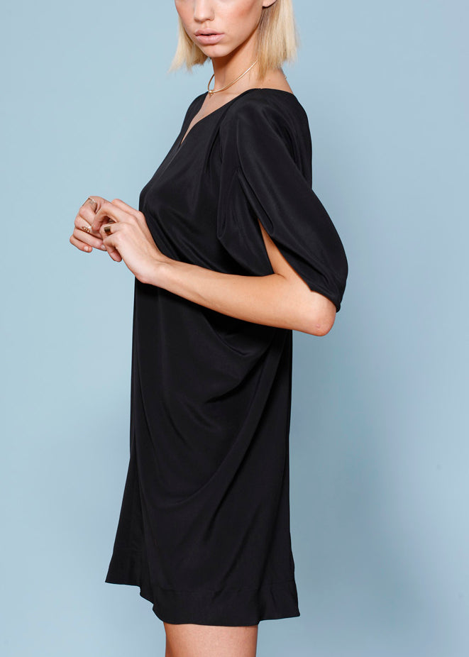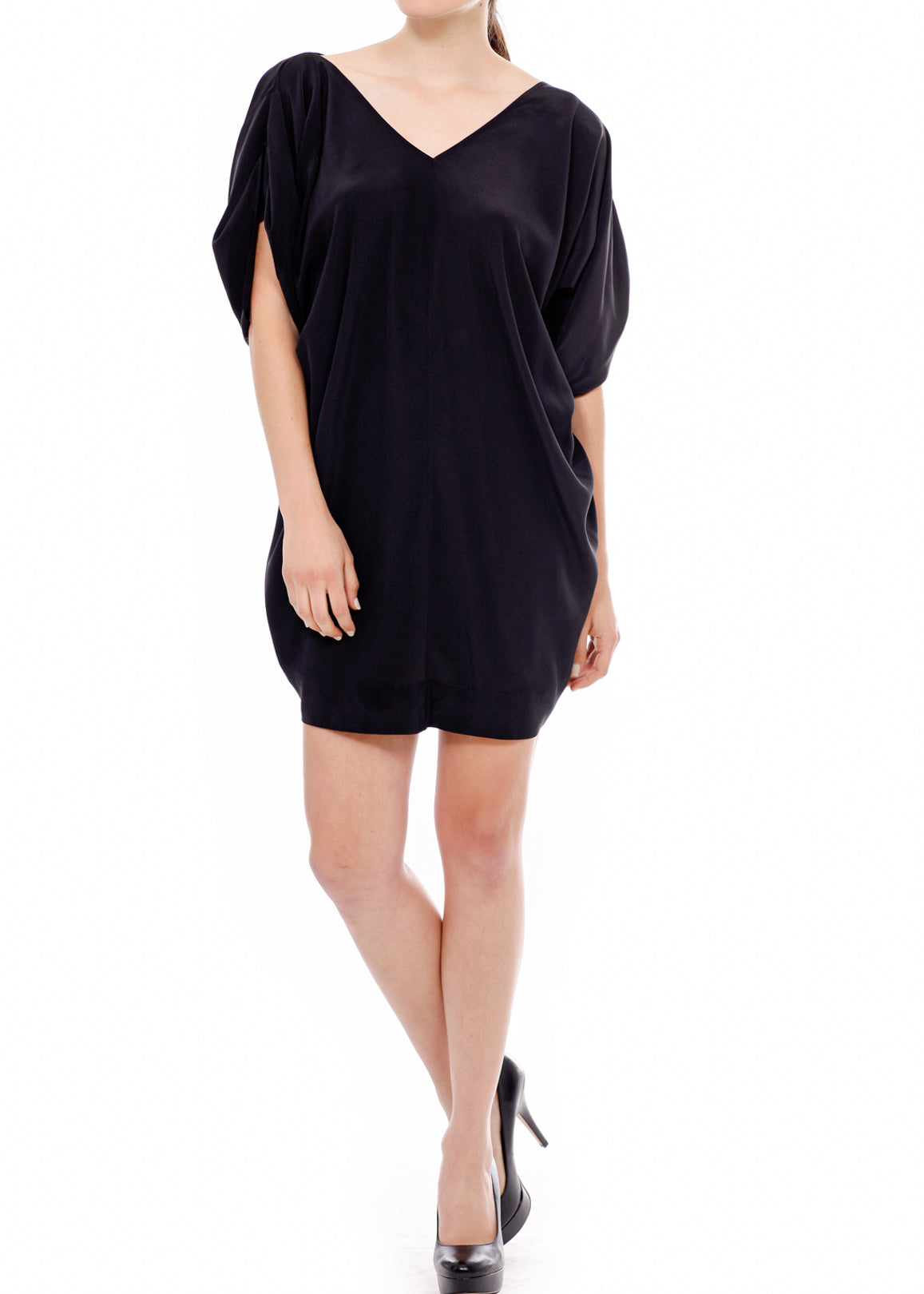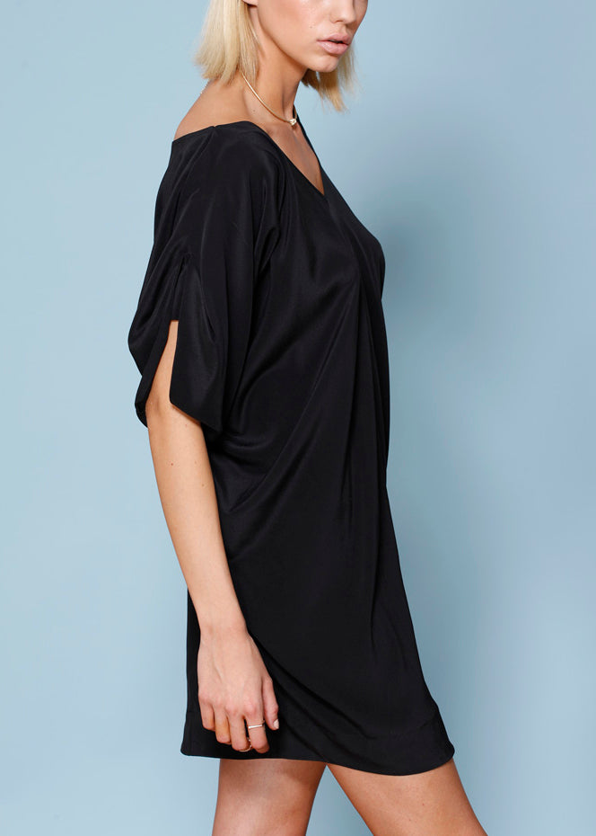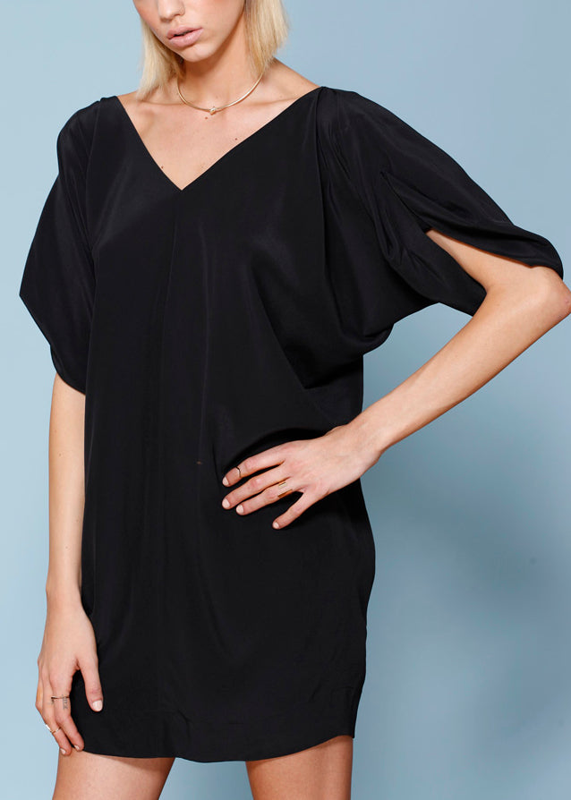 A luxurious Women's 100% Silk Wide V Neck Dress in elegant black, showcasing its soft fabric and stylish design.