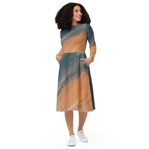 Introducing the Womens Long Sleeve Midi Dress in a captivating blue and orange abstract pattern, designed to be your new go-to outfit for any occasion. This dress combines style and comfort, making it perfect for everything from casual outings to more formal events. The soft fabric feels great against the skin, ensuring you stay comfortable and confident all day long.