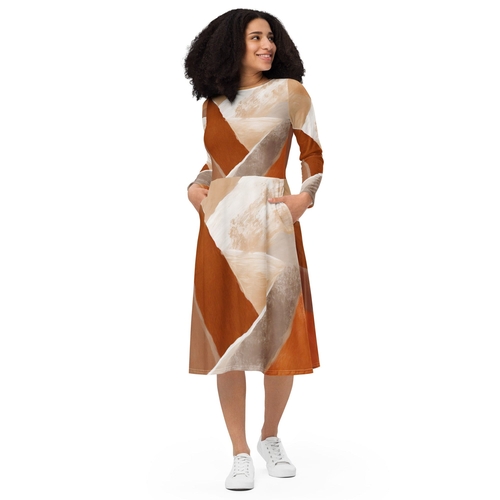 The vibrant multicolor textured pattern of this dress is sure to turn heads. The boho abstract design adds a unique flair, making it a perfect choice for casual outings, brunch with friends, or even a day at the office. The midi length provides a sophisticated look, while the long sleeves make it suitable for various seasons.