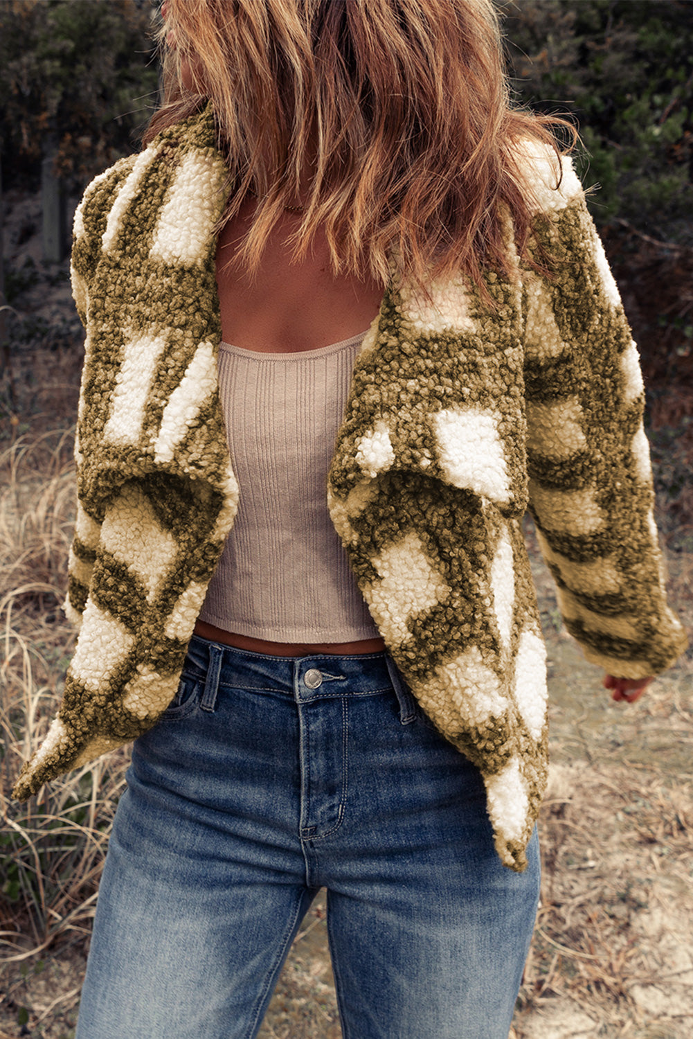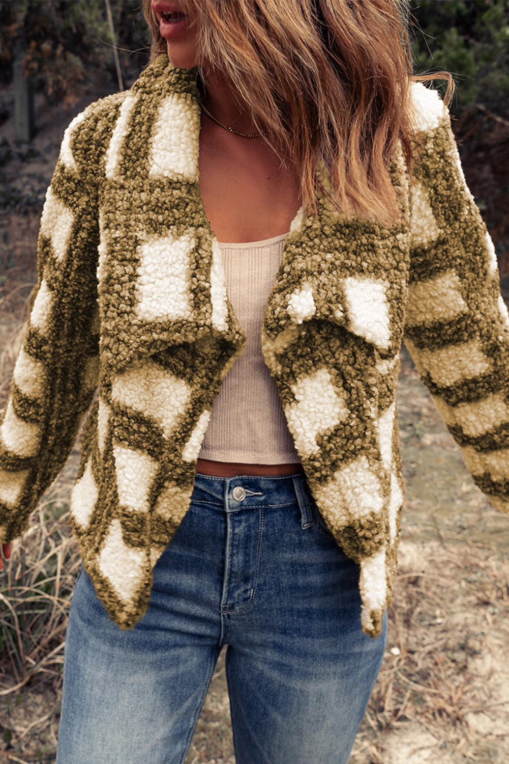 The Brown Plaid Sherpa Jacket features a timeless plaid design that never goes out of style. Its lapel collar adds a touch of sophistication, while the long sleeves provide extra warmth. The open front style makes it easy to layer over your favorite outfits, whether you're heading to work, school, or a date.