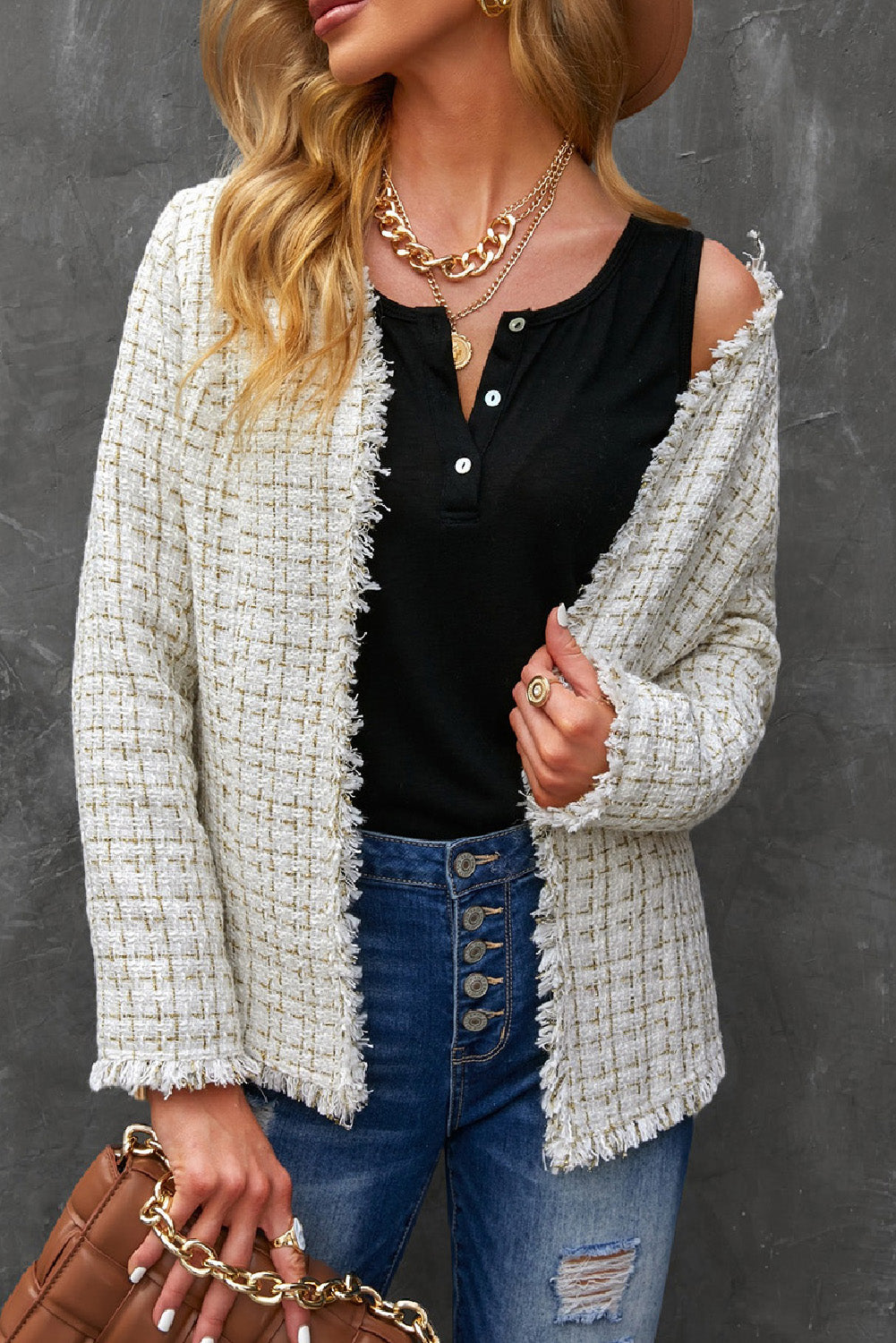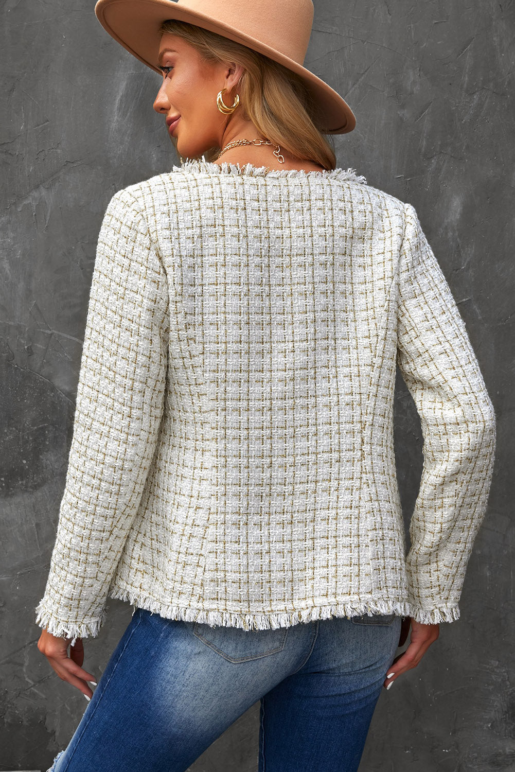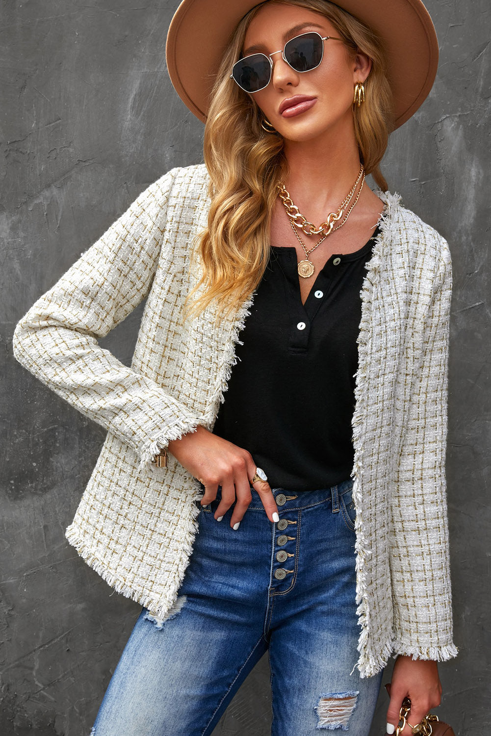 Introducing the Frayed Slim-fit Plaid Jacket, a must-have addition to any modern woman's wardrobe. This stylish jacket combines elegance with a contemporary twist, making it perfect for various occasions, from casual outings to office wear. The unique plaid pattern adds a touch of sophistication, while the frayed details give it a trendy edge that sets it apart from traditional jackets.