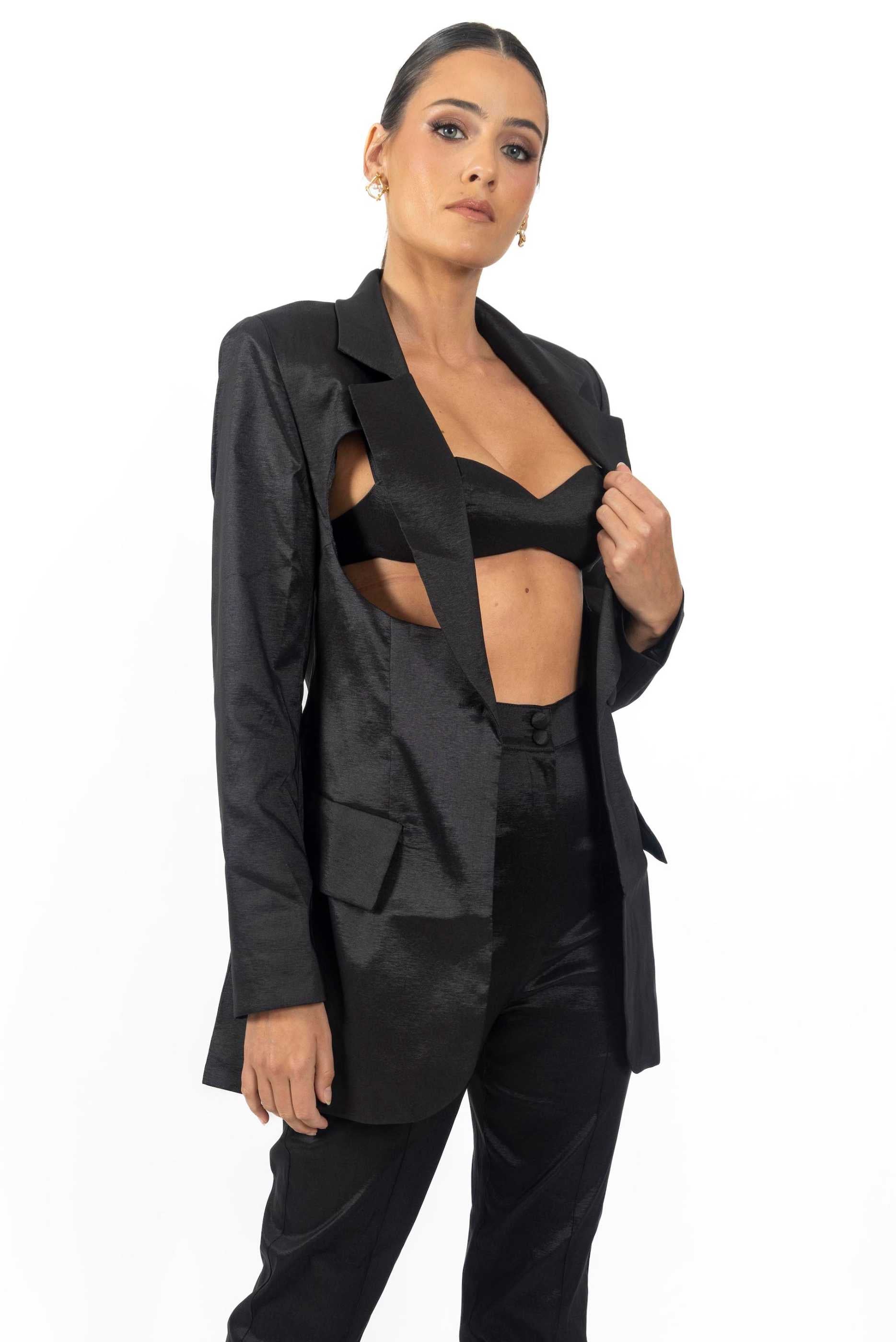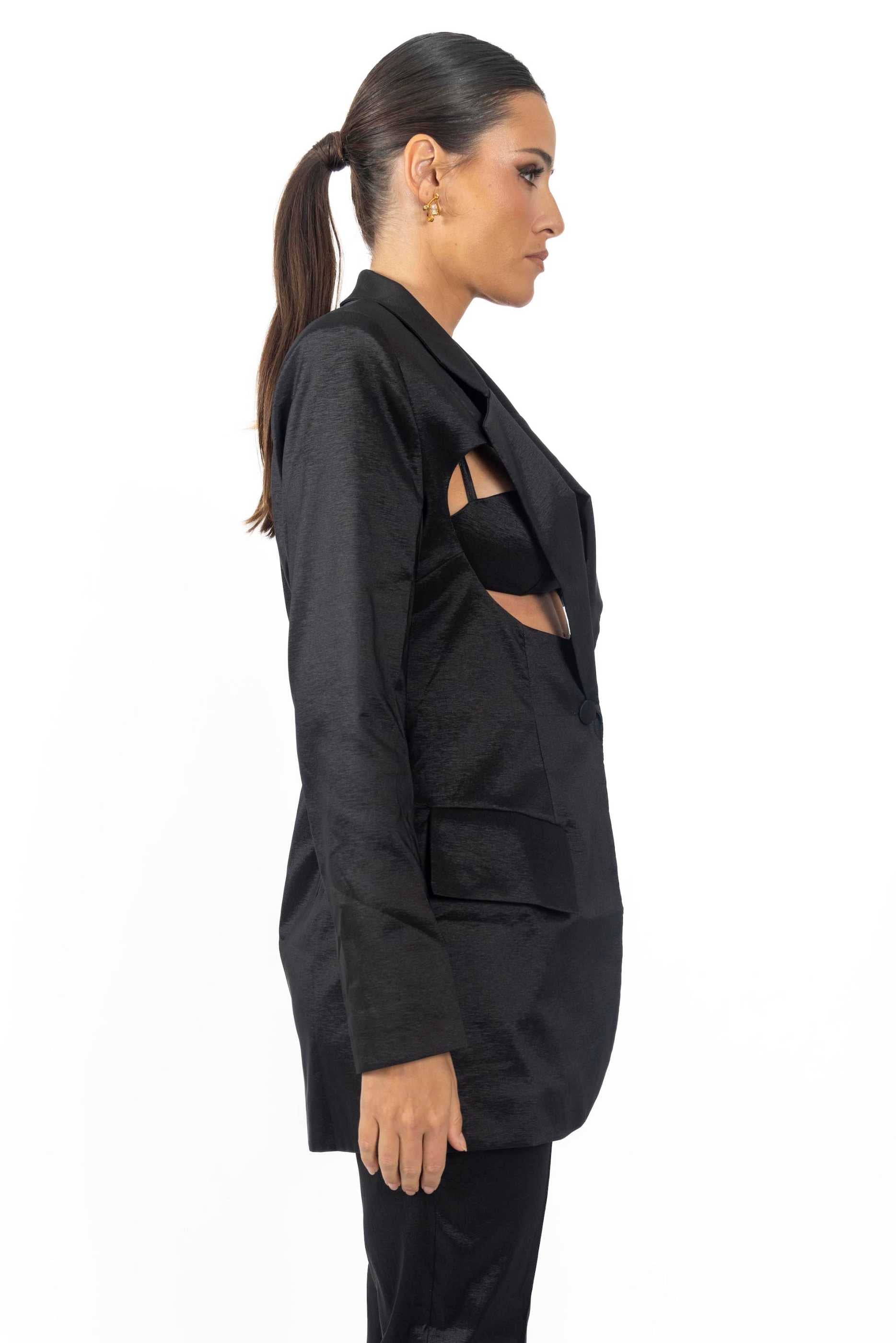 The Meghan Cutout Black Women's Blazer is a stunning addition to any fashion-forward wardrobe. Crafted from a luxurious silk-like fabric, this blazer not only looks sophisticated but also feels incredibly soft against the skin. The unique cutout design adds a modern twist, making it a standout piece for both casual and formal occasions.