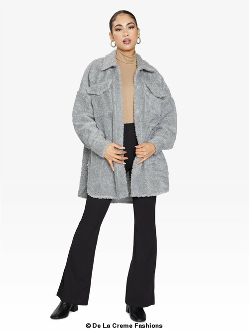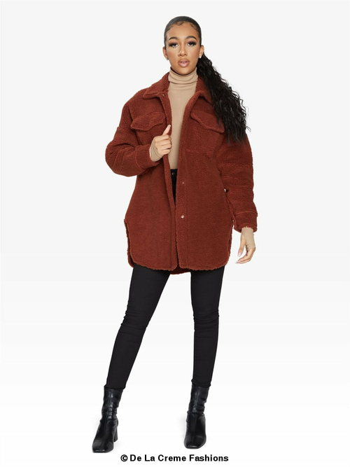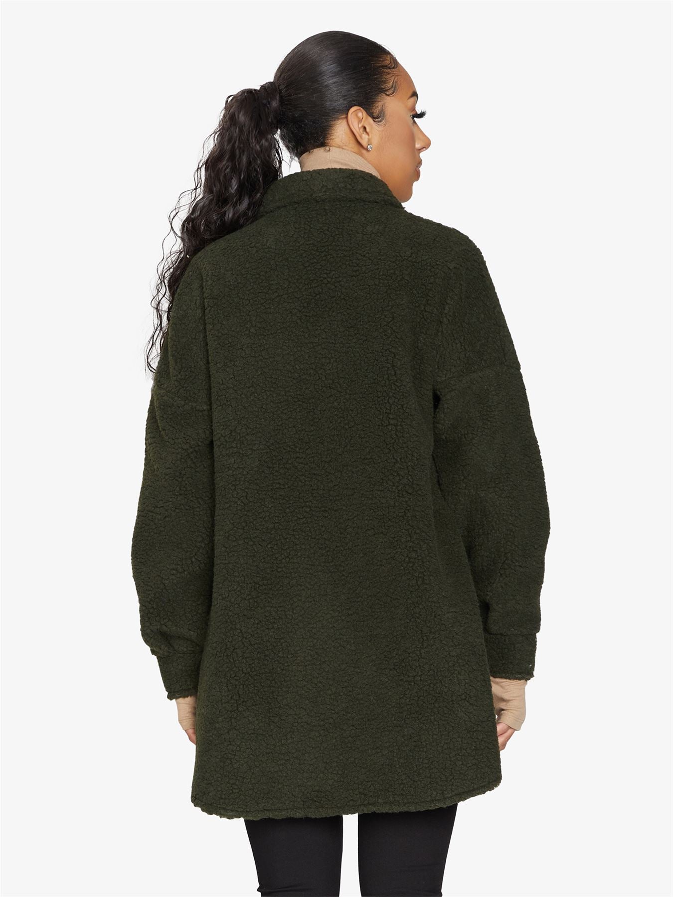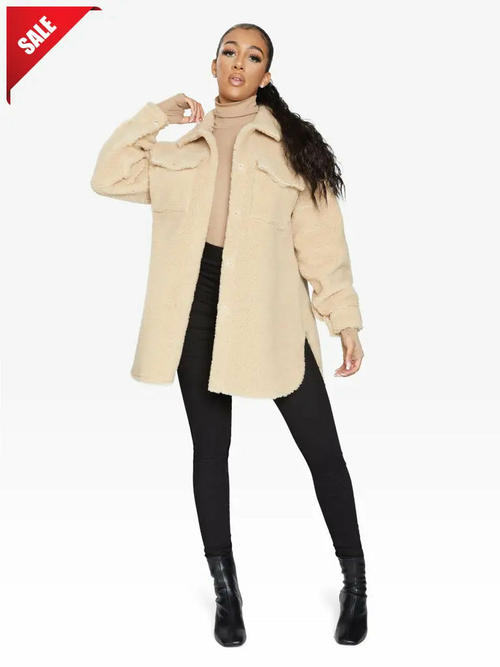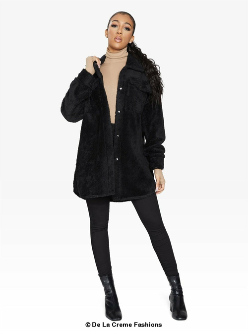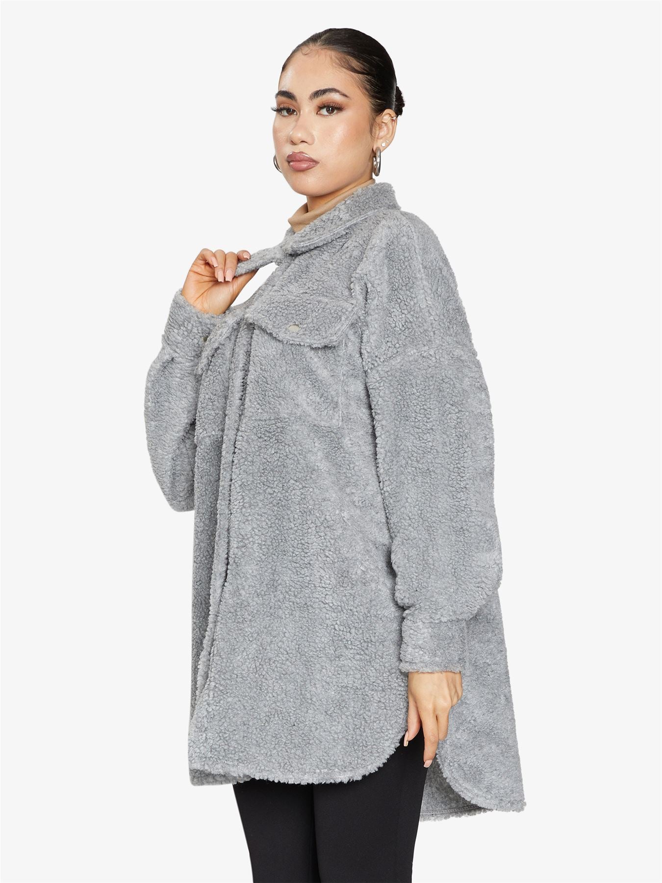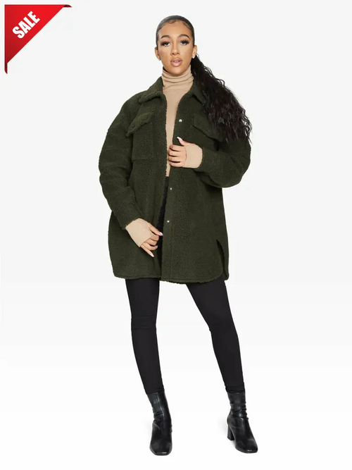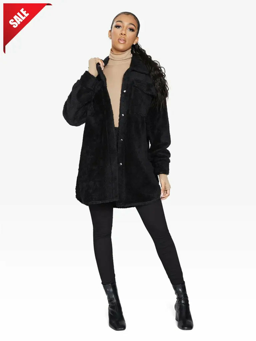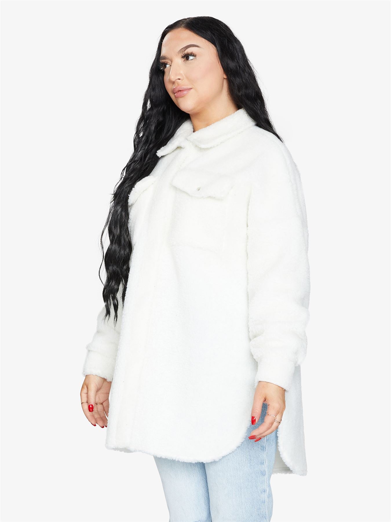 Oversized Stud Button Borg Teddy Shacket in soft teddy material with stud buttons and storm flap pockets.
