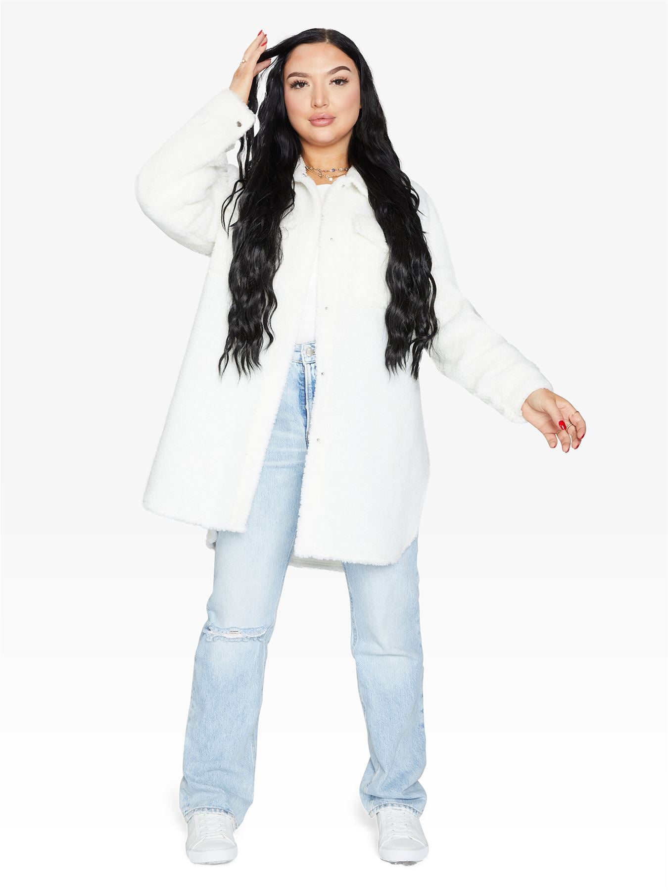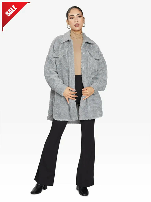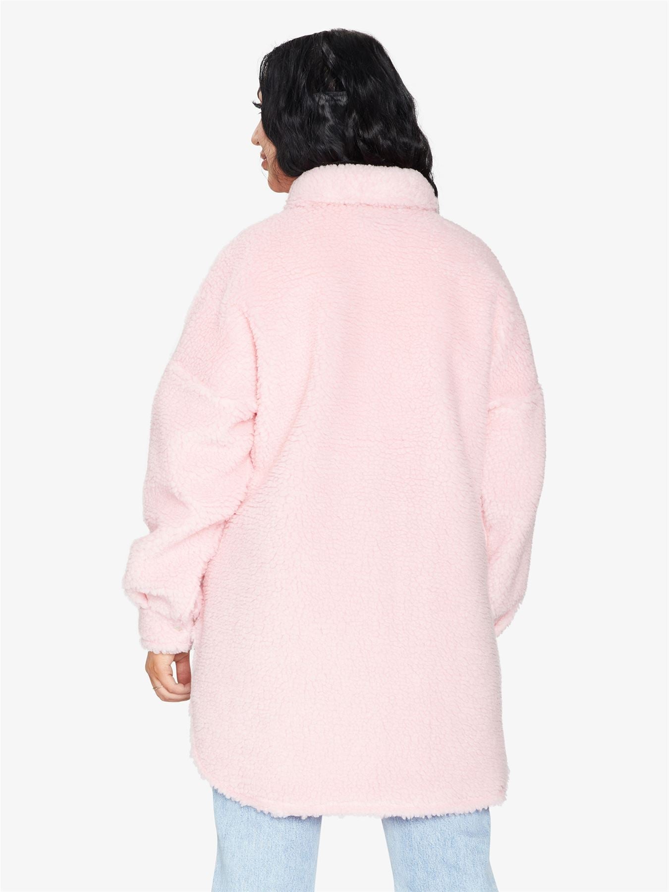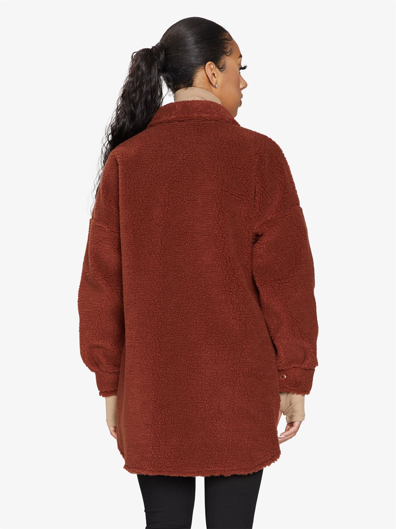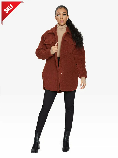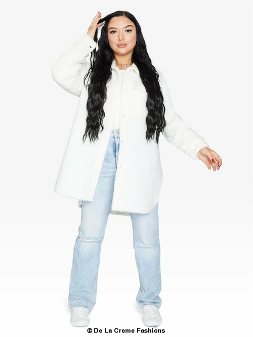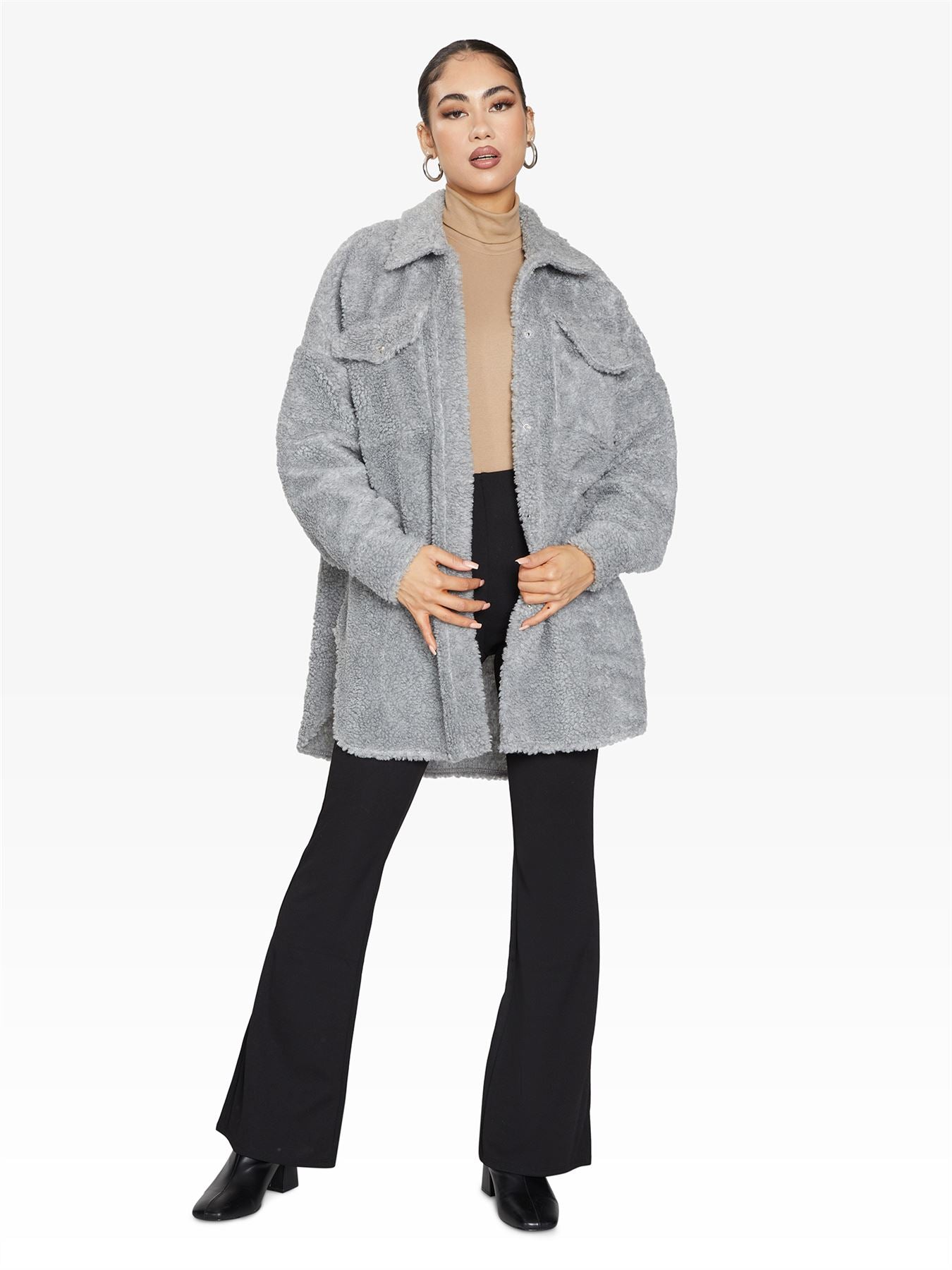 Oversized Stud Button Borg Teddy Shacket in soft teddy material with stud buttons and storm flap pockets.