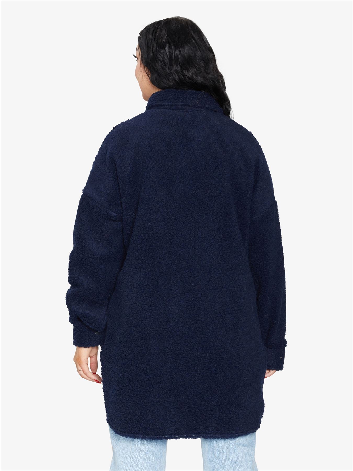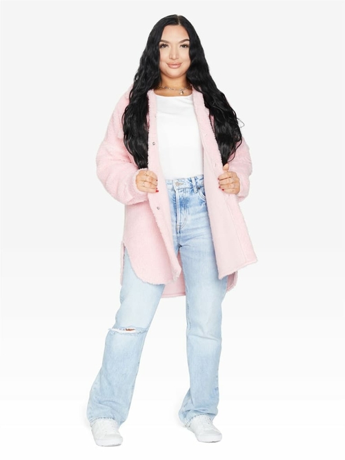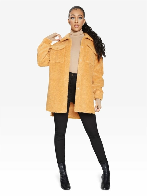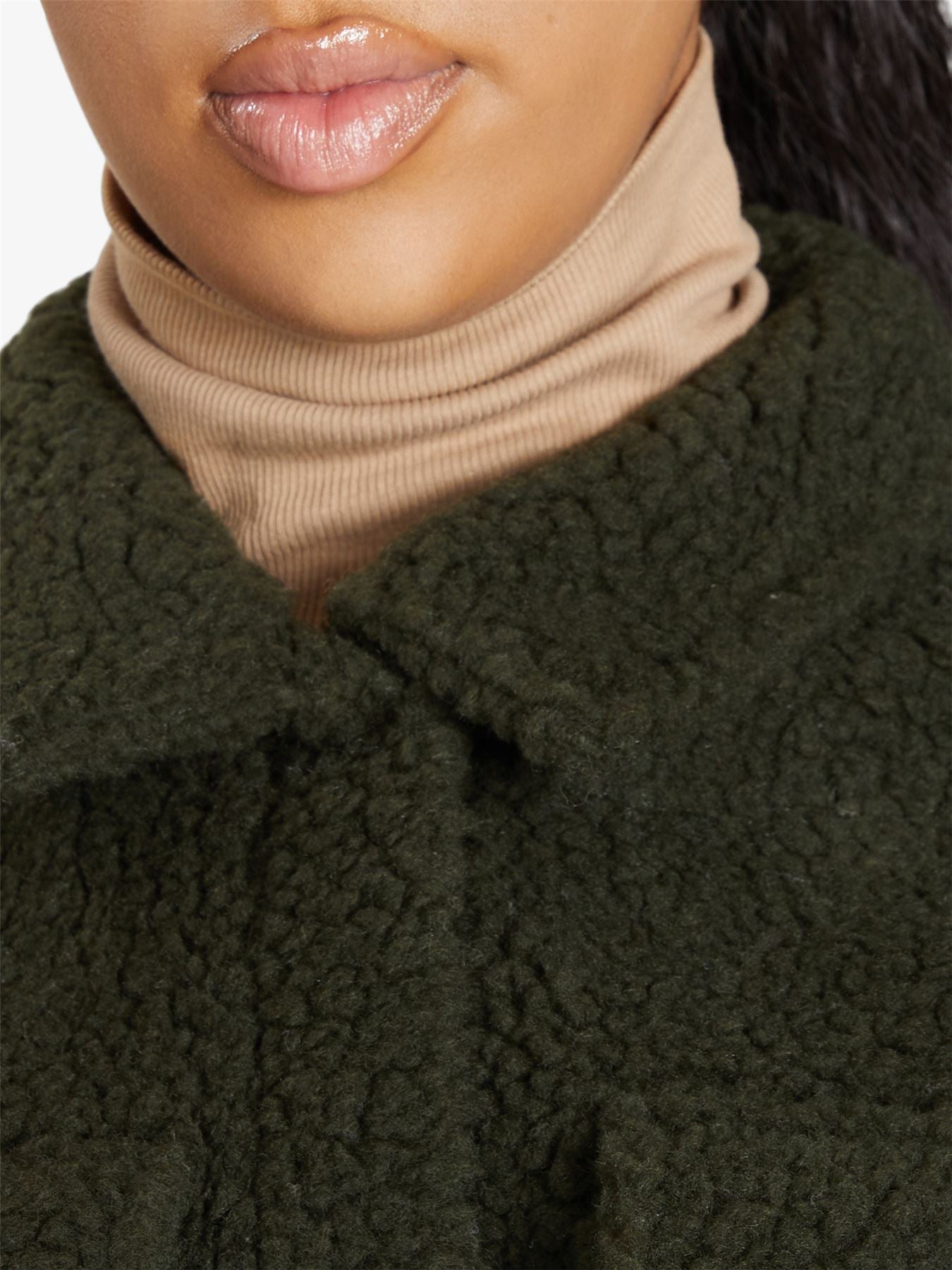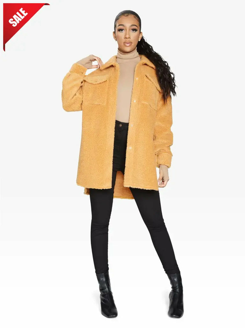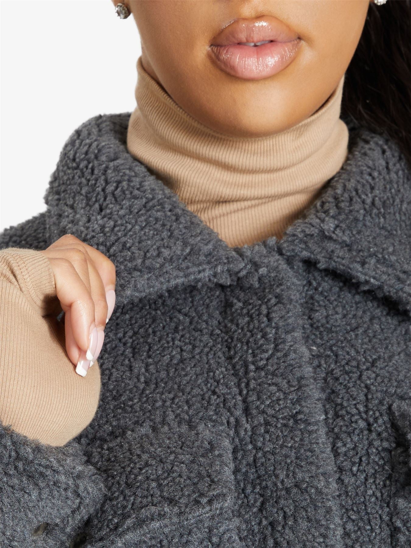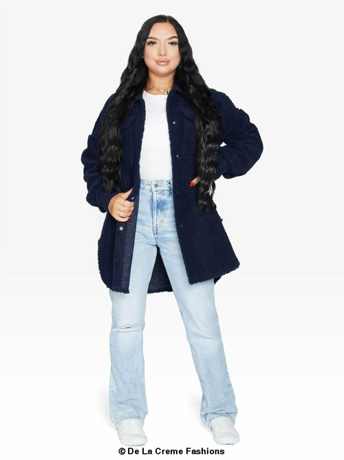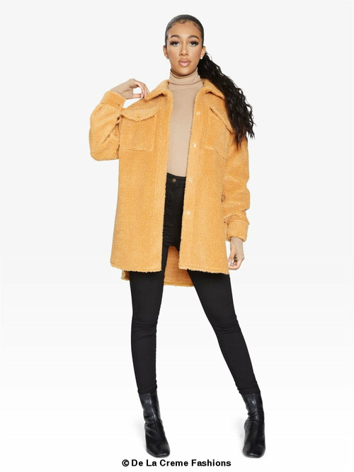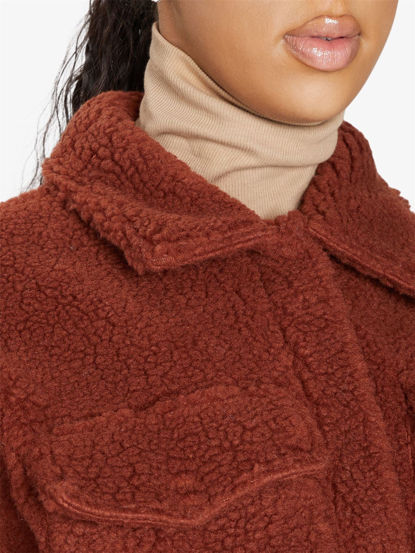 Oversized Stud Button Borg Teddy Shacket in soft teddy material with stud buttons and storm flap pockets.