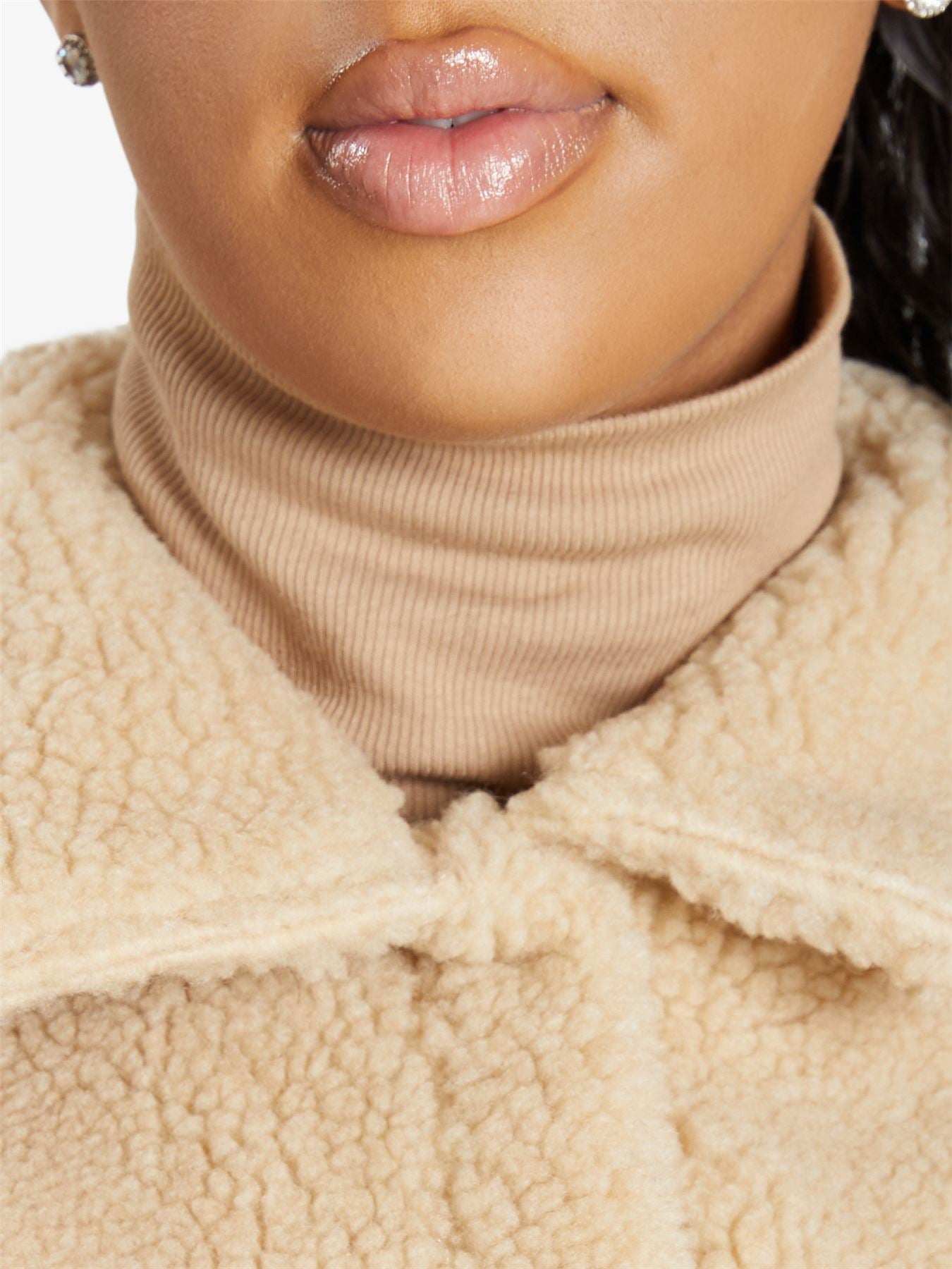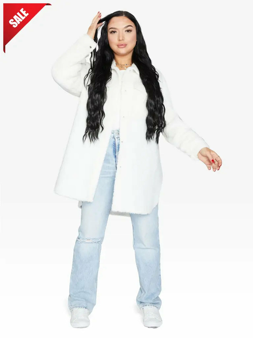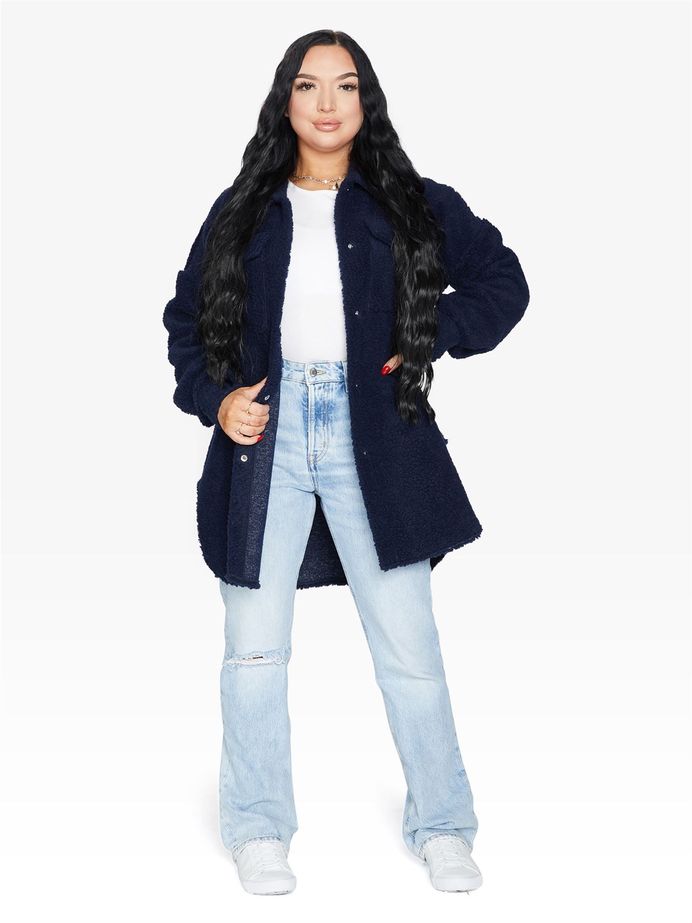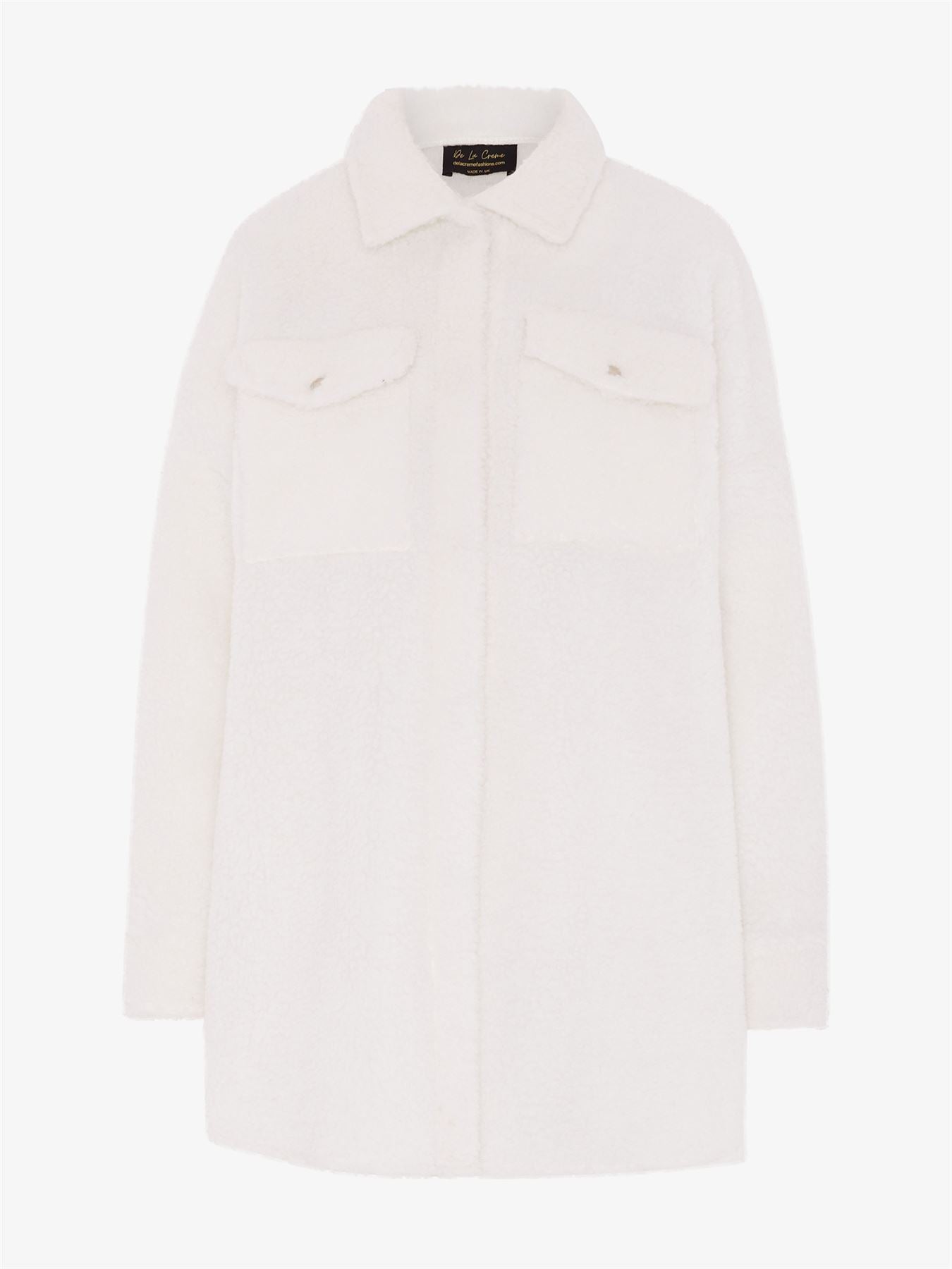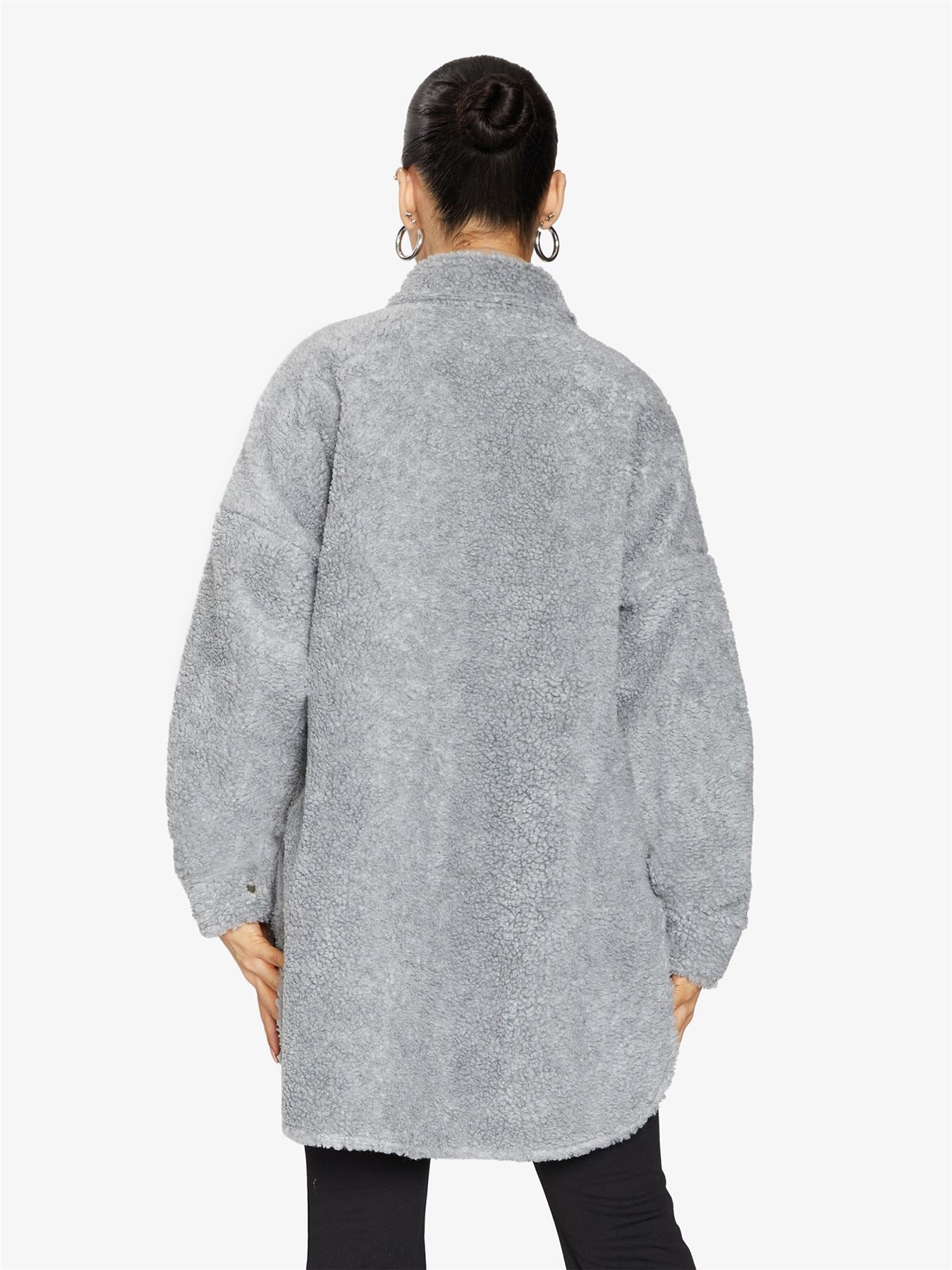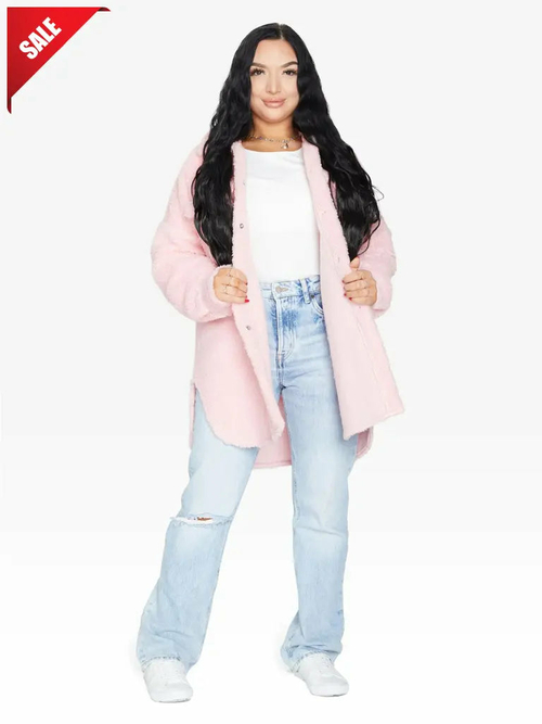 Oversized Stud Button Borg Teddy Shacket in soft teddy material with stud buttons and storm flap pockets.