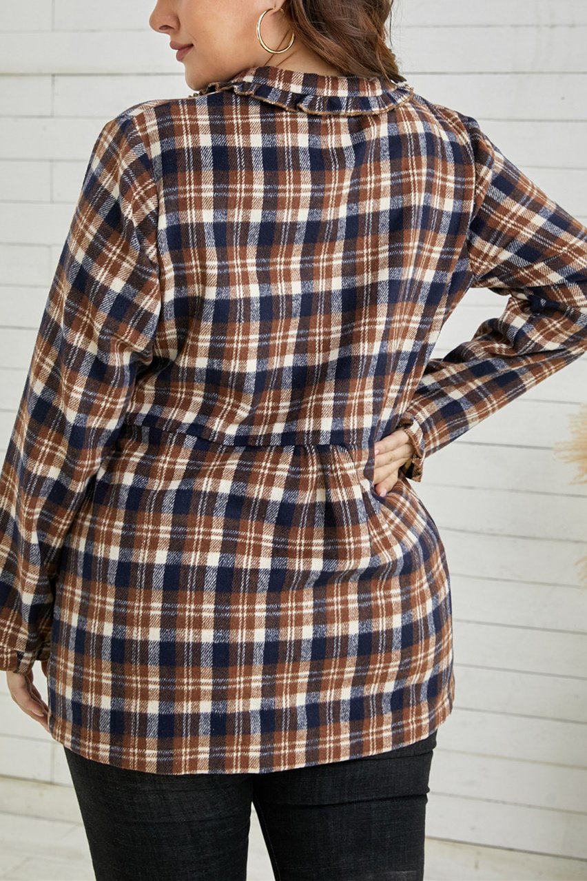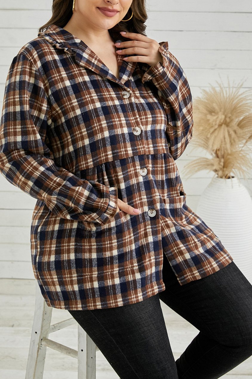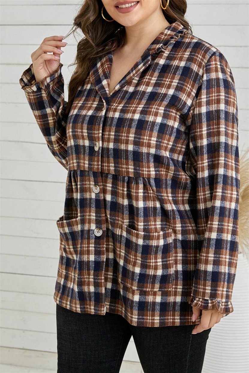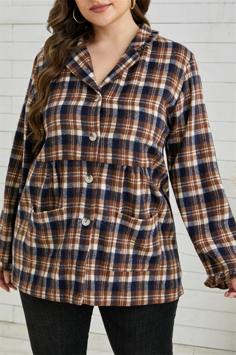 A stylish plaid print plus size coat with full sleeves and a turn-down collar, featuring functional pockets.
