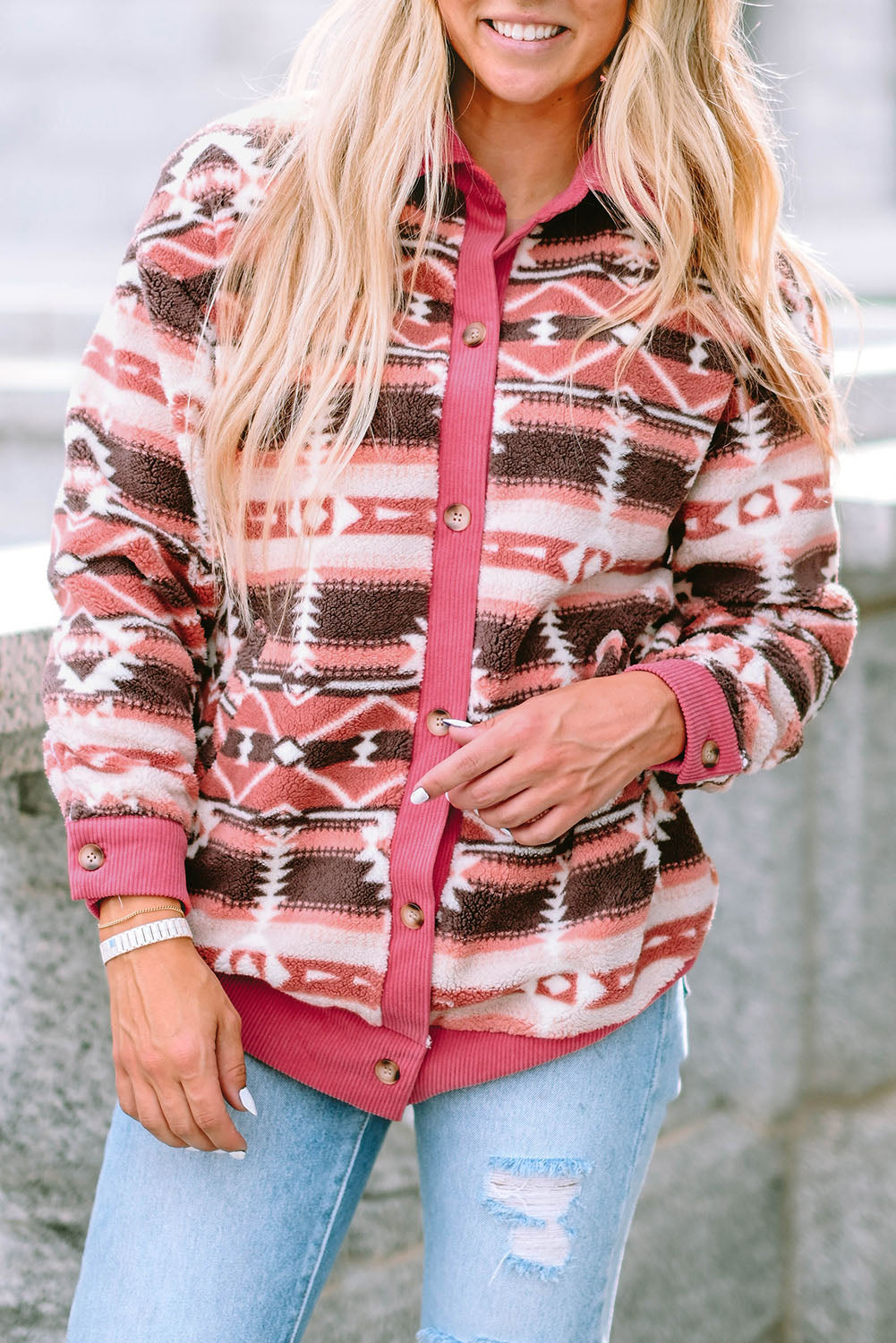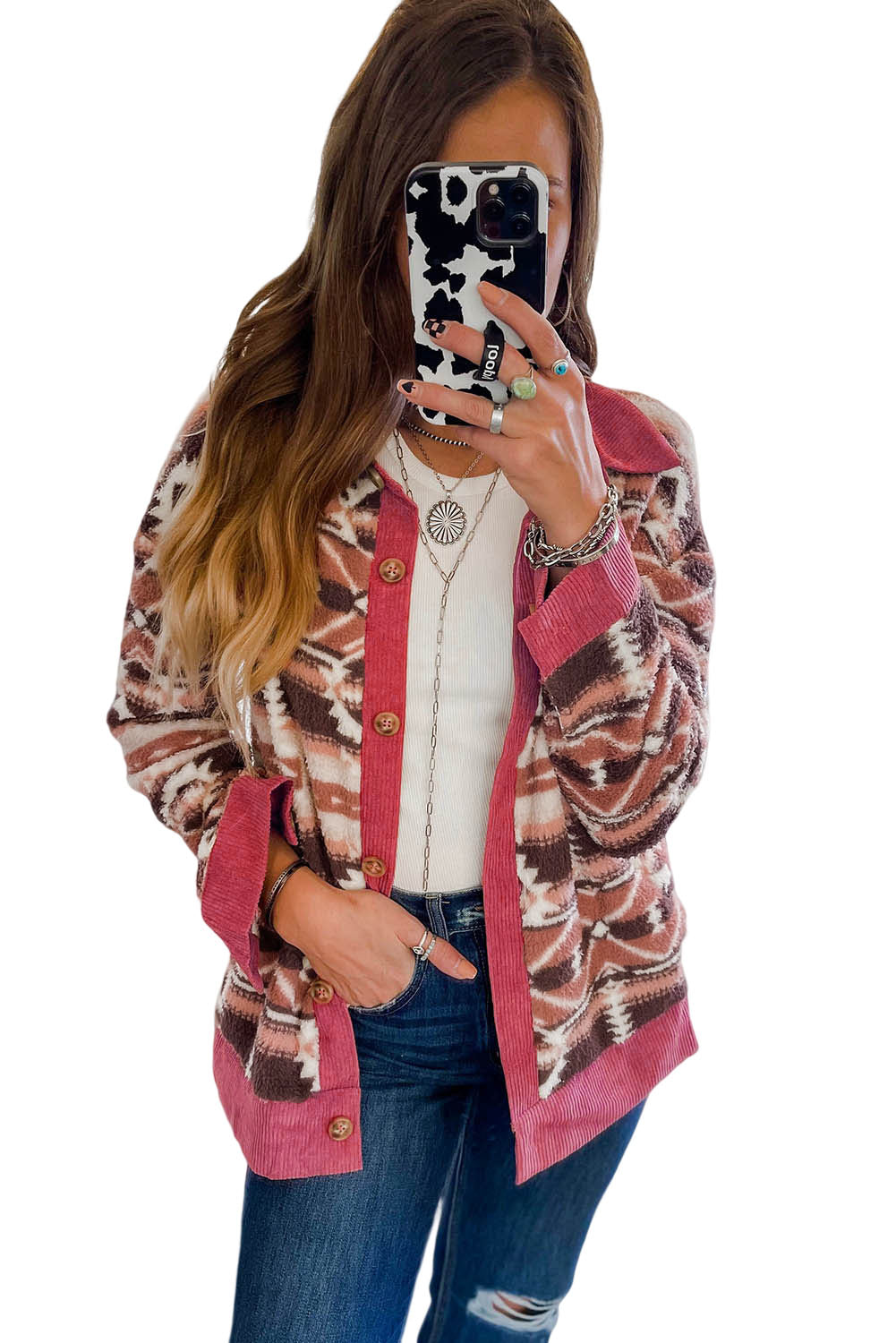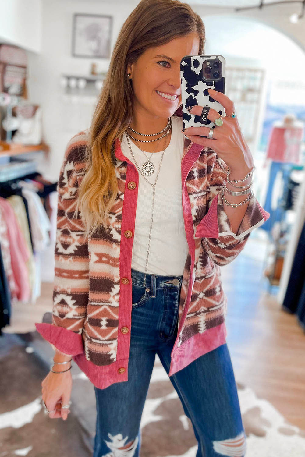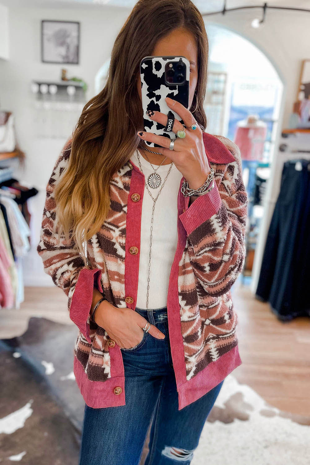 The Rose Western Sherpa Corduroy Trim Jacket is the perfect blend of style and comfort, designed to keep you warm during the colder months. This jacket features a luxurious sherpa plush lining that provides ultimate coziness, making it an essential addition to your winter wardrobe. The button-up design allows for easy wear, ensuring you can slip it on quickly when heading out. Whether you're running errands or enjoying a casual outing, this jacket will keep you looking fashionable while feeling comfortable.