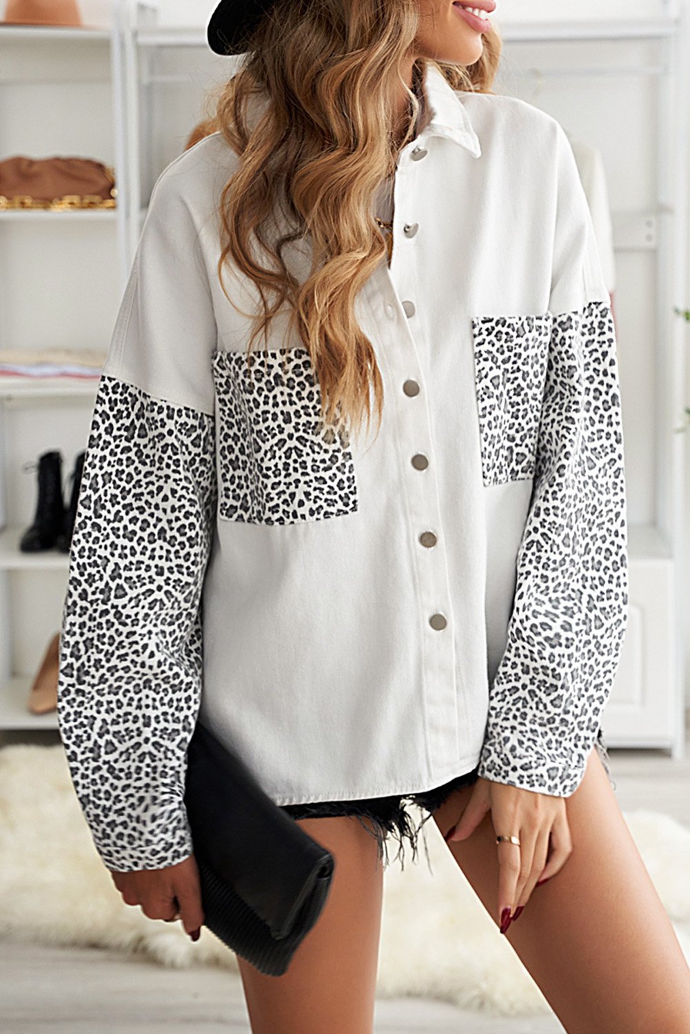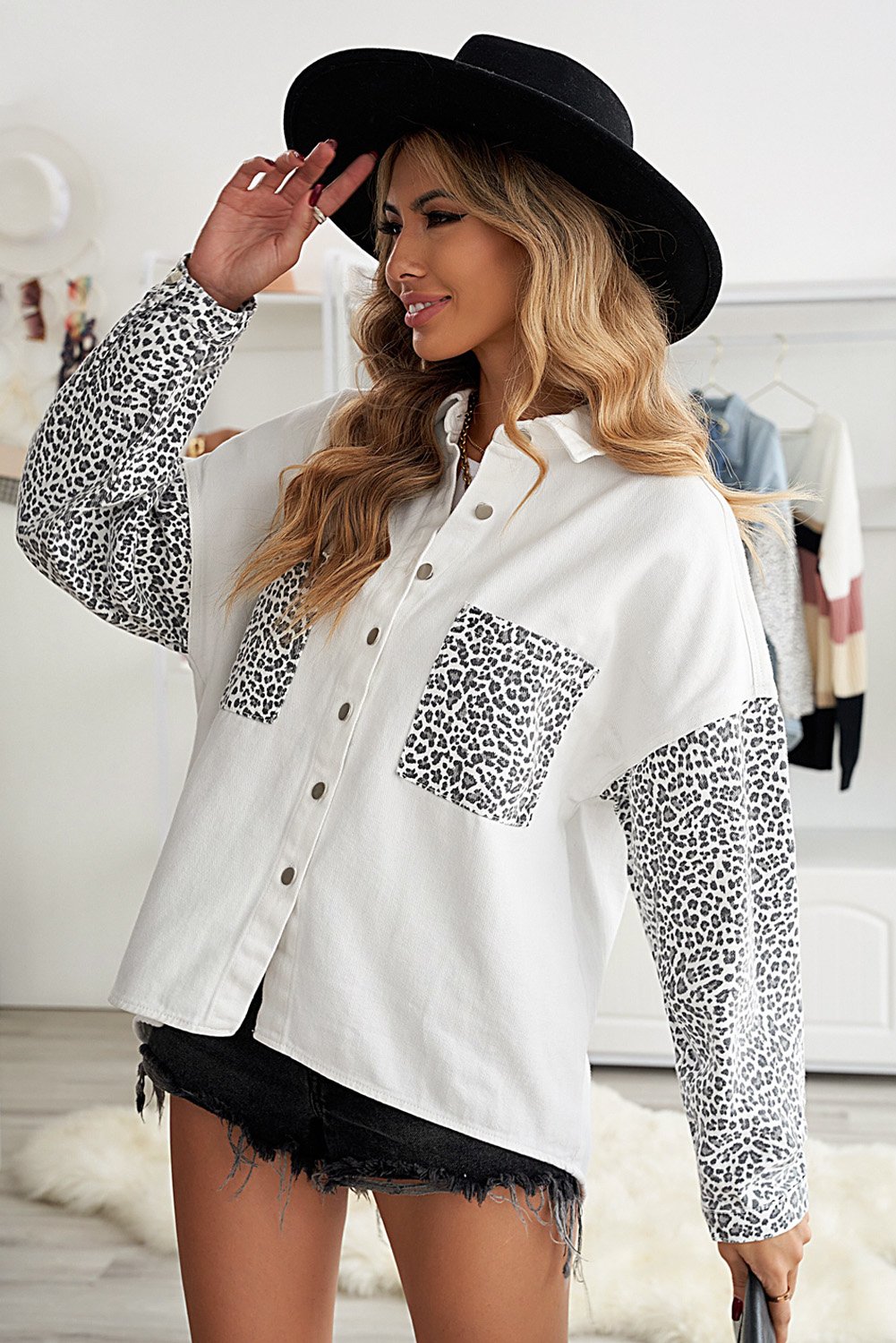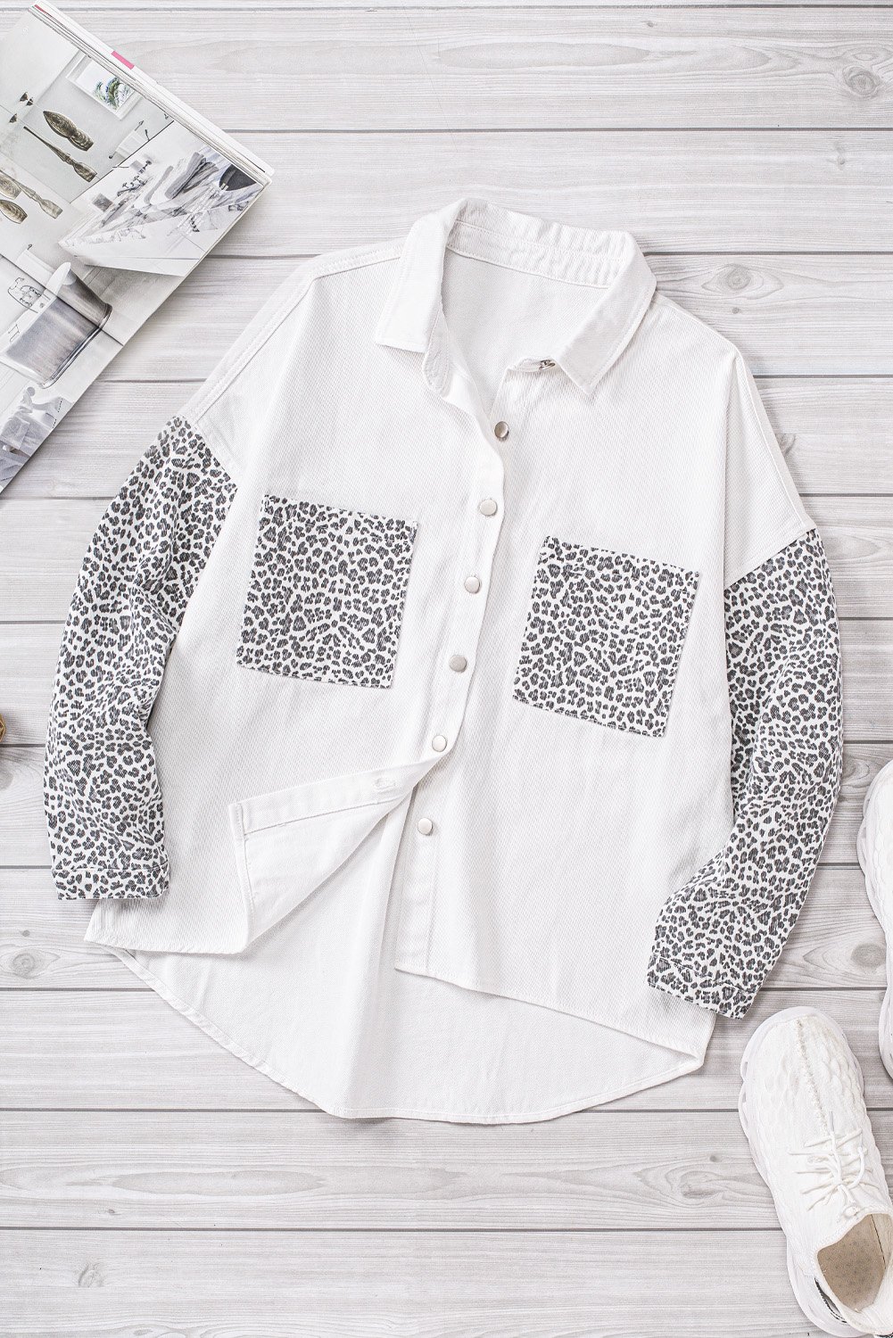 Crafted from a high-quality blend of 83% cotton and 17% polyester, the White Jeans Shirt Jacket offers both durability and comfort. The light wash denim provides a fresh look, while the contrast leopard sleeves bring a bold statement to your outfit. The turn-down collar adds a classic touch, making it suitable for various occasions.