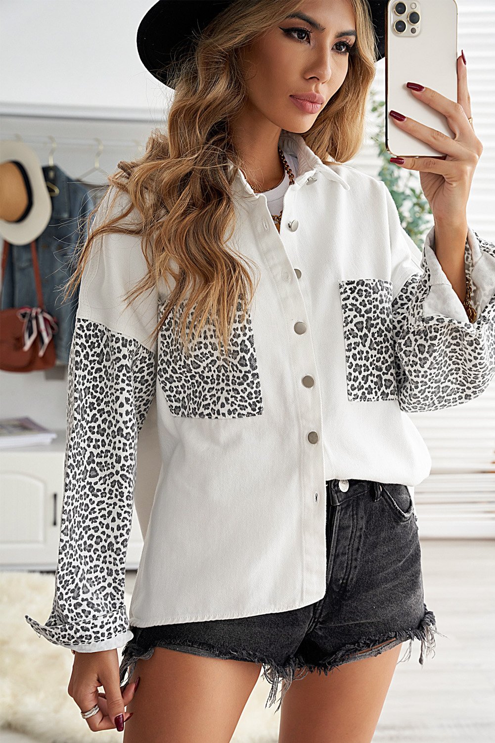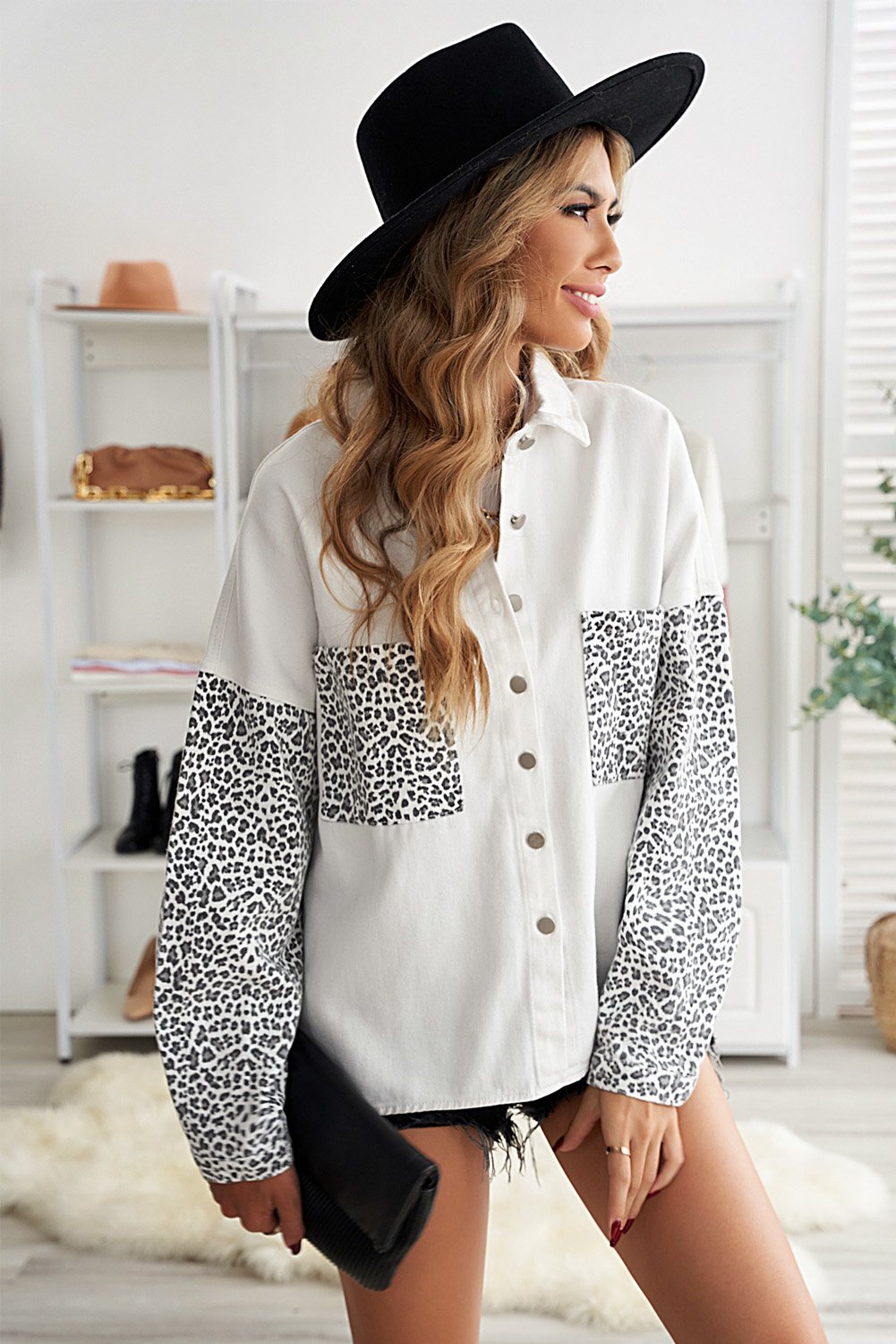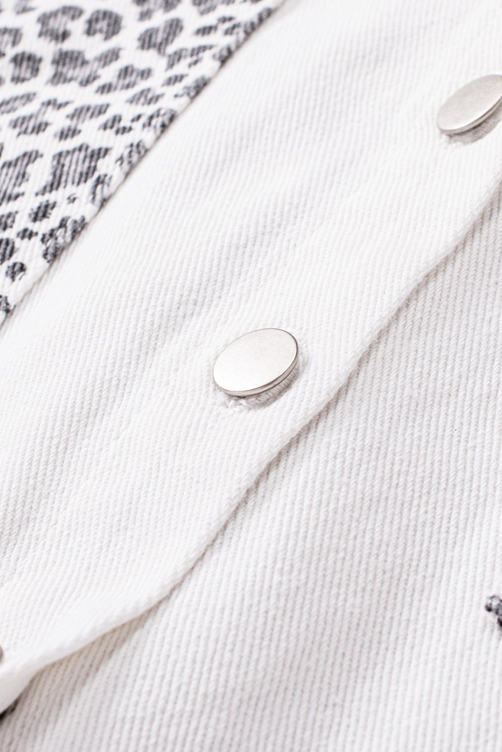 Crafted from a high-quality blend of 83% cotton and 17% polyester, the White Jeans Shirt Jacket offers both durability and comfort. The light wash denim provides a fresh look, while the contrast leopard sleeves bring a bold statement to your outfit. The turn-down collar adds a classic touch, making it suitable for various occasions.