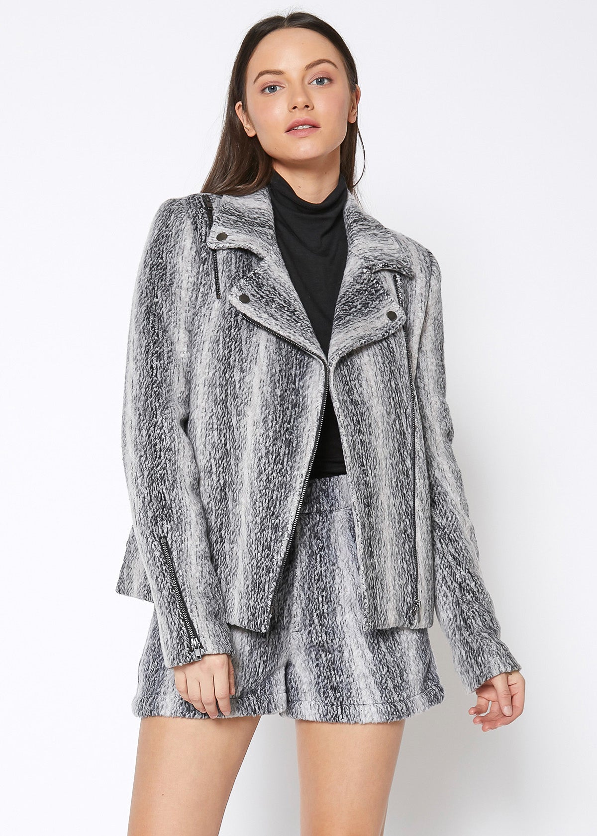 Introducing the Women's Brushed Wool Moto Jacket, a perfect blend of style and comfort designed for the modern woman. This jacket is crafted from a high-quality brushed wool blend, ensuring warmth and durability while maintaining a chic appearance. The unique stripe design adds a fashionable twist, making it an ideal choice for both casual outings and more formal occasions.