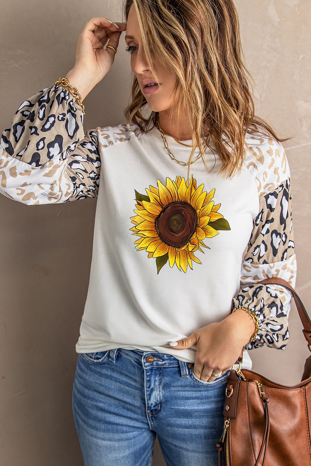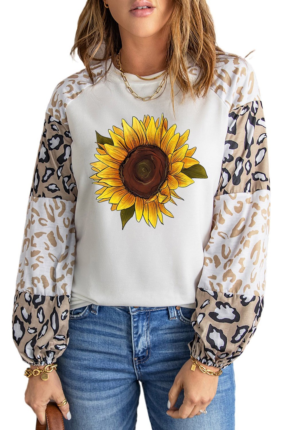 Introducing the Sunflower Graphic Animal Top, a must-have addition to your wardrobe for the spring and autumn seasons. This stylish long sleeve top features a unique combination of sunflower and leopard prints, making it a standout piece that captures attention. Designed with a casual aesthetic, it is perfect for various occasions, whether you're heading out for a coffee date, running errands, or enjoying a casual day out with friends. The top is made from high-quality materials that ensure comfort and durability, allowing you to wear it throughout the day without any discomfort. The full sleeves provide warmth, making it an ideal choice for cooler days, while the loose pullover silhouette offers a relaxed fit that flatters all body types. The bubble sleeves add a trendy touch, keeping you in style while ensuring you feel comfortable. The Sunflower Graphic Animal Top is available in a beautiful beige color, which complements the vibrant prints and makes it easy to pair with your favorite bottoms. Whether you choose to wear it with essential leggings for a laid-back look or dress it up with jeans for a more polished outfit, this top is versatile enough to suit your personal style. The o-neck neckline adds a classic touch, making it suitable for both casual and semi-formal occasions. With sizes ranging from S to 2XL, this top caters to a variety of body shapes, ensuring that everyone can enjoy its stylish design. The product measurements are as follows: Small (Bust 36.6 in, Sleeve 26.8 in, Length 27.2 in, Hem Width 42.1 in), Medium (Bust 38.6 in, Sleeve 27.2 in, Length 28 in, Hem Width 44.1 in), Large (Bust 40.6 in, Sleeve 28 in, Length 28.7 in, Hem Width 46.1 in), XL (Bust 43.7 in, Sleeve 28.7 in, Length 29.5 in, Hem Width 49.2 in), and 2XL (Bust 46.9 in, Sleeve 29.5 in, Length 30.3 in, Hem Width 52.4 in). This top is not just a piece of clothing; it's a statement that showcases your unique style and personality. Wearing the Sunflower Graphic Animal Top will surely capture the envy of everyone around you, making it a perfect choice for those who love to stand out. Don't miss out on this fashionable top that combines comfort, style, and versatility. Add the Sunflower Graphic Animal Top to your collection today and elevate your wardrobe with this trendy piece that is sure to become a favorite.
