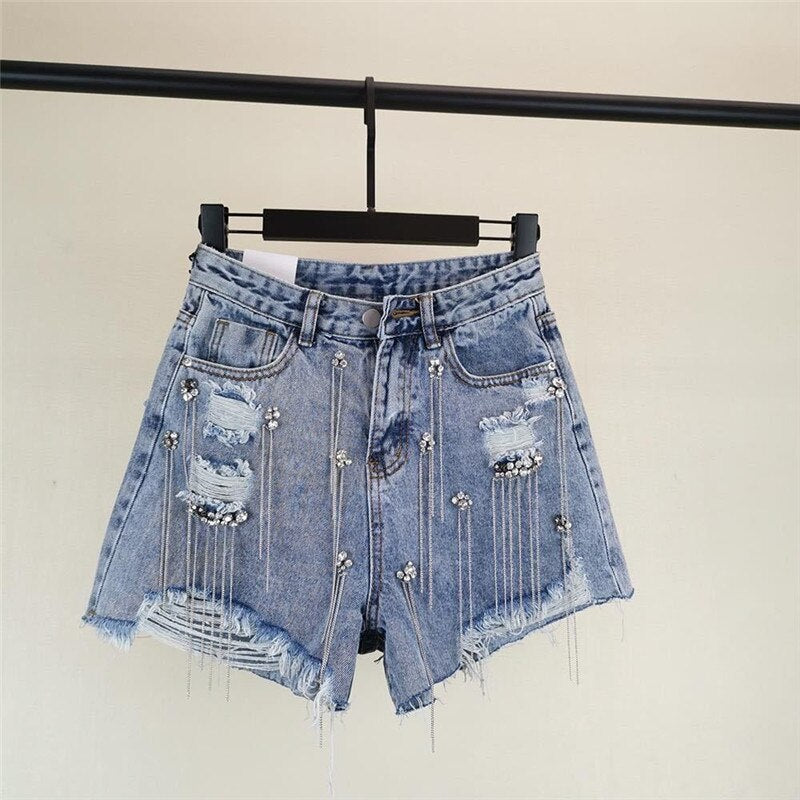 Introducing the Women Luxurious Tassel Rhinestone Fringed Hole Jeans Shorts, a must-have addition to your summer wardrobe. Designed for women aged 18-35, these shorts combine style and comfort, making them perfect for casual outings, beach days, or summer parties. Crafted from a high-quality cotton and polyester blend, these shorts offer breathability and durability, ensuring you stay comfortable all day long. The high waist design not only enhances your figure but also provides a trendy look that pairs well with various tops, from crop tops to casual tees. The skinny fit accentuates your legs, giving you a sleek and stylish silhouette. One of the standout features of these shorts is the luxurious tassel and rhinestone decoration, which adds a touch of glamour and uniqueness to your outfit. Whether you're dressing up for a night out or keeping it casual during the day, these shorts are versatile enough to suit any occasion. The solid pattern allows for easy mixing and matching with your existing wardrobe, making them a practical choice for fashion-forward women. The zipper fly closure ensures a secure fit, while the regular pant style provides ease of movement. Available in various sizes, it's essential to refer to the size chart to find your perfect fit. Please note that the sizing may differ from standard US sizes, as these are based on Chinese sizing. If you're unsure about your size, feel free to reach out for assistance. Additionally, due to manual measurement, a slight variation of 2CM-4CM may occur. The shorts are designed to be stylish yet comfortable, making them ideal for warm weather. Pair them with sandals or sneakers for a laid-back look, or dress them up with heels for a night out. The tassel and rhinestone details are not just for show; they catch the light beautifully, making you stand out in any crowd. These shorts are perfect for those who love to express their individuality through fashion. With their trendy design and luxurious details, they are sure to become a staple in your summer wardrobe. Don't miss out on the chance to own these stylish shorts that combine comfort, elegance, and a touch of fun. Order your Women Luxurious Tassel Rhinestone Fringed Hole Jeans Shorts today and step out in style this summer!