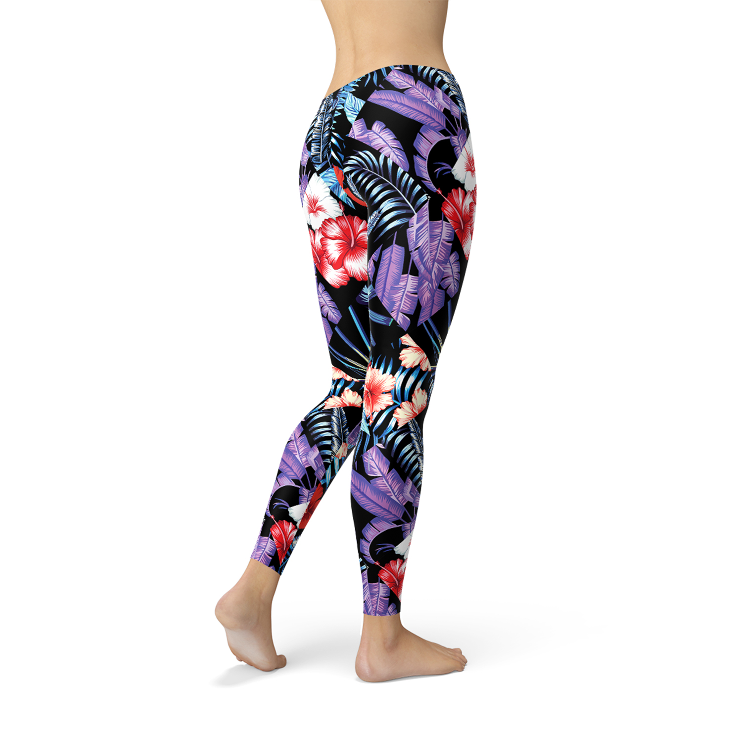 A pair of women's Geometric Tropical Floral Leggings featuring vibrant colors and a unique floral design, perfect for workouts and casual wear.