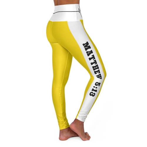 Introducing our High Waisted Yoga Leggings in a stunning Gold Yellow shade, inspired by the essence of Matthew 5:13, which reminds us to be the light of the world. These leggings are not just a piece of clothing; they are a statement of style, comfort, and functionality. Crafted with high-tech breathable fabric, these leggings are designed to move with your body, providing the ultimate comfort during your yoga sessions, workouts, or casual outings.