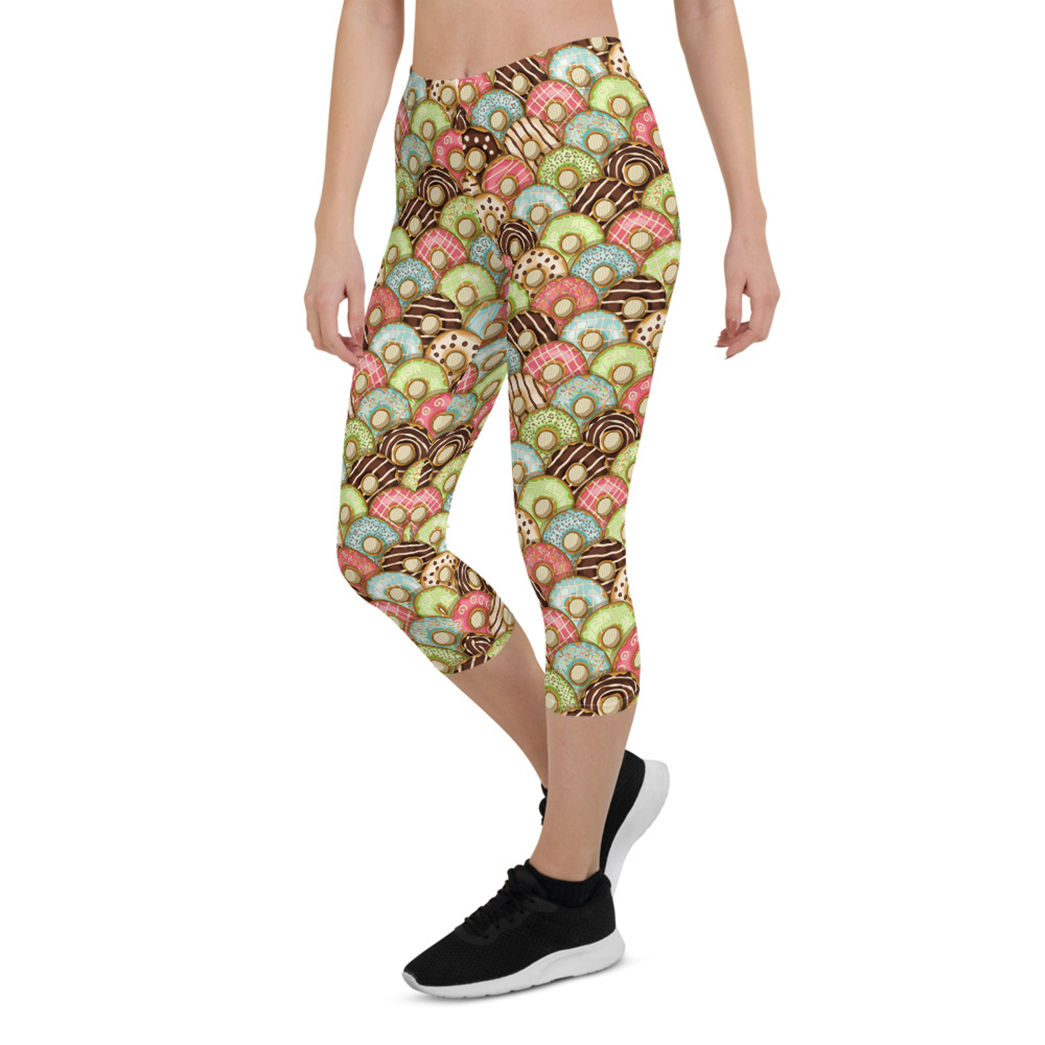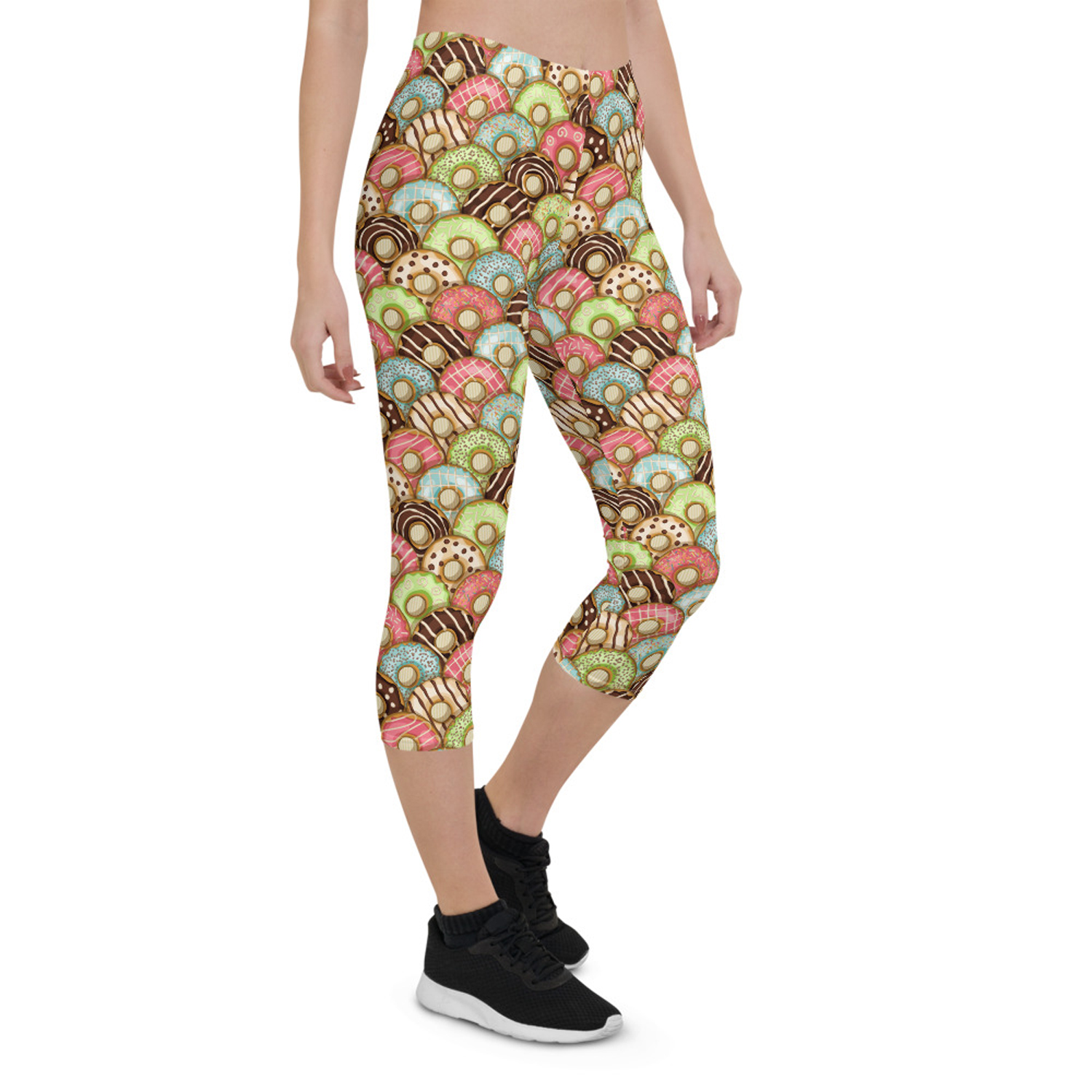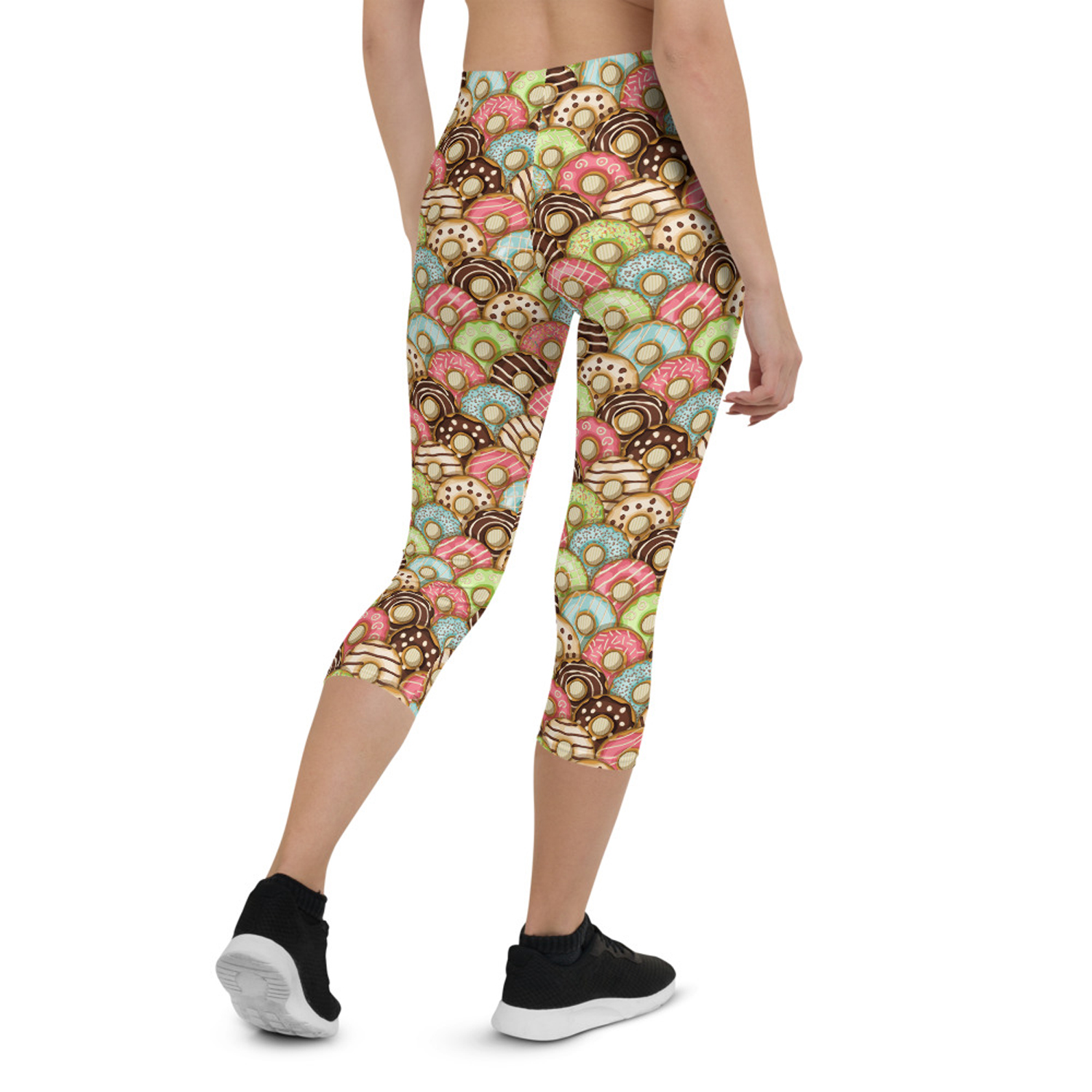 Women's Donuts Capri Leggings featuring colorful graphic designs and a comfortable fit, perfect for workouts and casual wear.