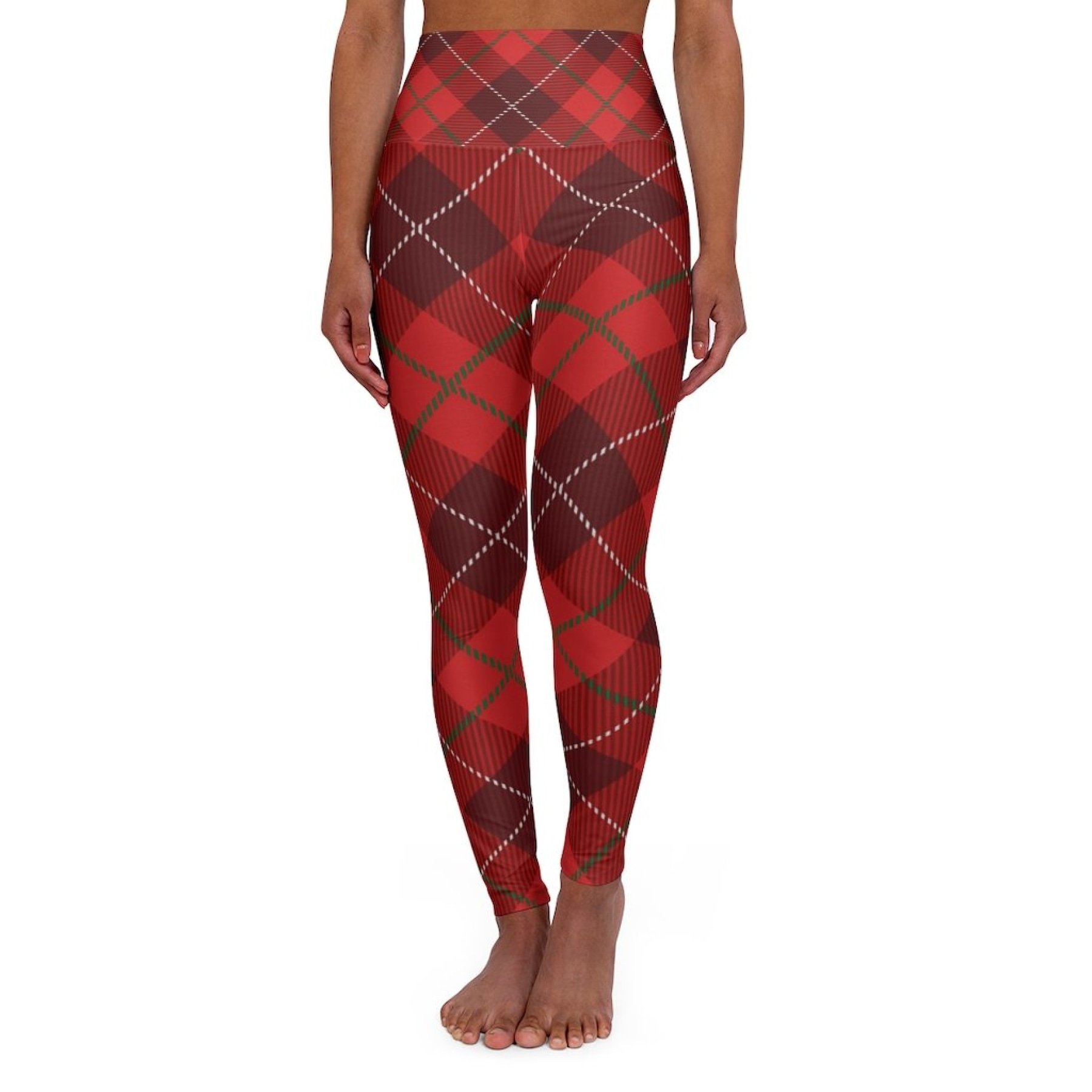 Women's high waist fitness leggings in red plaid, showcasing a stylish design and breathable fabric for workouts.