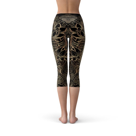 Womens Koi Fish Black Capri Leggings featuring a vibrant koi fish graphic design, made from high-performance stretchy fabric for comfort and style.